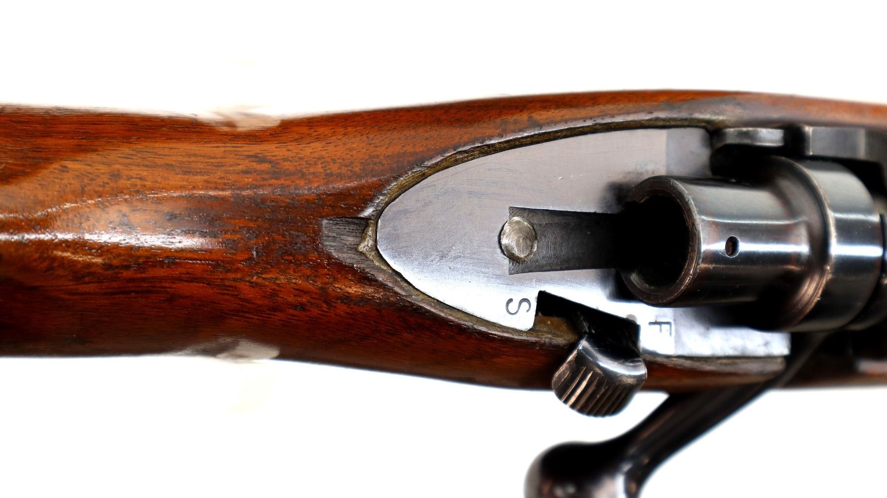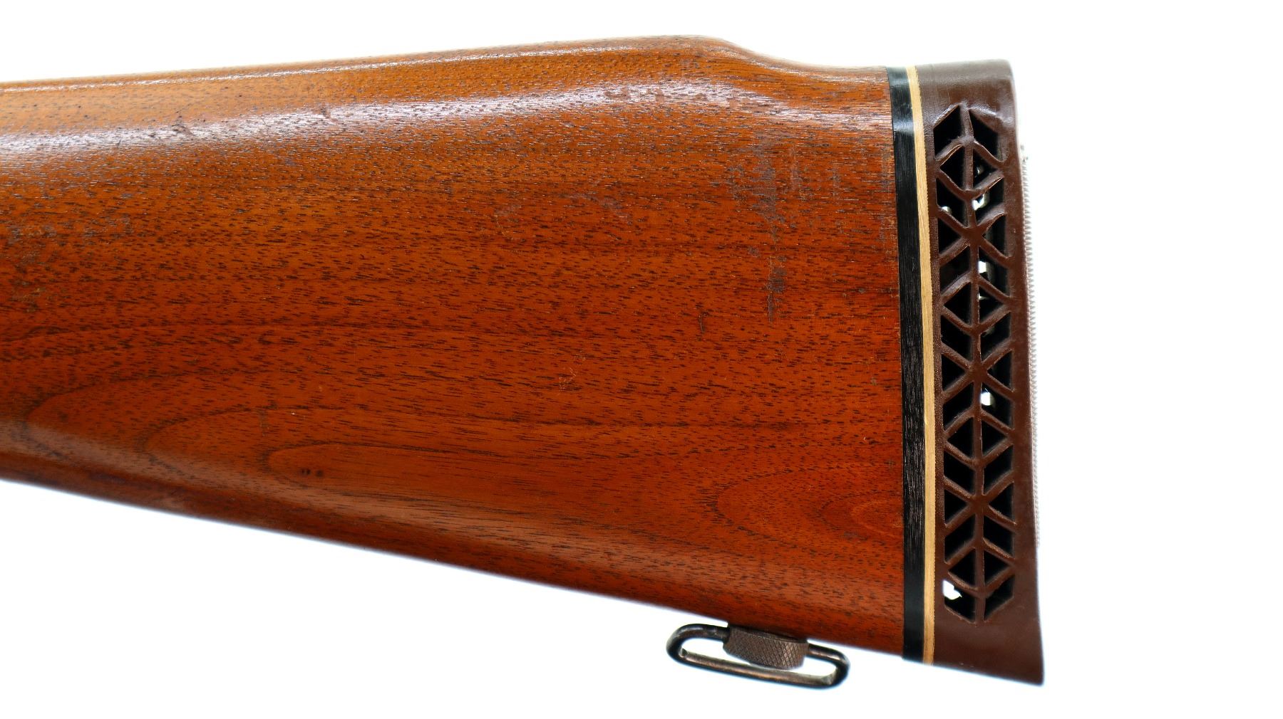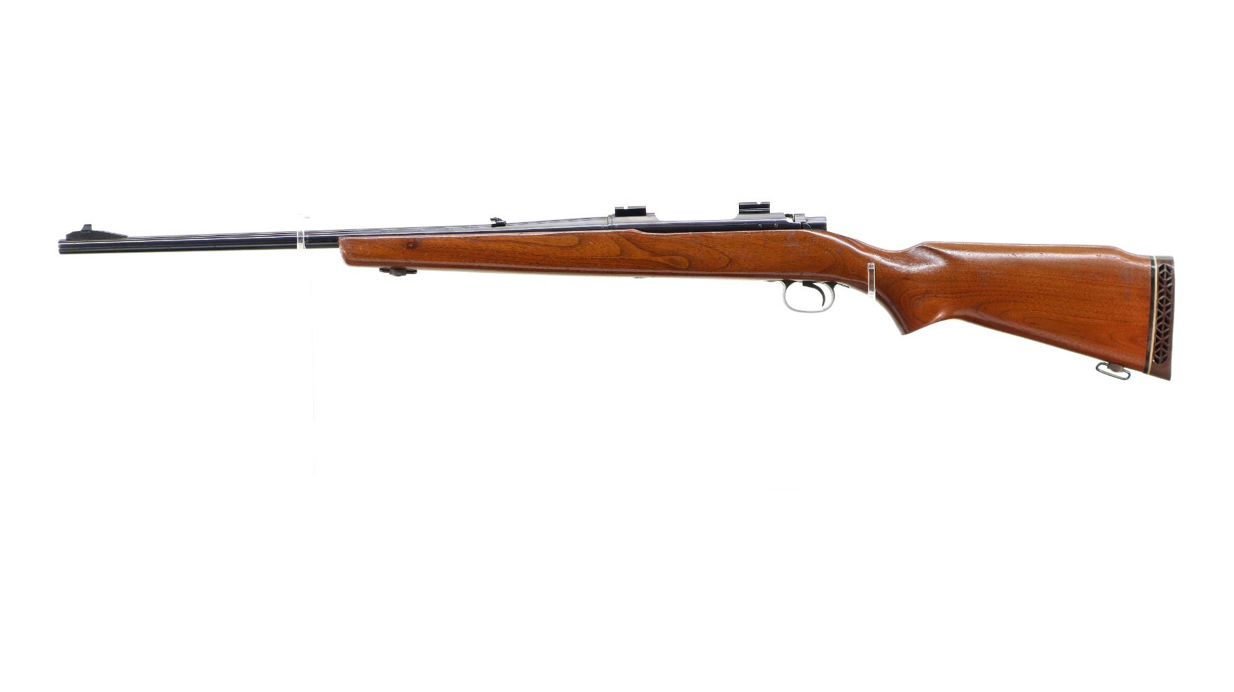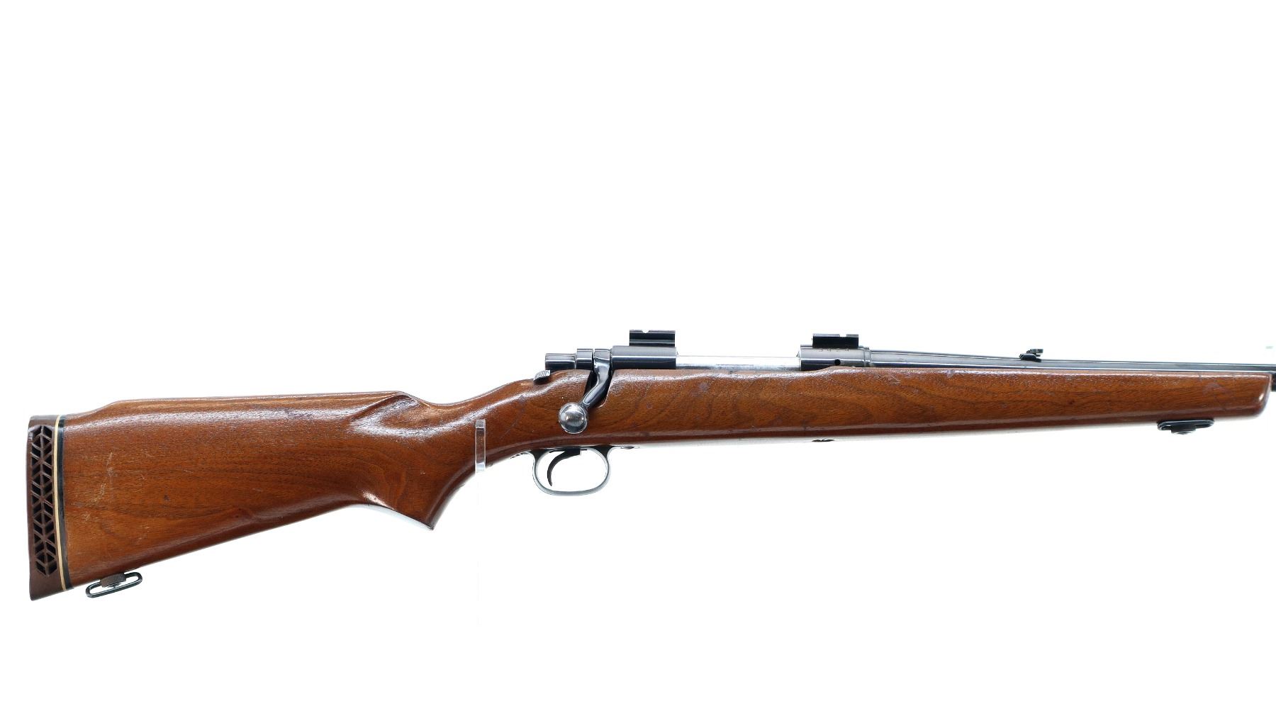 Main Description: Blade front sight with ramp, adjustable folding u notched rear sight, blued finish, receiver drilled and tapped with two piece bases installed, smooth bolt knob. One piece wood stock, pistol grip, small chip behind receiver, raised comb, brown vented rubber recoil pad, 13.5" LOP, blind magazine, sling swivels.