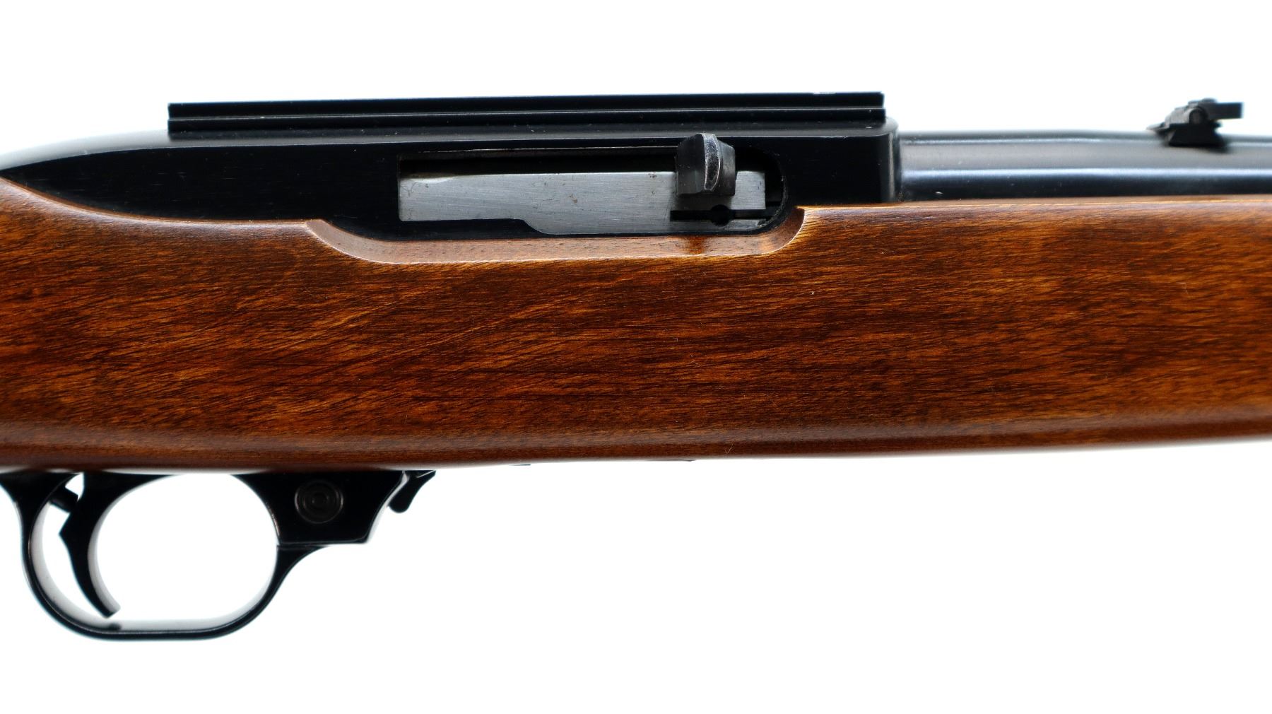 Main Description: Missing front sight blade ramp is present, adjustable folding u notched rear sight, blued barrel, black alloy receiver drilled and tapped with one piece rail installed. One piece wood stock, pistol grip, smooth curved black polymer butt plate, hole filled in behind barrel band.
