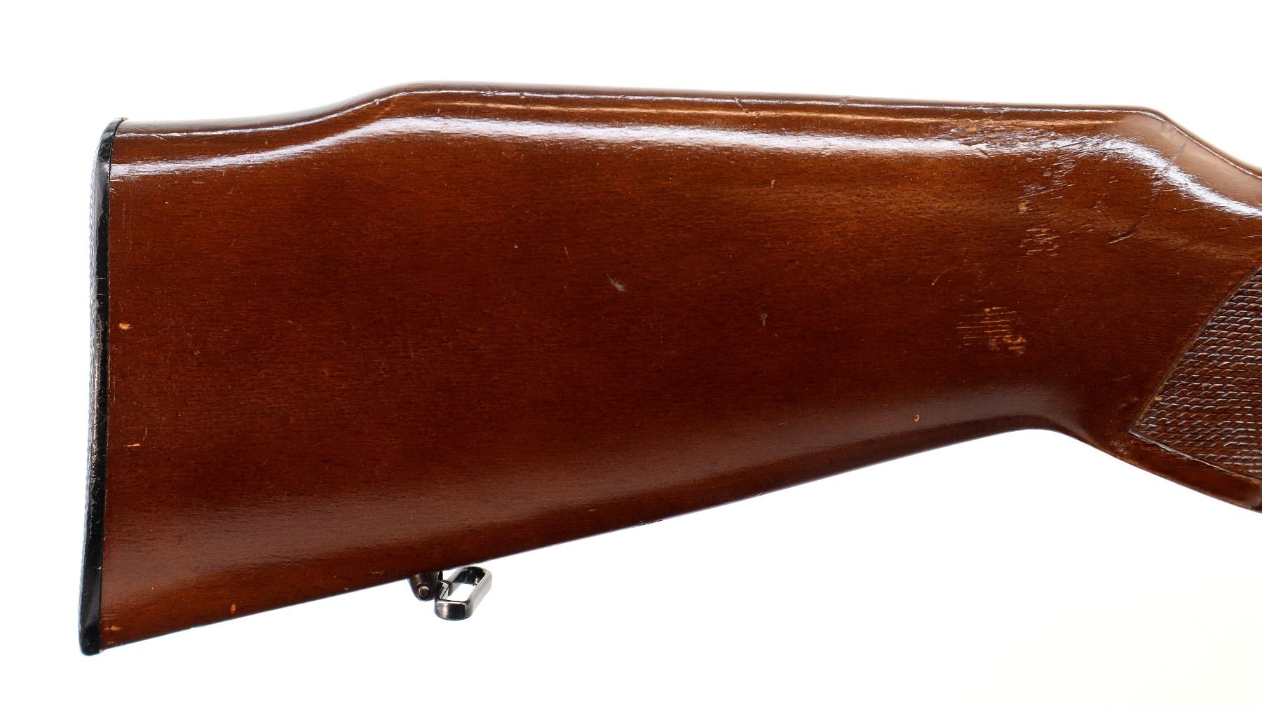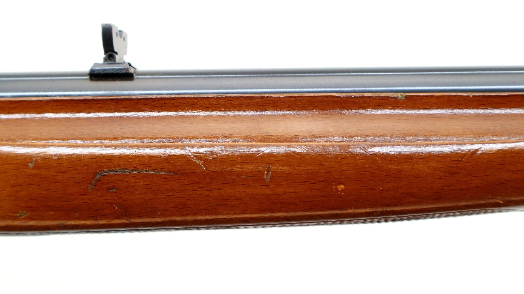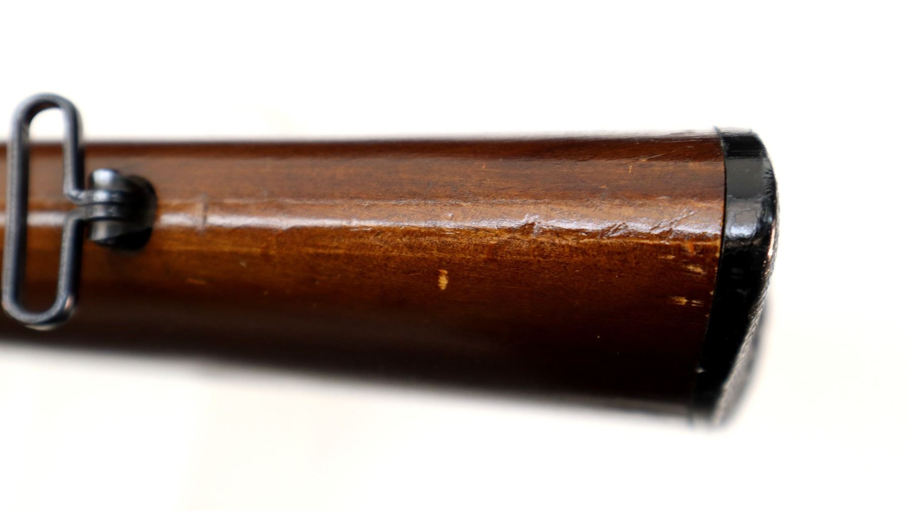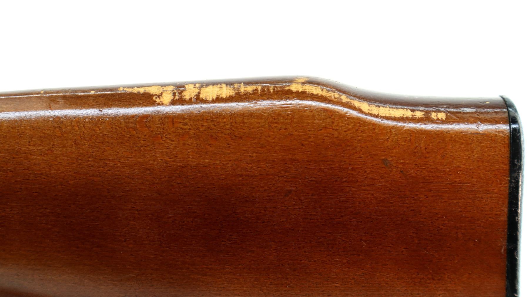 Main Description: Blade front sight with hood and ramp, adjustable folding u notched rear sight, blued barrel, grooved alloy receiver, note: cocking handle is loose and rotates, needs repair. Two piece wood stocks, finger grooved checkered forearm, pistol grip, black polymer butt plate, raised comb, sling swivels.