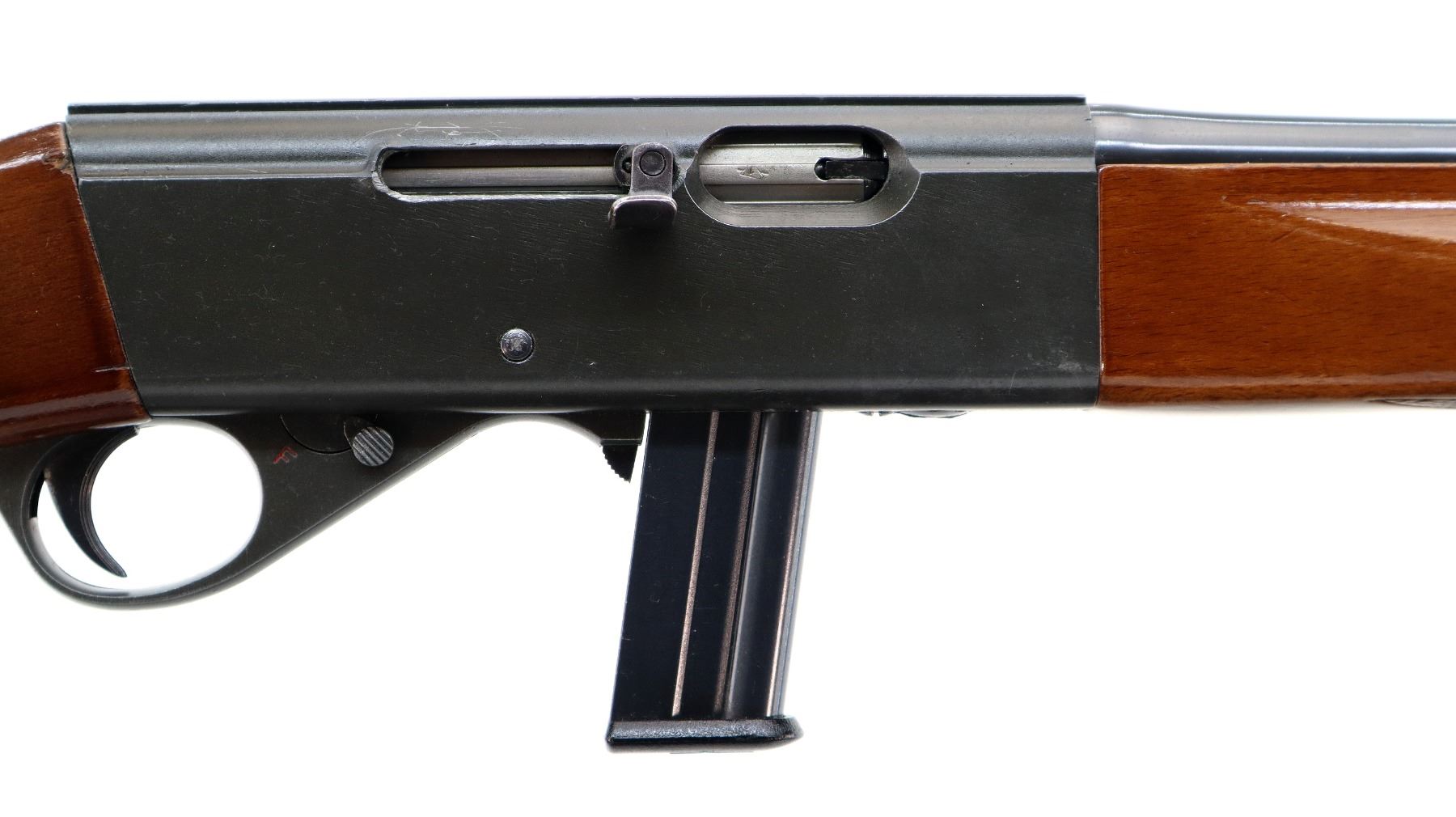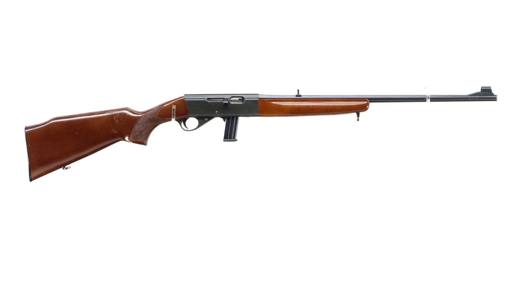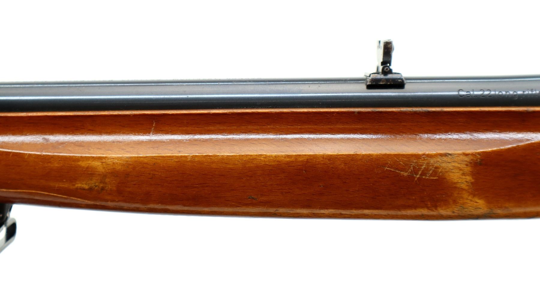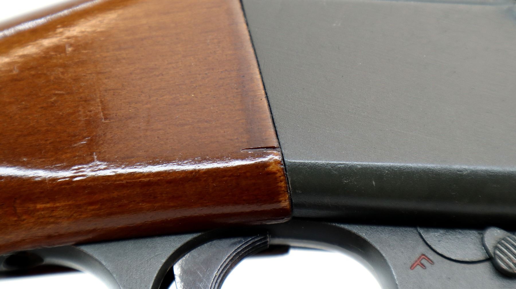 Main Description: Blade front sight with hood and ramp, adjustable folding u notched rear sight, blued barrel, grooved alloy receiver, note: cocking handle is loose and rotates, needs repair. Two piece wood stocks, finger grooved checkered forearm, pistol grip, black polymer butt plate, raised comb, sling swivels.