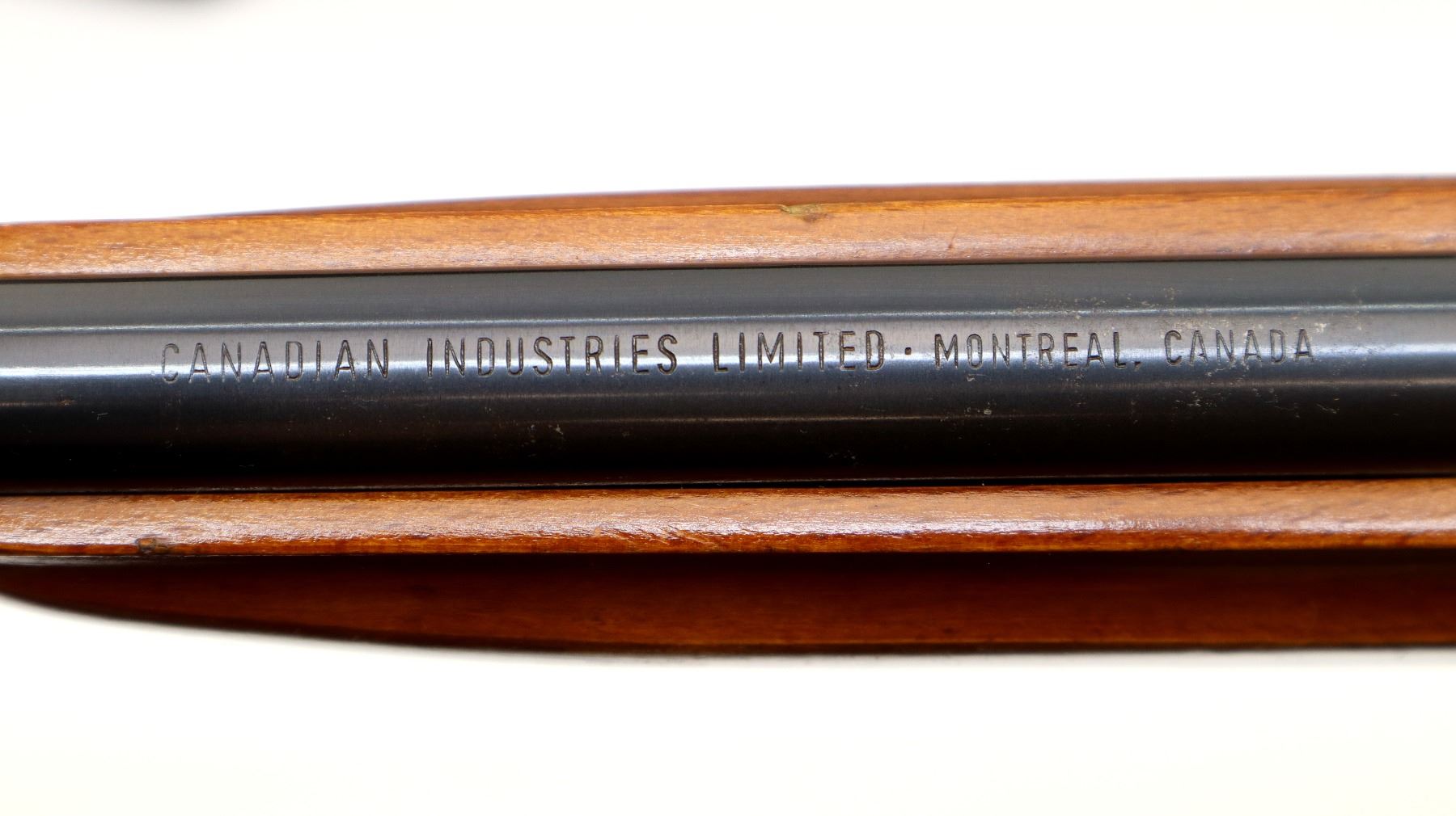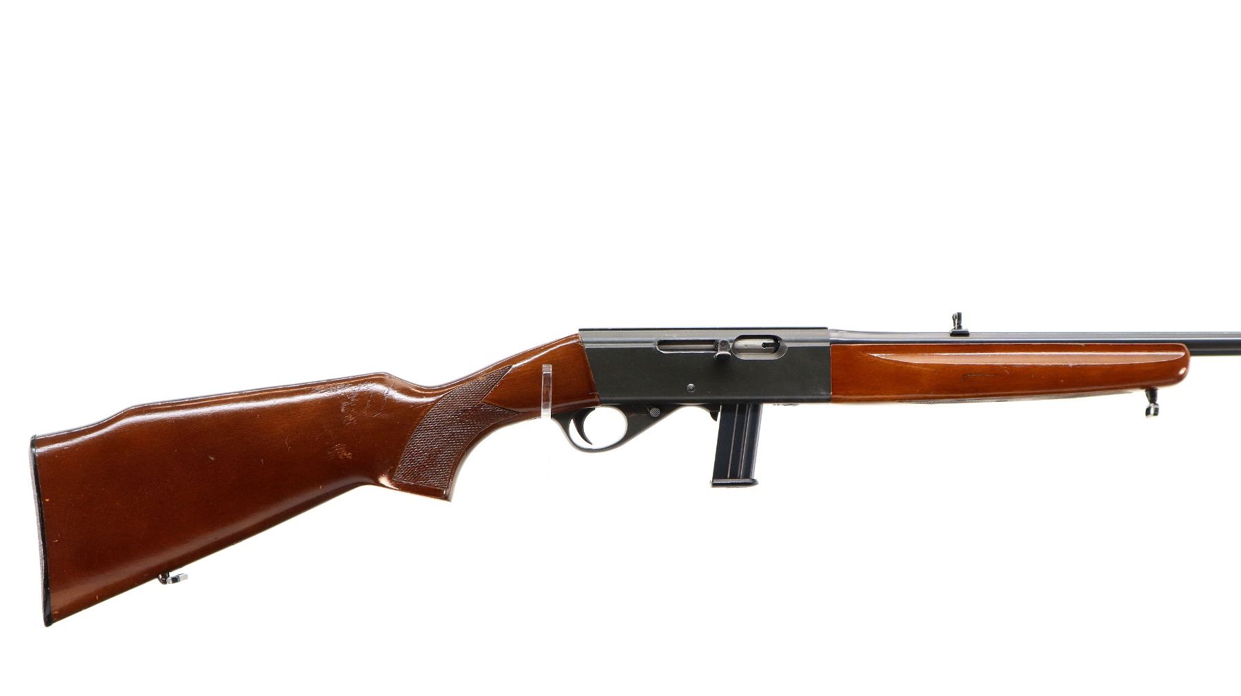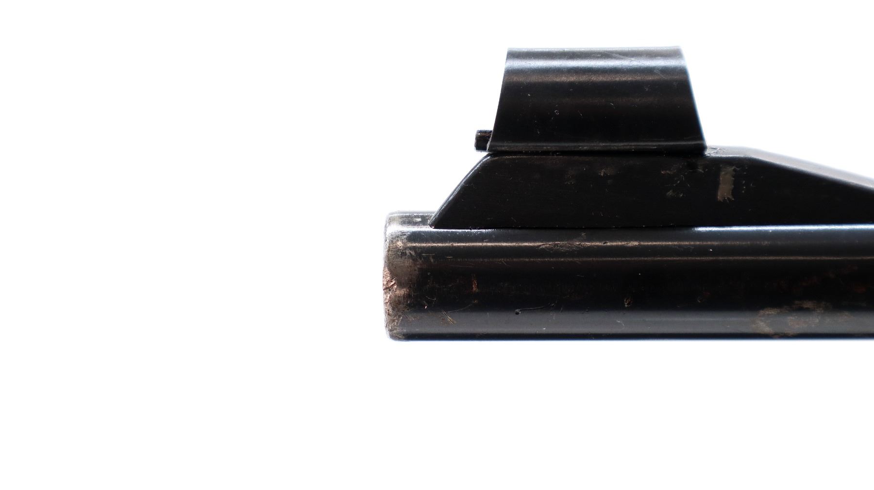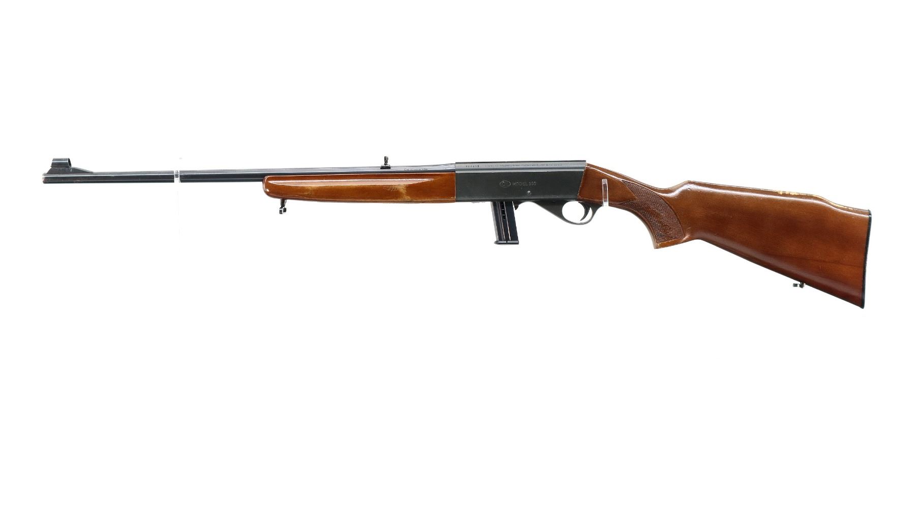Main Description: Blade front sight with hood and ramp, adjustable folding u notched rear sight, blued barrel, grooved alloy receiver, note: cocking handle is loose and rotates, needs repair. Two piece wood stocks, finger grooved checkered forearm, pistol grip, black polymer butt plate, raised comb, sling swivels.