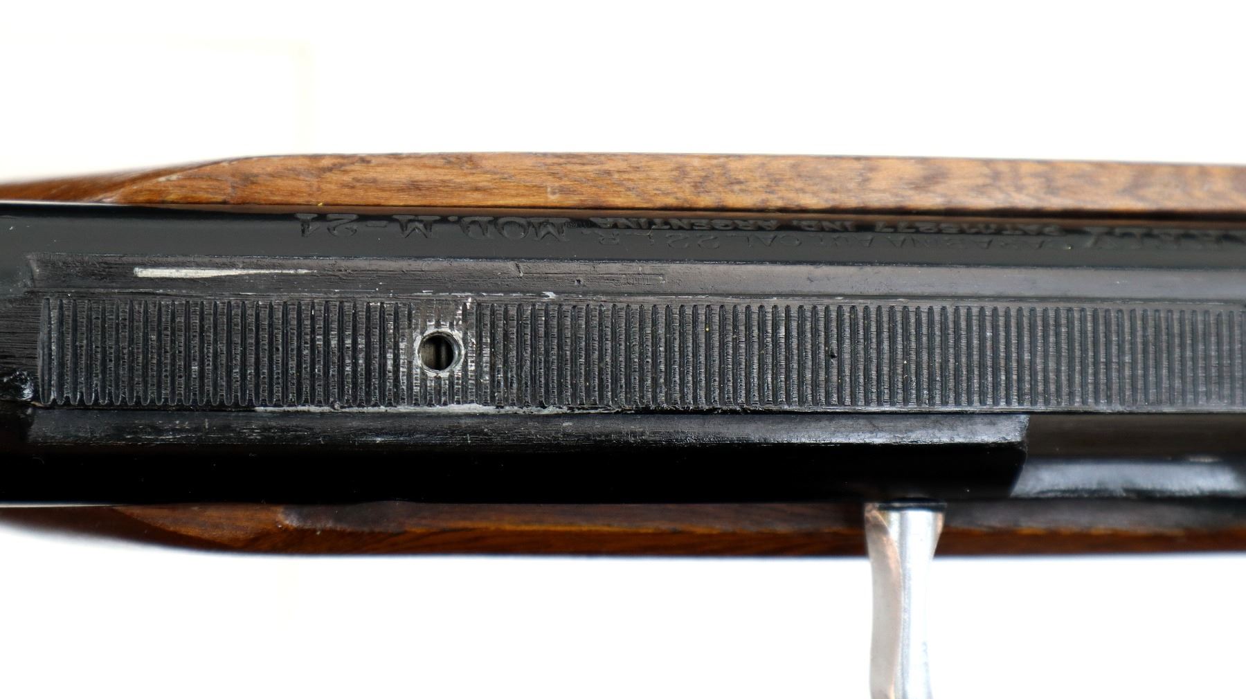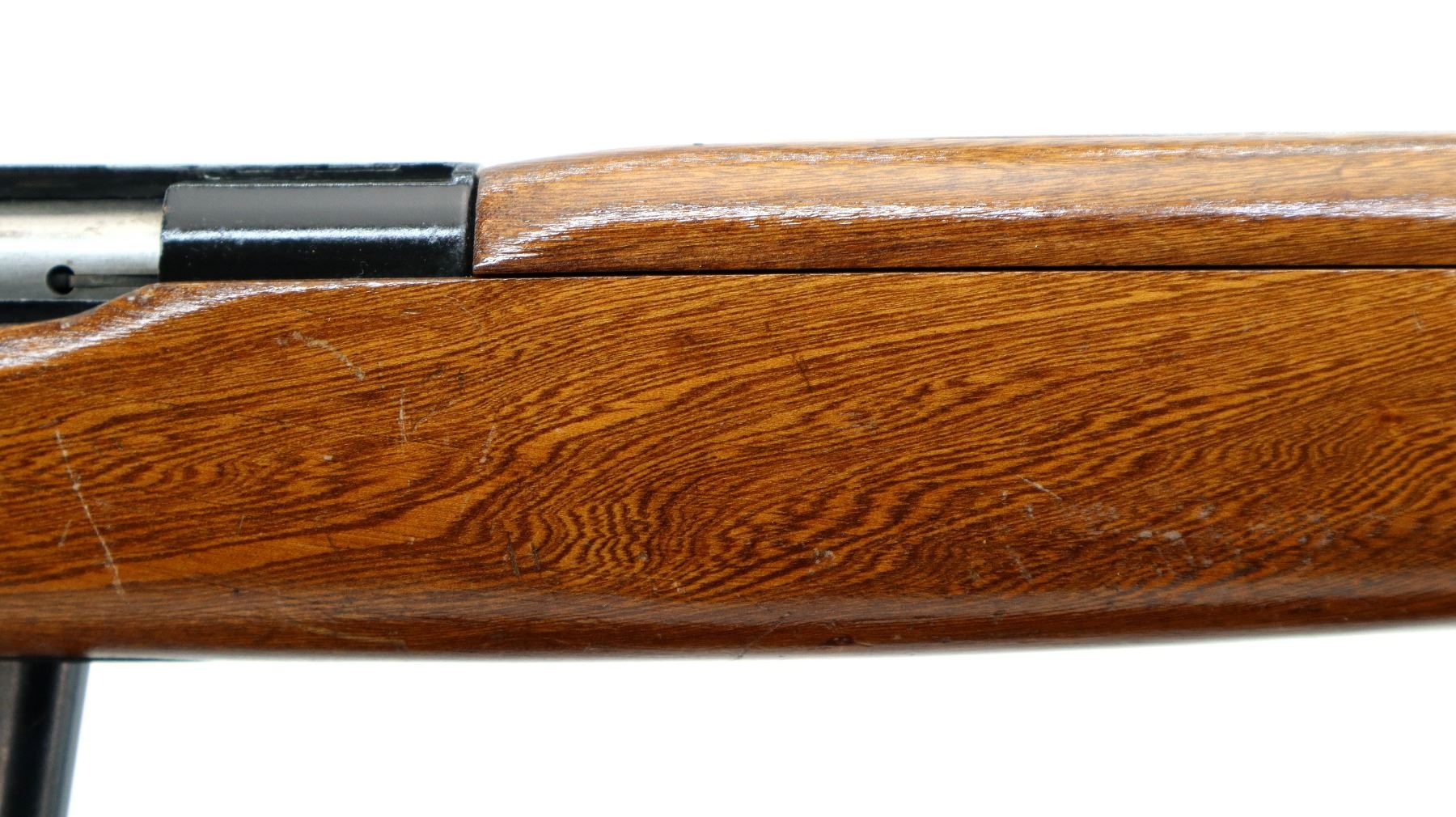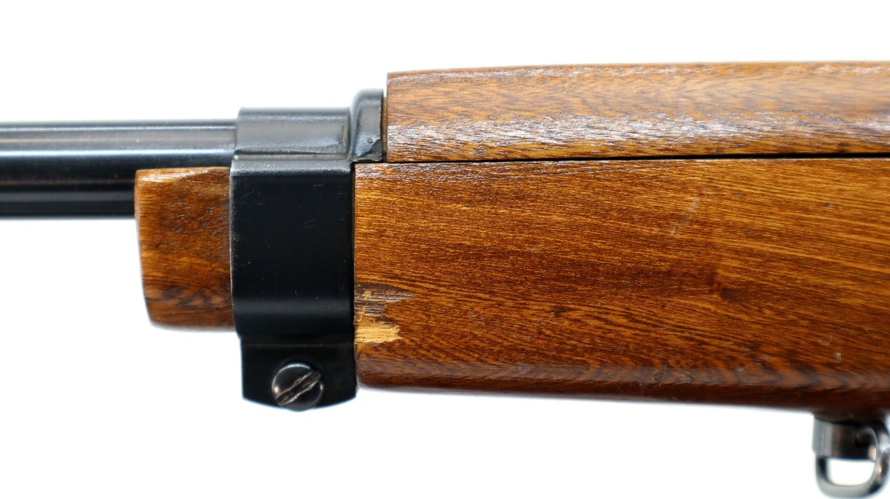 Main Description: Blade front sight with ears and ramp, missing rear sight threaded hole present, blued barrel, grooved black alloy receiver. Two piece wood stocks, handguard is modified at the rear, forend is chipped, pistol grip, grooved black polymer butt plate, 14.25" LOP, sling swivels.