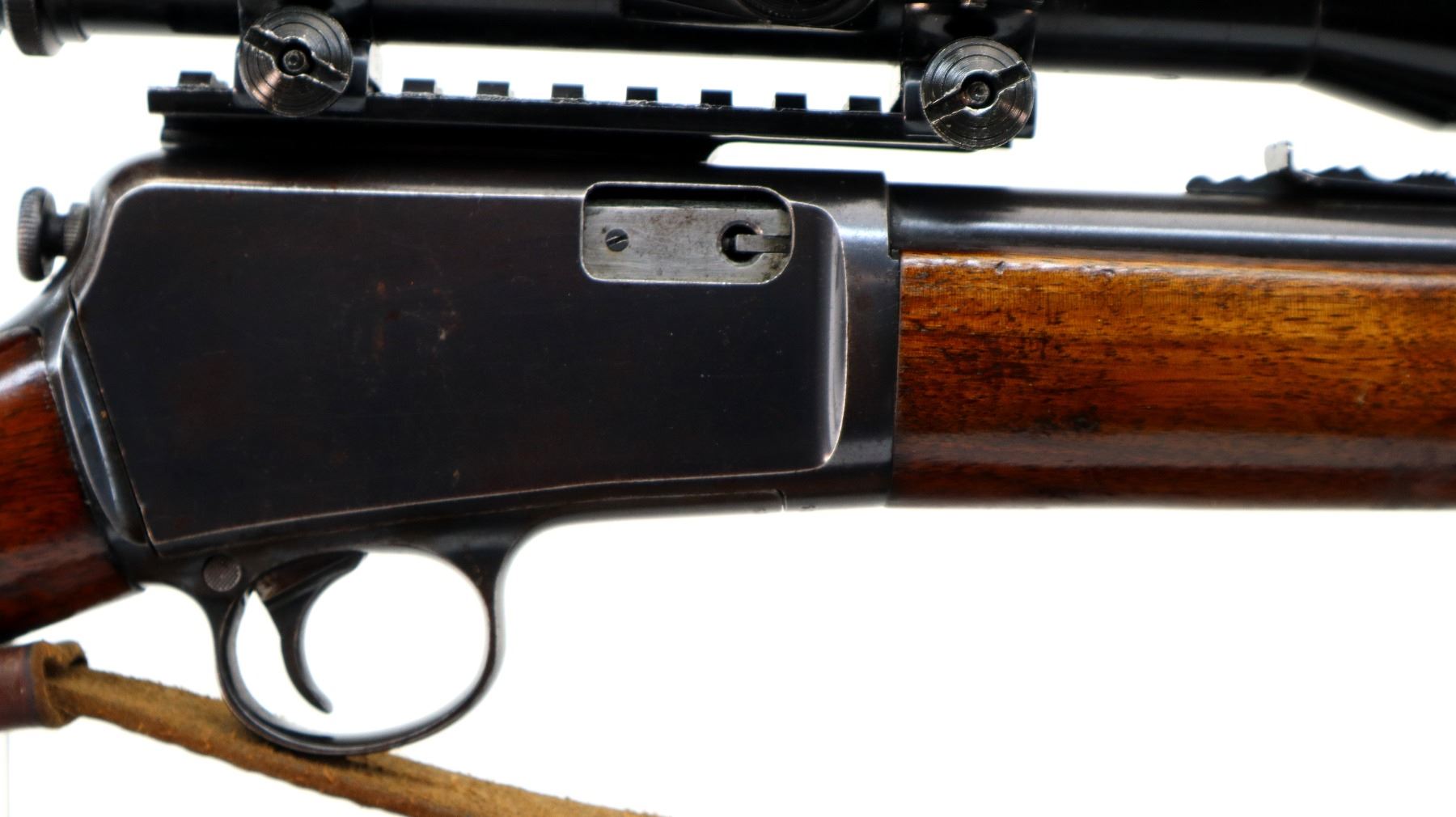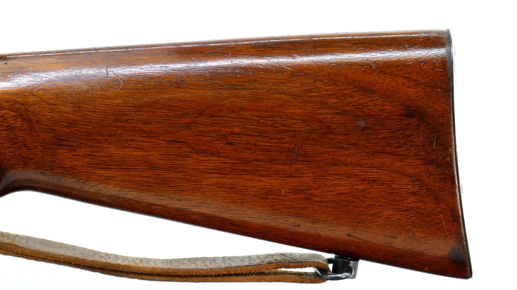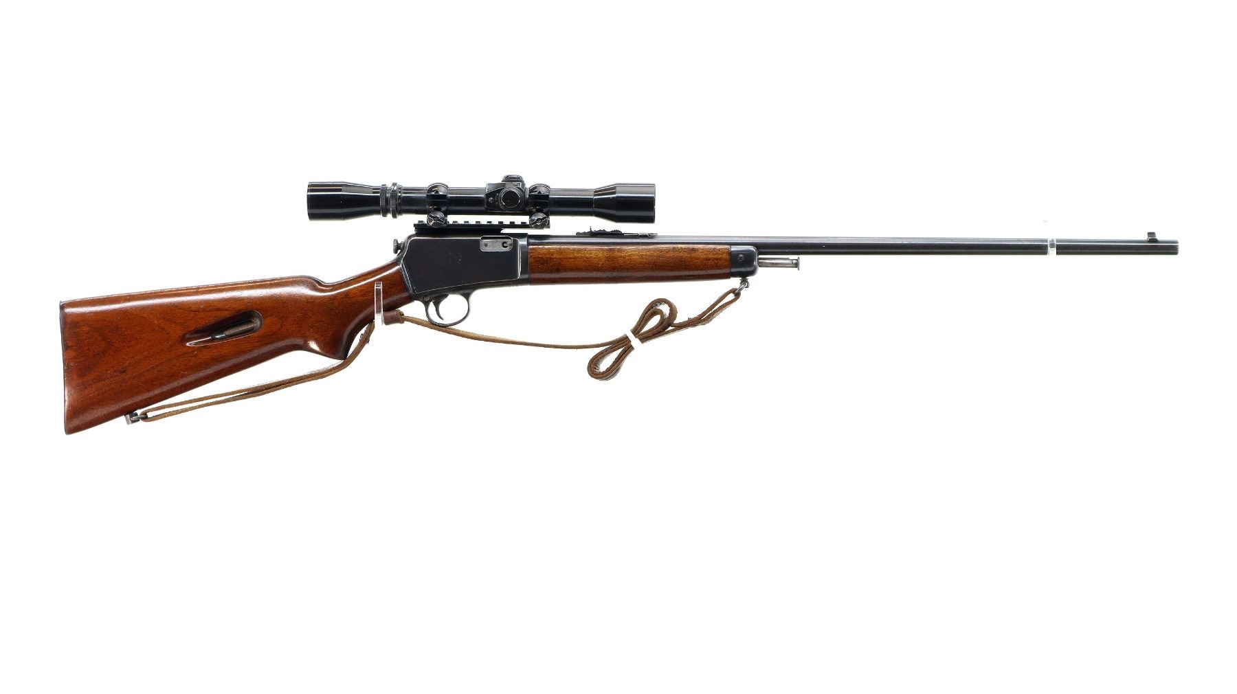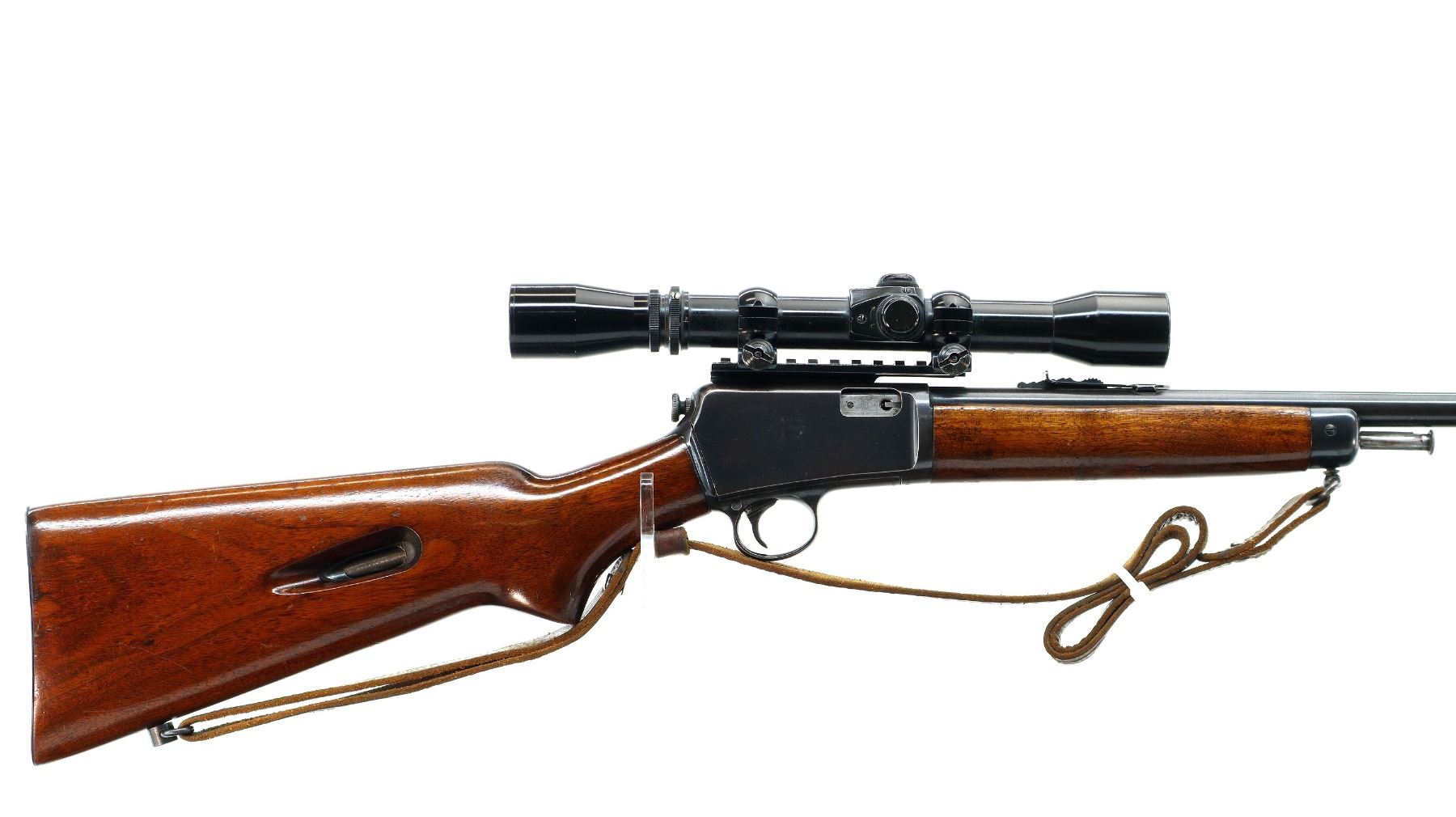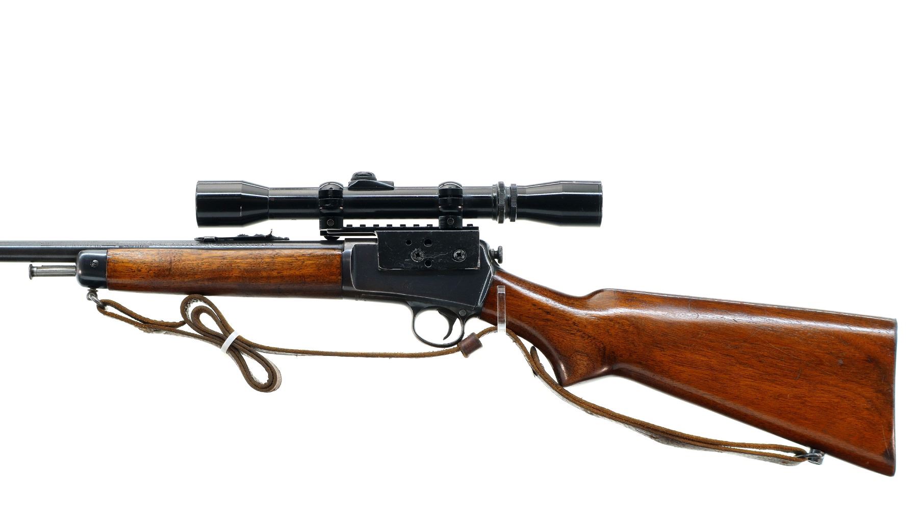 Main Description: Manufactured 1947. Blade front sight, adjustable u notched rear sight, blued finish, receiver drilled and tapped with Mono Scope 3-7x31 installed, clear optics with fine crosshair. Two piece wood stocks, pistol grip, smooth steel butt plate, sling swivels with brown leather sling.