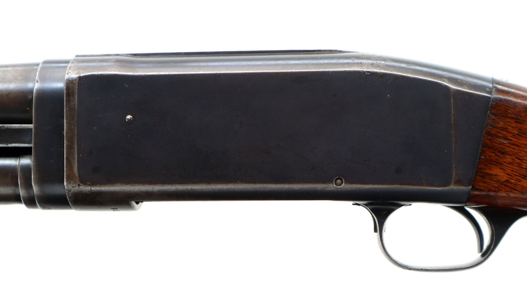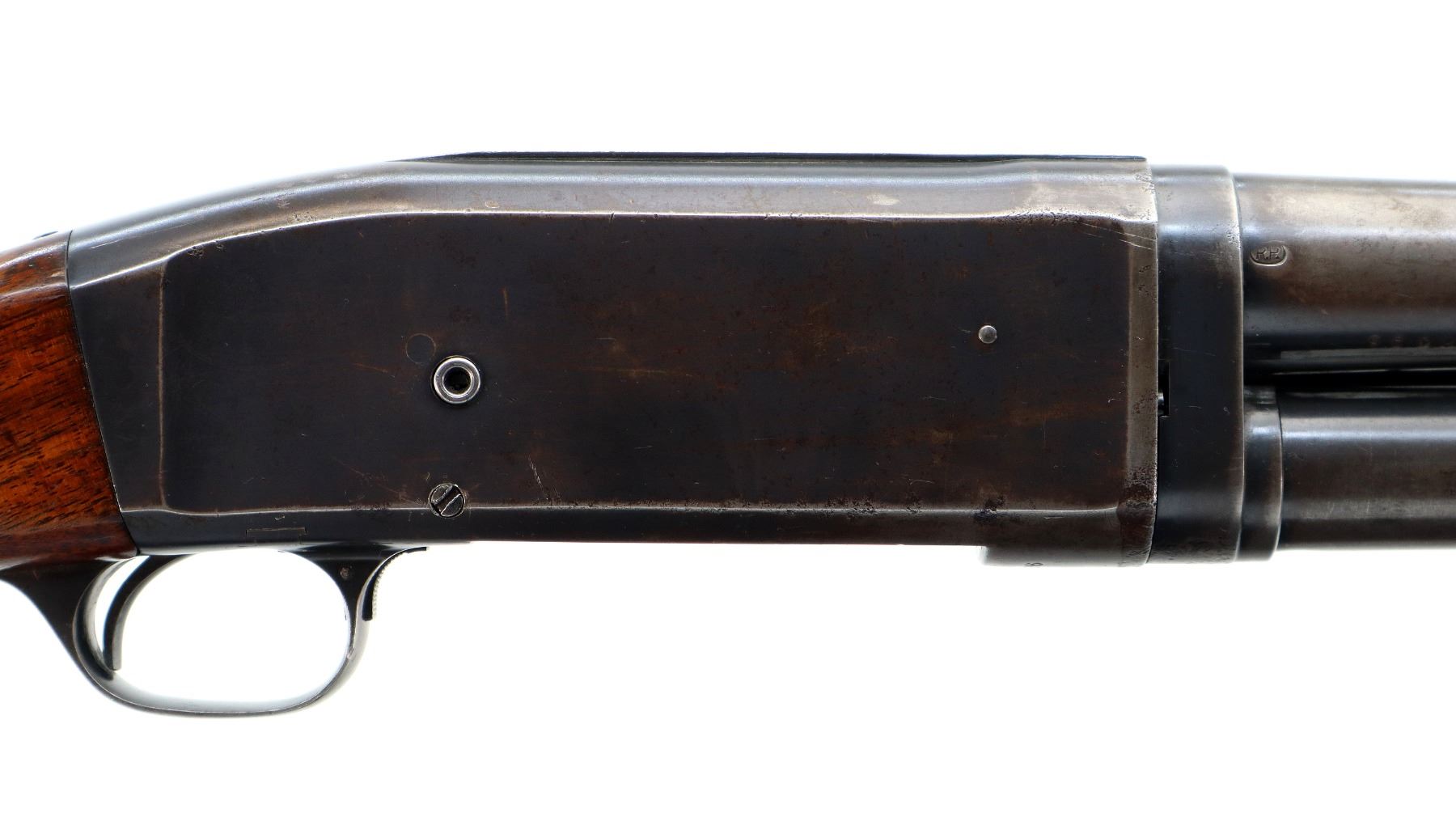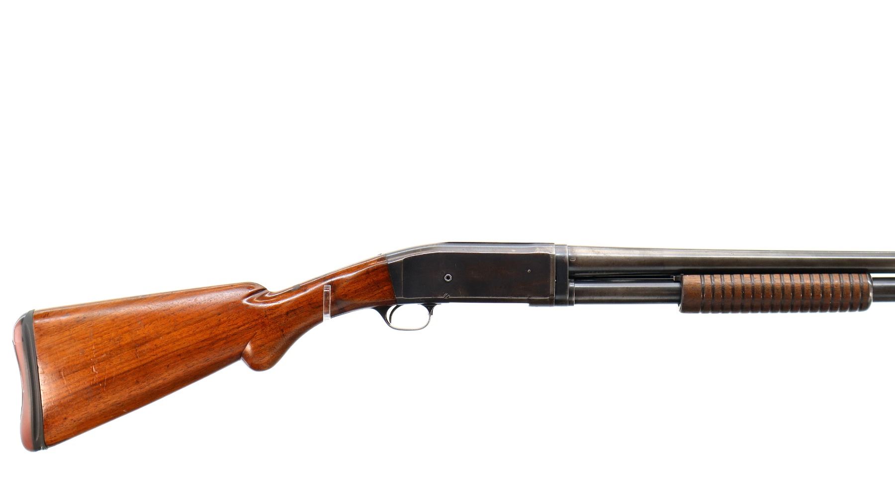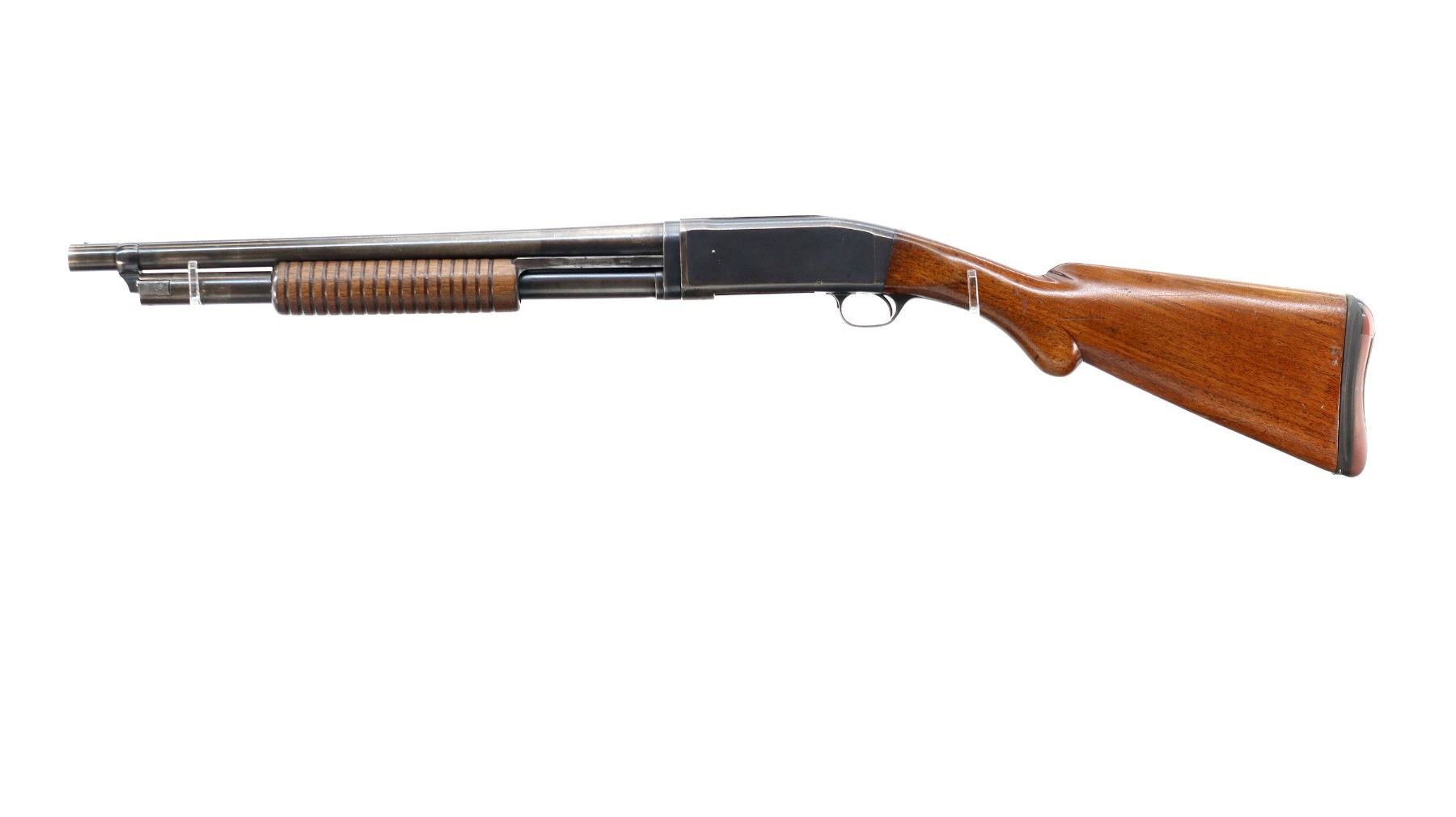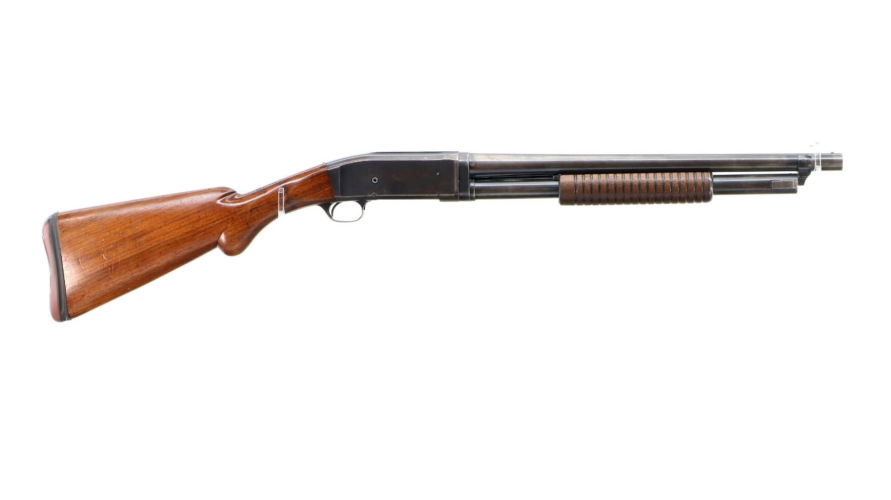 Main Description: Silver bead, blued finish, shortened round barrel. Two piece wood stocks, grooved forearm which is cracked, pistol grip cracked behind upper tang, replaced red/black rubber recoil pad