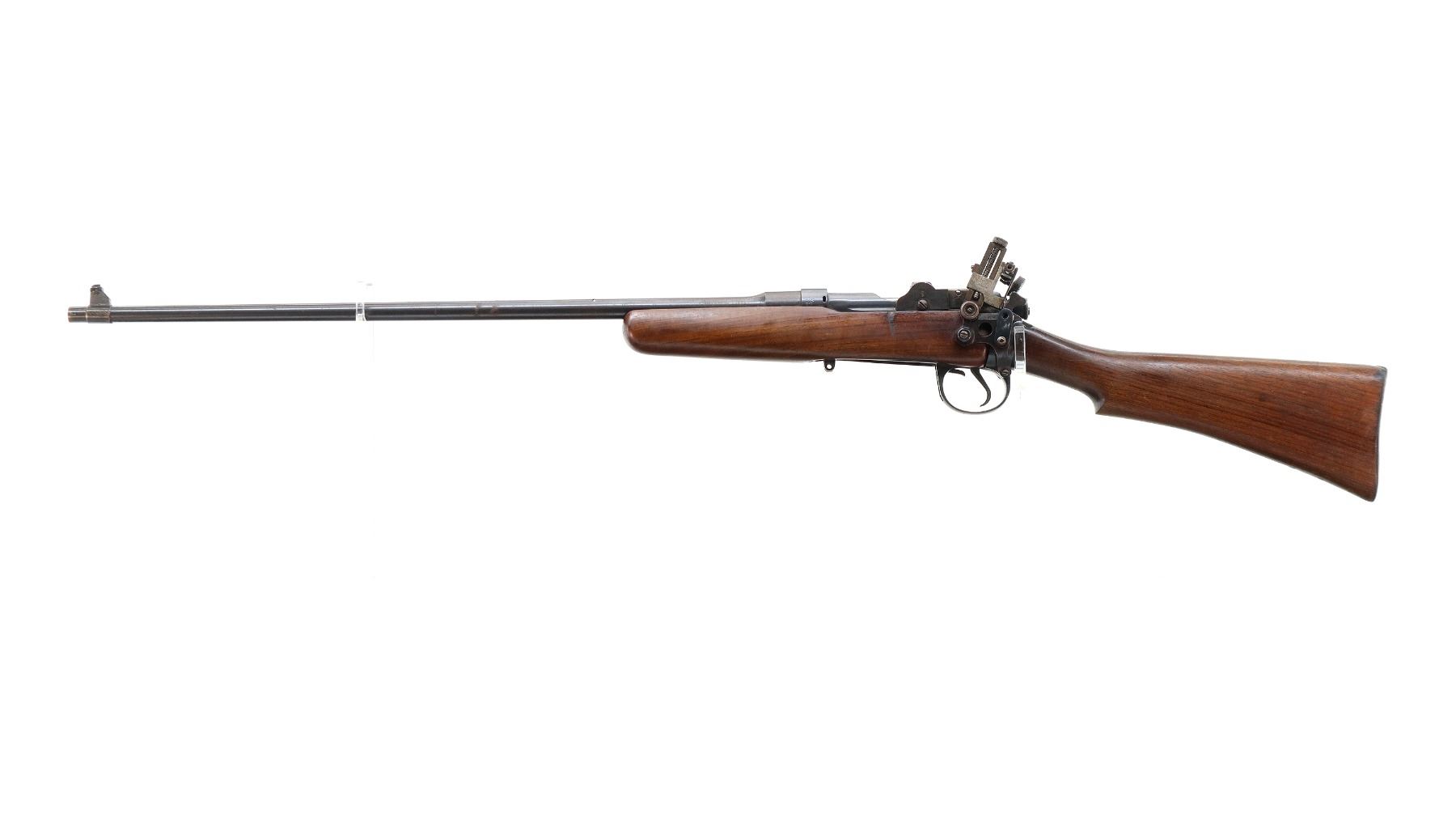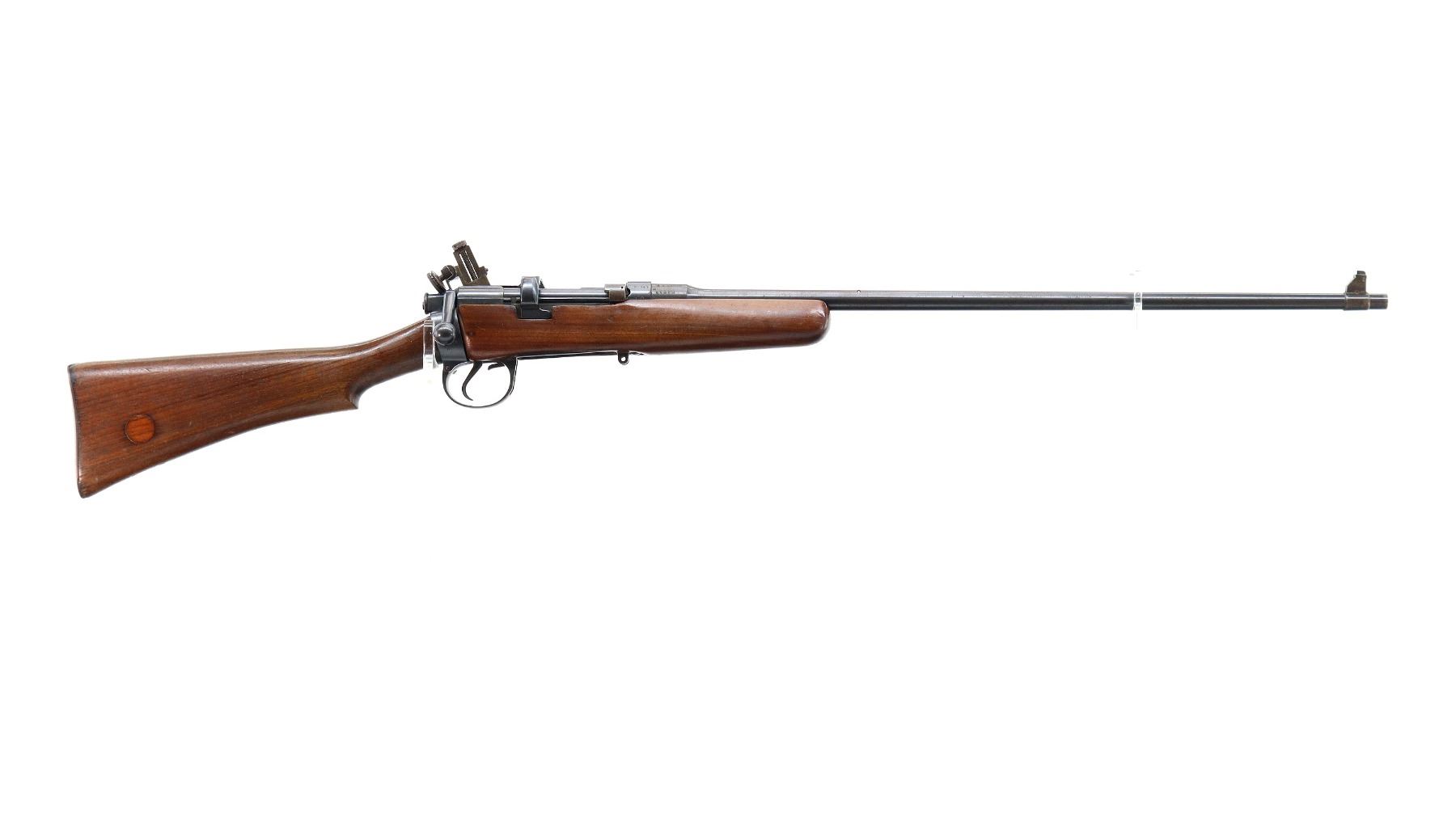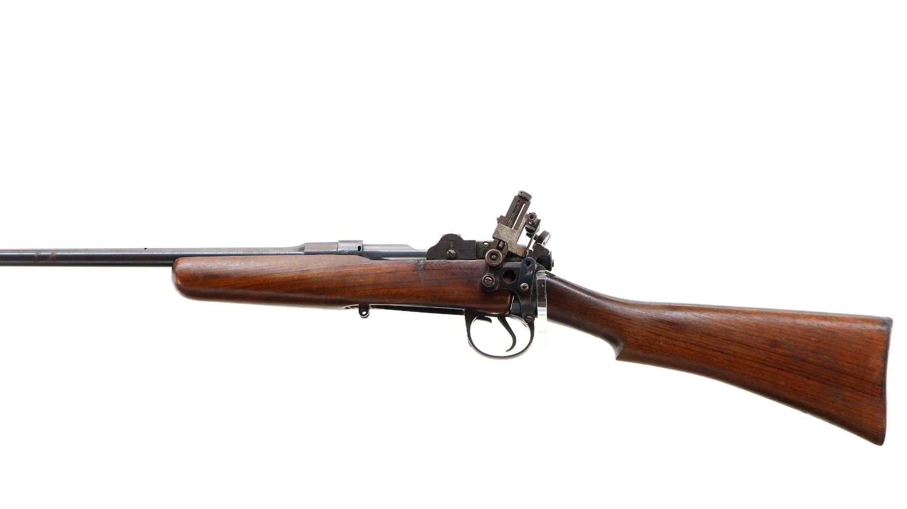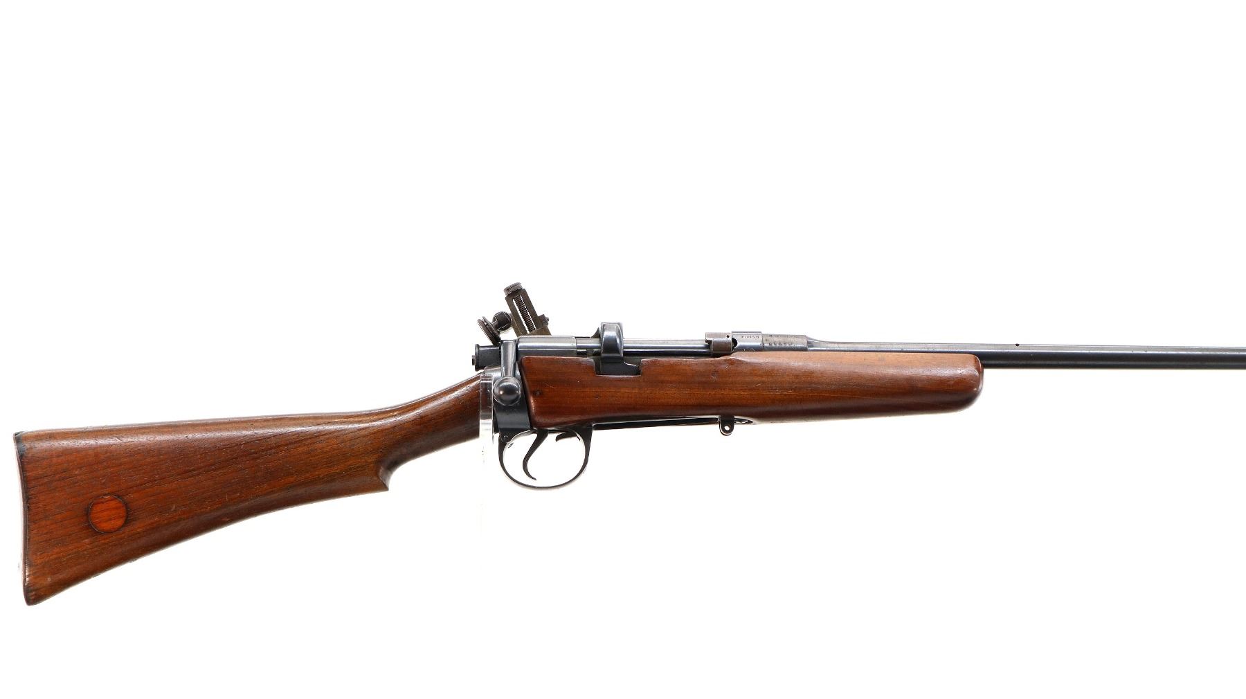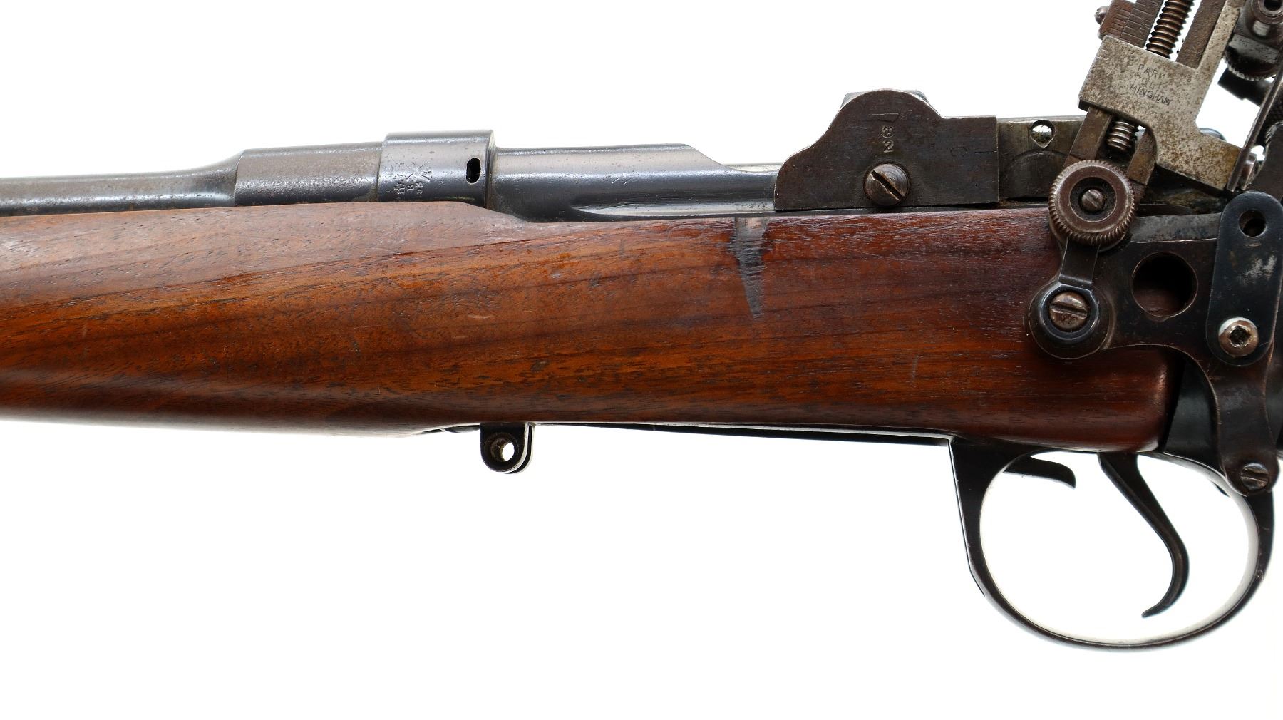 Main Description: Manufactured by BSA Co 1916, serial numbers mismatched. Blade front sight with ramp, missing rear sight holes are present, receiver has an adjustable folding Parker Hale Target peep sight installed which is loose, blued finish, bolt is tight to close. Two piece sporterized wood stocks, pistol grip, smooth steel butt plate, wood stock disk