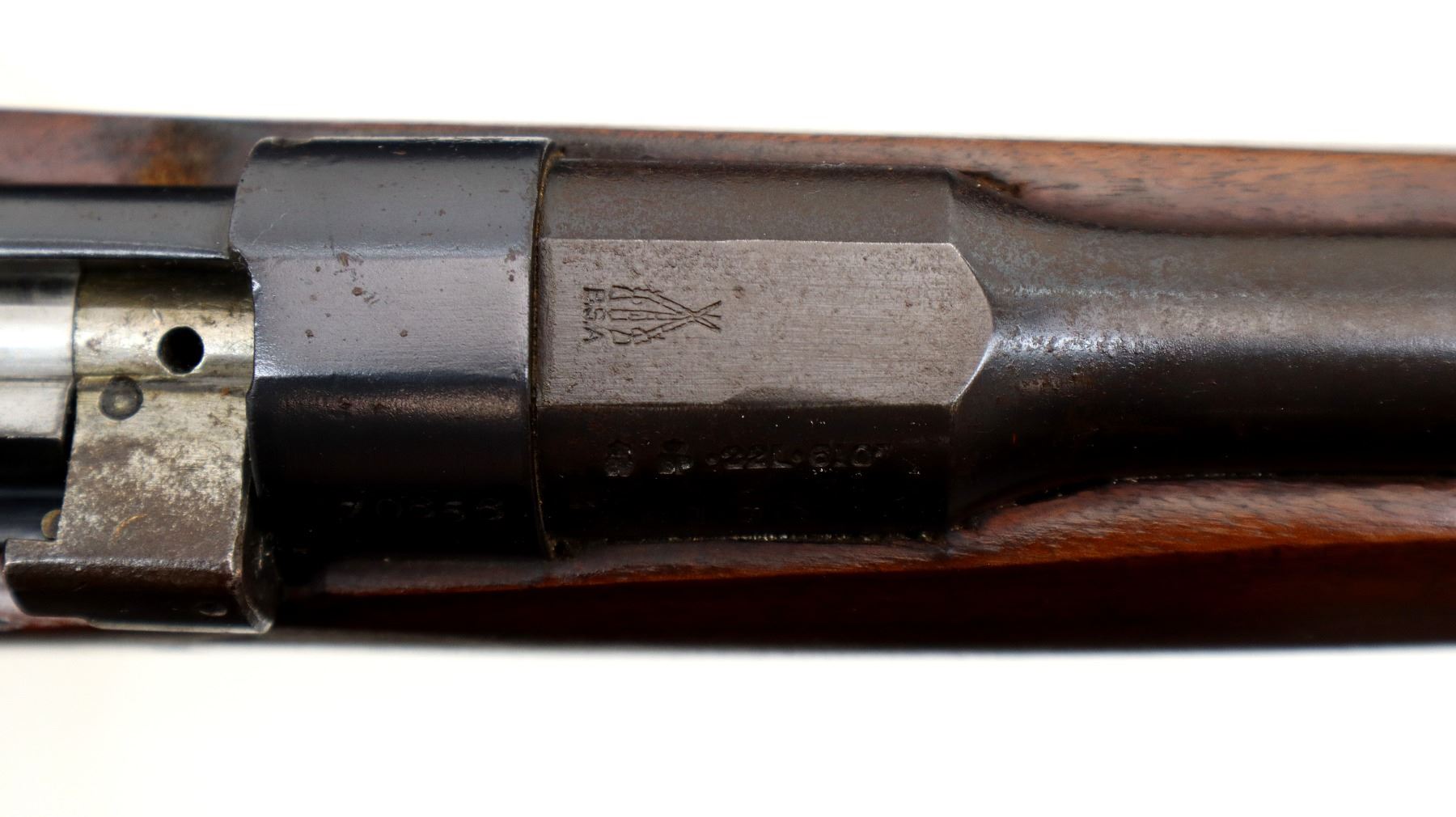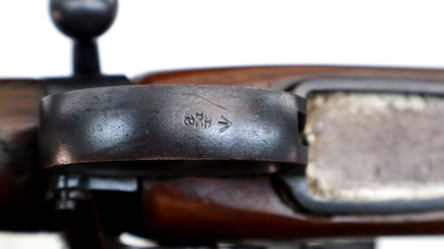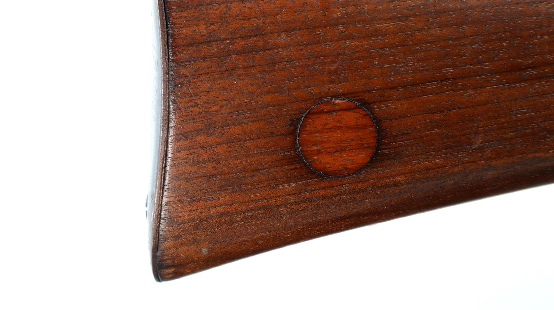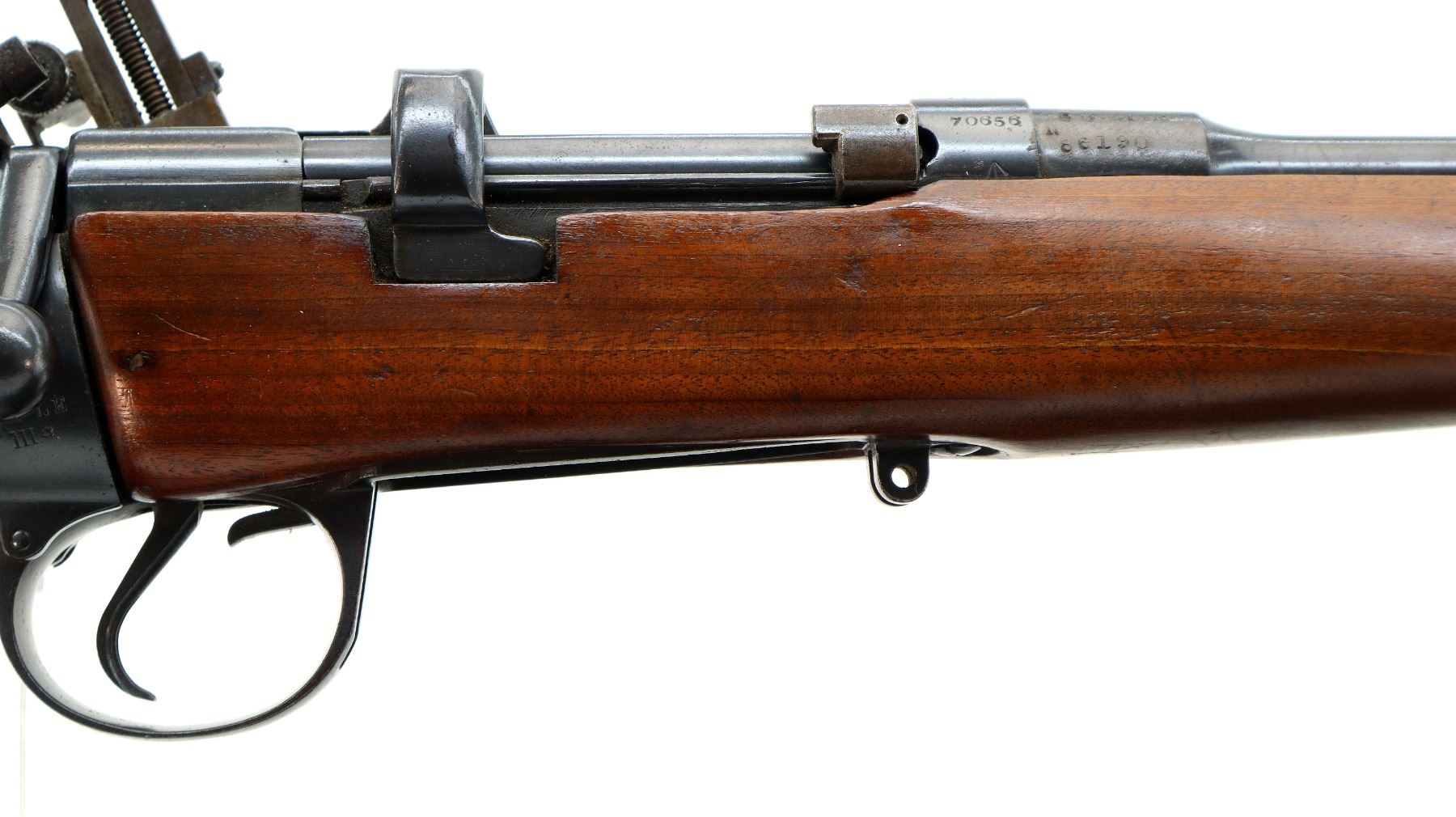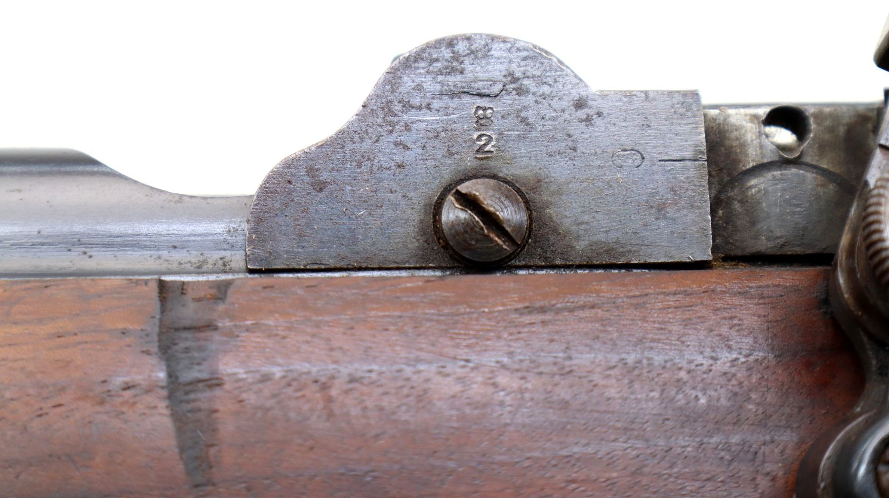 Main Description: Manufactured by BSA Co 1916, serial numbers mismatched. Blade front sight with ramp, missing rear sight holes are present, receiver has an adjustable folding Parker Hale Target peep sight installed which is loose, blued finish, bolt is tight to close. Two piece sporterized wood stocks, pistol grip, smooth steel butt plate, wood stock disk