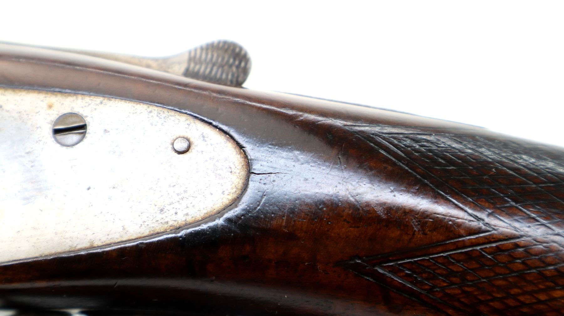 Main Description: Brass bead, blued finish, raised rib on barrels that chime and are tight on face, automatic safety, extractor, side locks, double triggers. Two piece wood stocks, checkered splinter forearm and pistol grip, small chips behind upper tang, small crack behind left side lock. Red rubber recoil pad, 14.25" LOP.