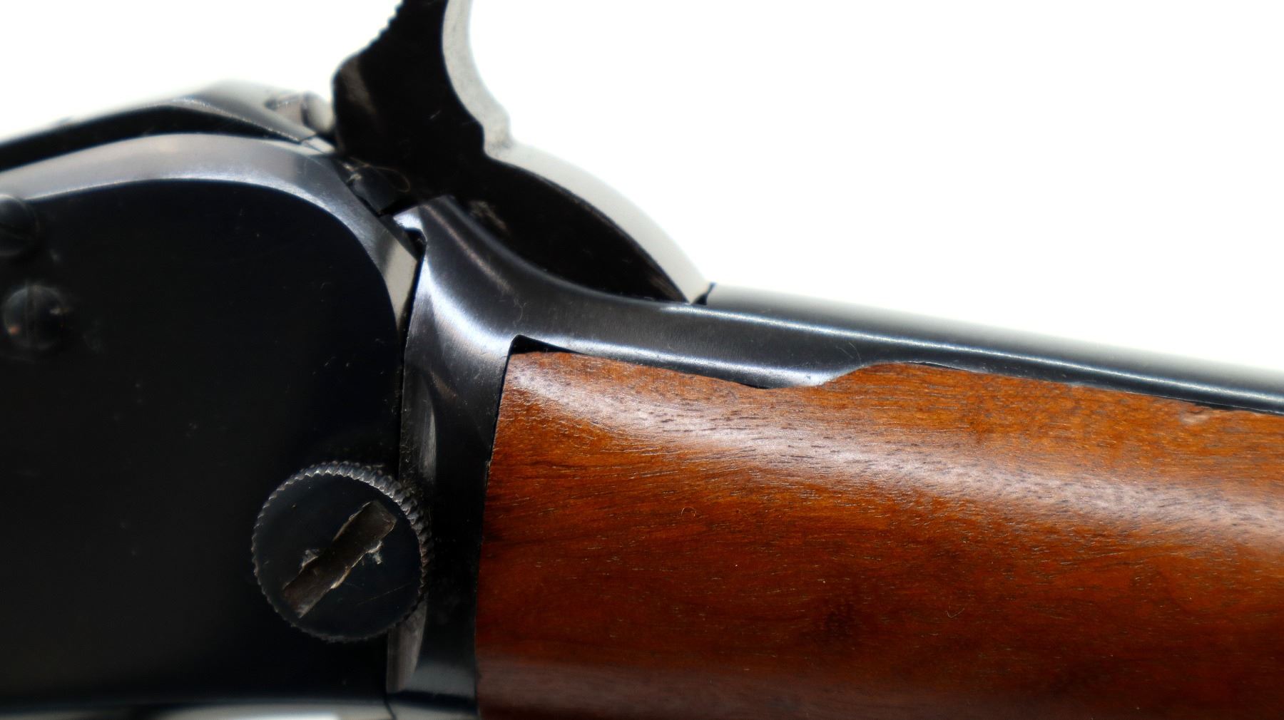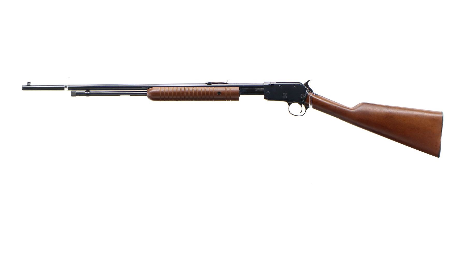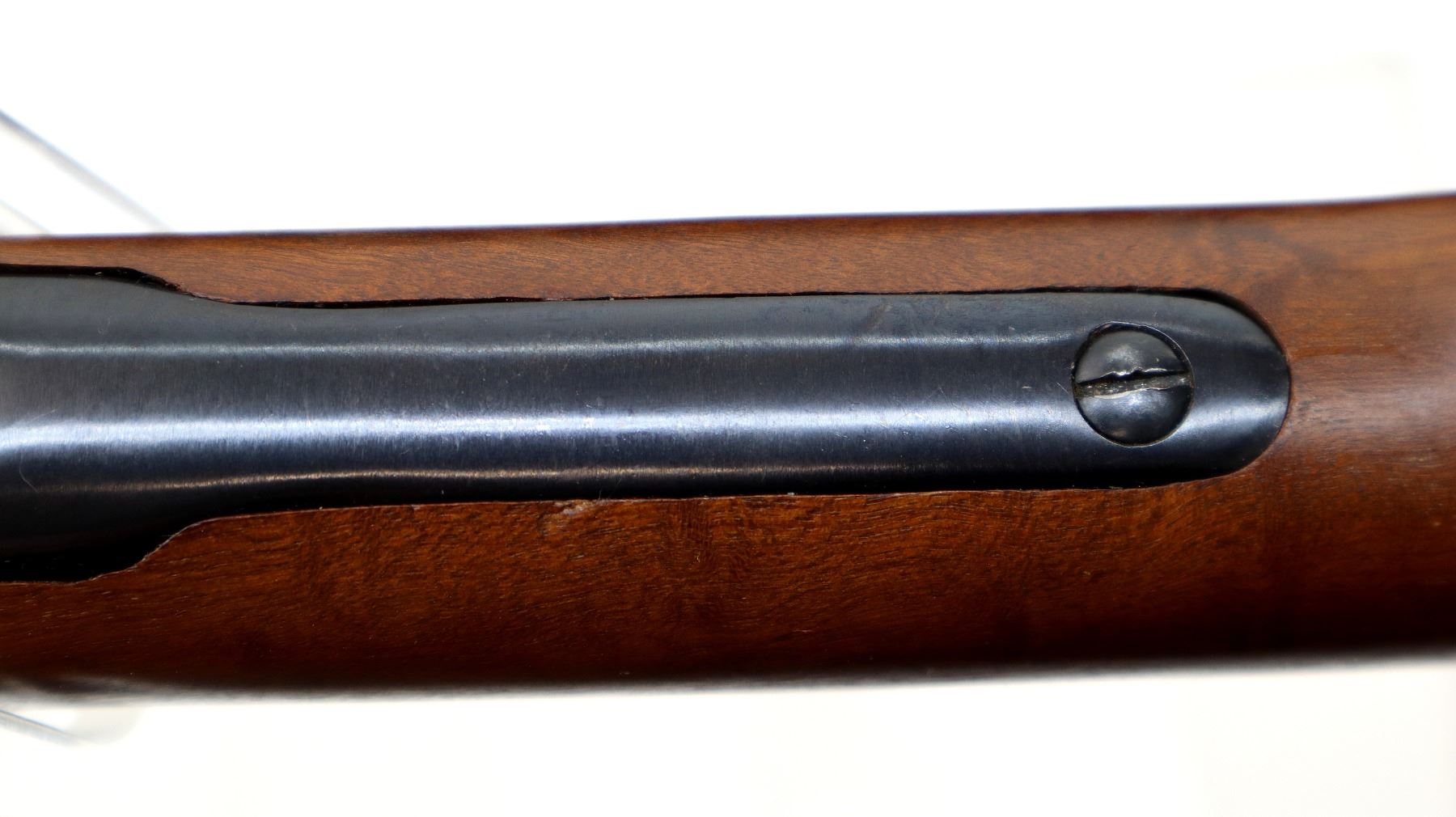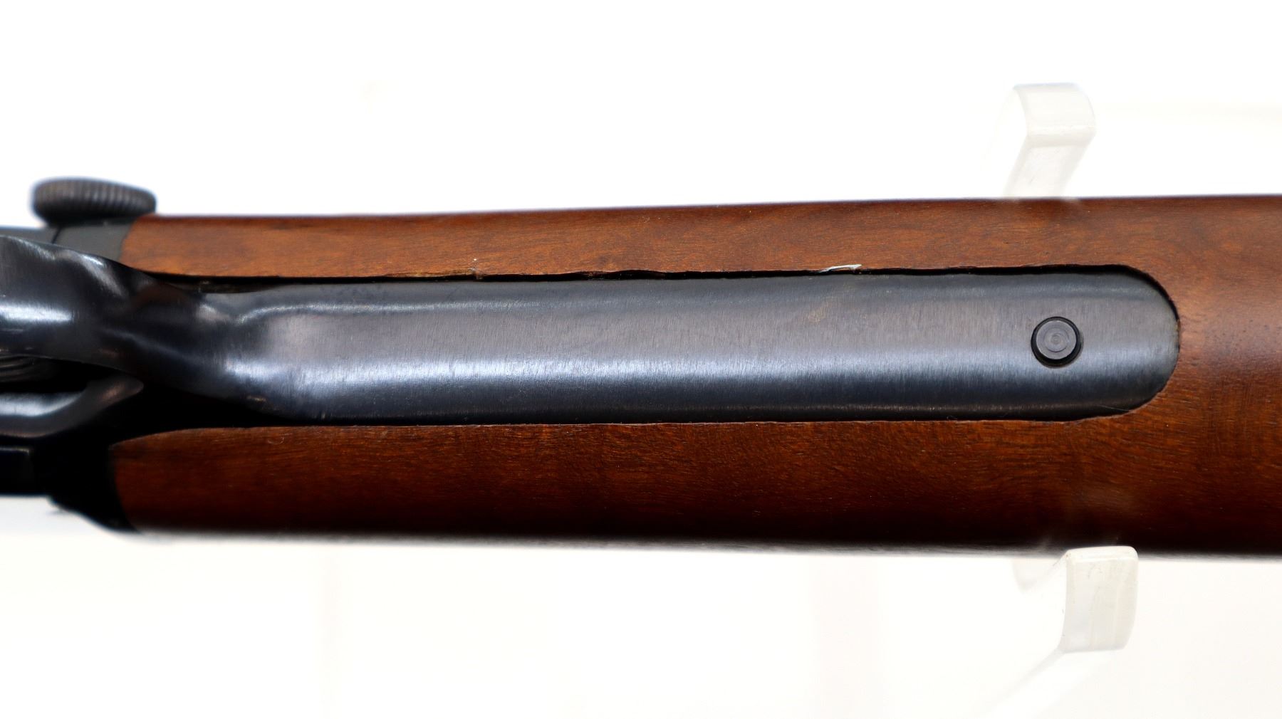 Main Description: Blade front sight, u notched rear sight missing elevator, blued finish, round barrel, receiver drilled and tapped with plug screws installed, grooved spur hammer. Two piece wood stocks, grooved forearm, straight grip, grooved black polymer butt plate.