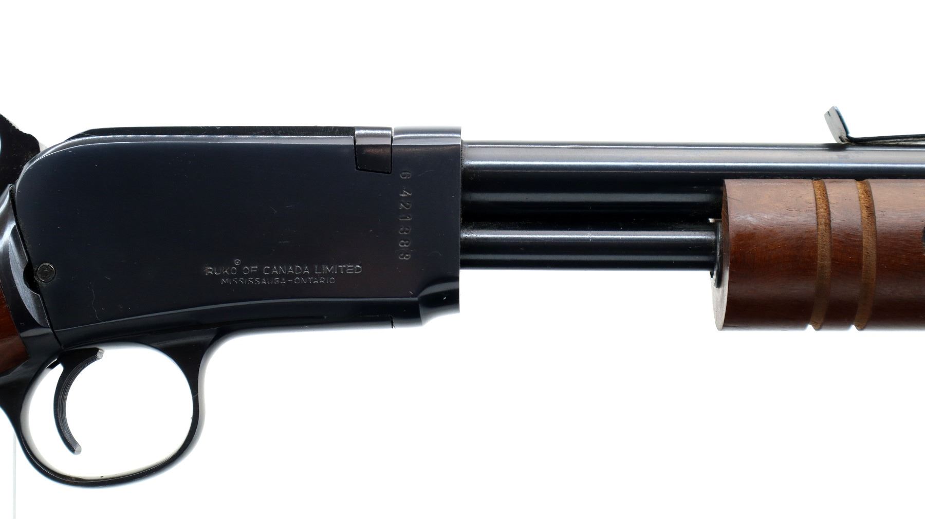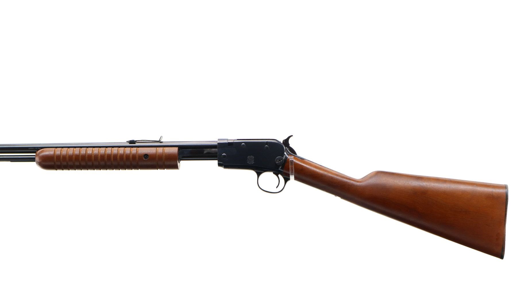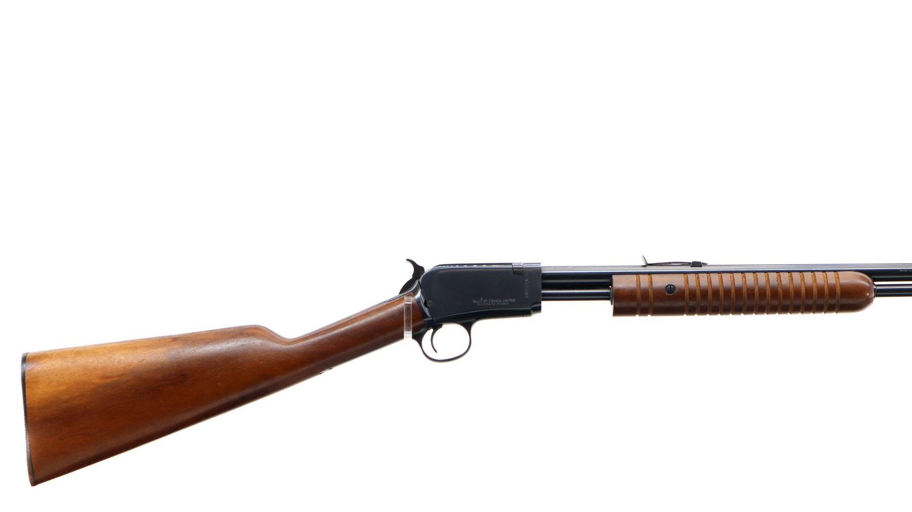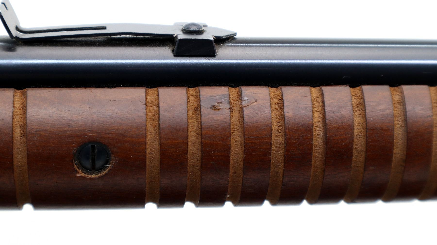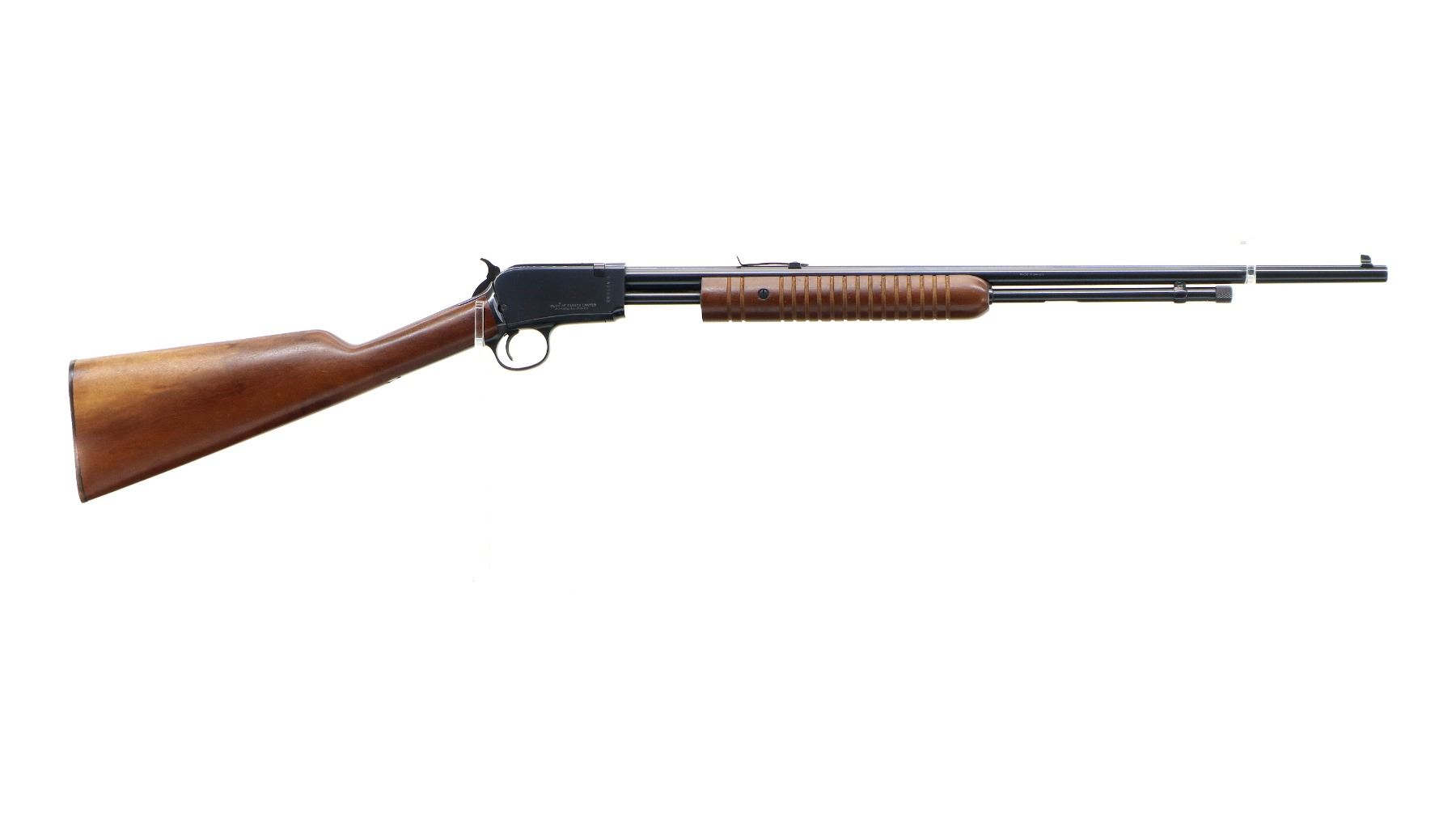 Main Description: Blade front sight, u notched rear sight missing elevator, blued finish, round barrel, receiver drilled and tapped with plug screws installed, grooved spur hammer. Two piece wood stocks, grooved forearm, straight grip, grooved black polymer butt plate.