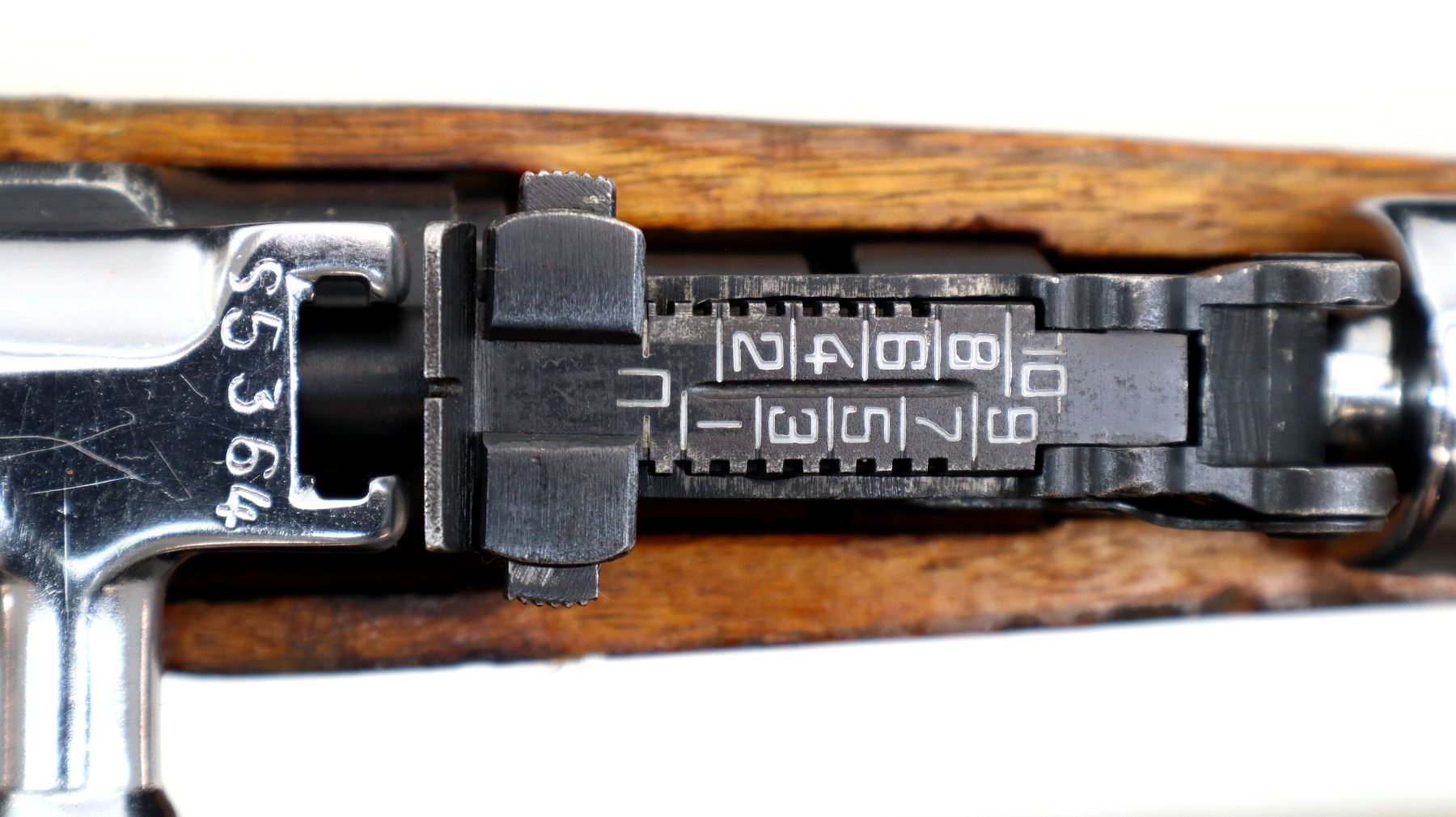 Main Description: Serial numbers mismatched. Post front sight with hood and ramp, adjustable u notched rear sight, mix of blued and chromed metal finish. Two piece full military wood stocks, ventilated handguard, finger grooved forearm, pistol grip, smooth steel butt plate with trap and cleaning kit, sling swivels, cleaning rod, attached folding blade bayonet.
