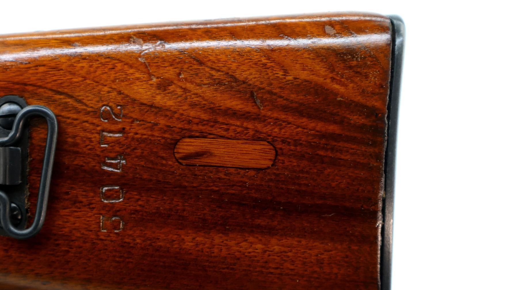 Main Description: Manufactured by Factory 26, visible serial numbers match. Post front sight with hood and ramp, adjustable u notched rear sight, blued finish, silver bolt and carrier. Two piece full military wood stocks, ventilated handguard, finger grooved forearm, pistol grip, smooth steel butt plate with trap and cleaning kit, butt stock has some arsenal repairs, sling swivels, cleaning rod, attached folding blade bayonet.