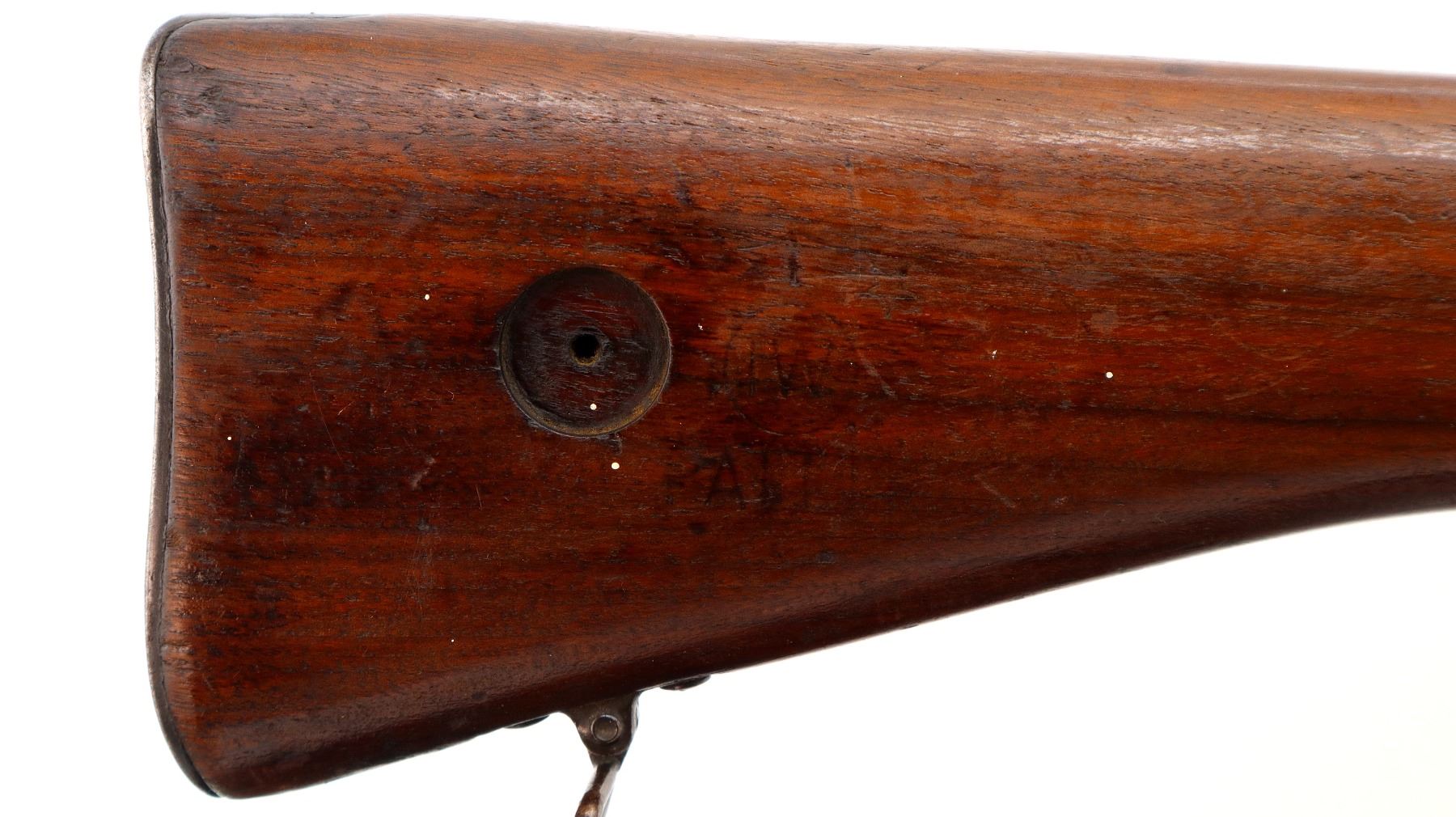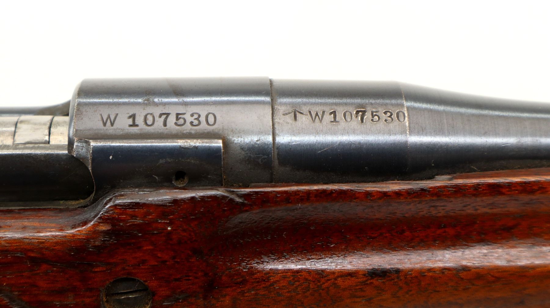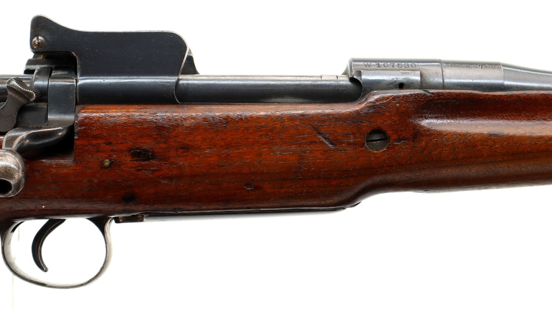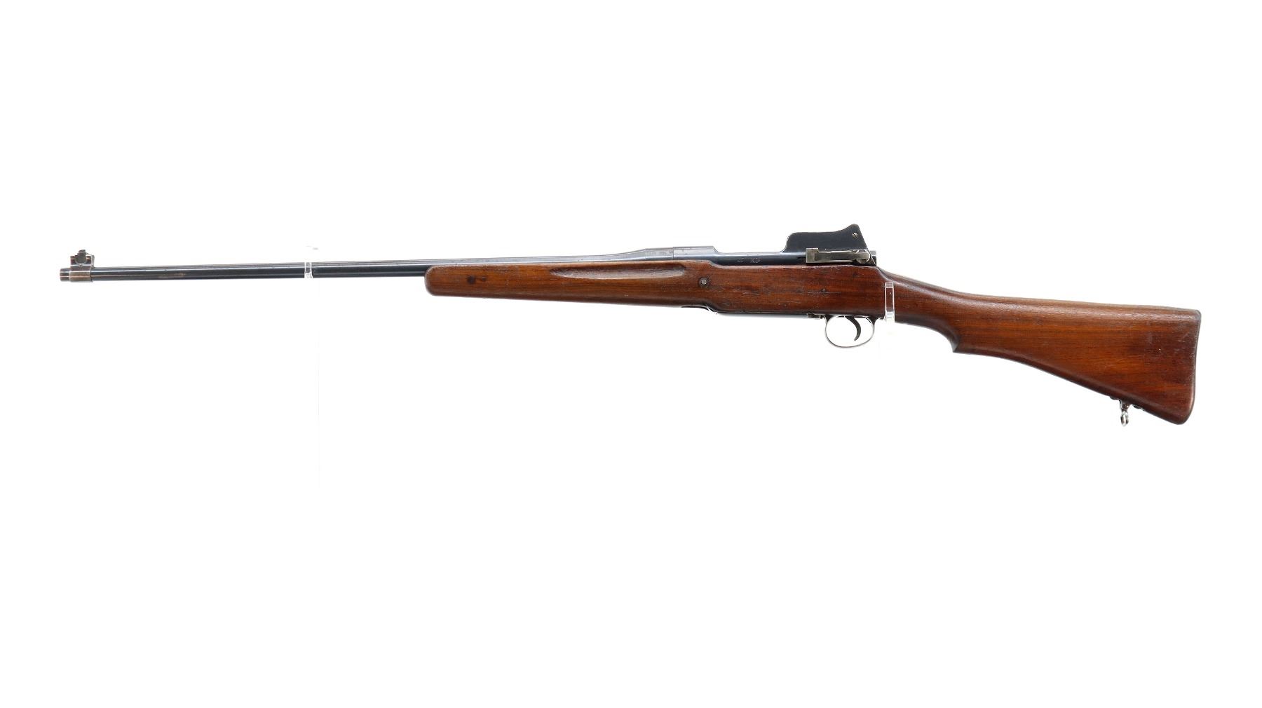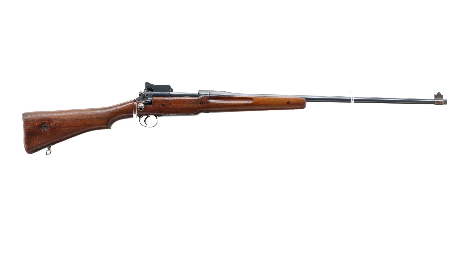 Main Description: Manufactured by Winchester, bolt and rear sight match. Blade front sight, ears removed, adjustable rear peep sight with ears, blued finish. One piece sporterized wood stock, finger grooved forearm, pistol grip, smooth steel butt plate with trap, missing stock disk, rear sling swivel only.