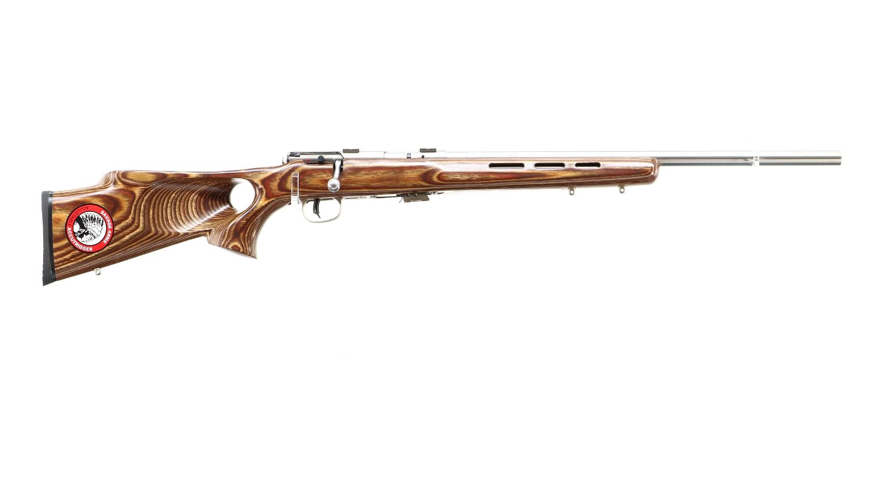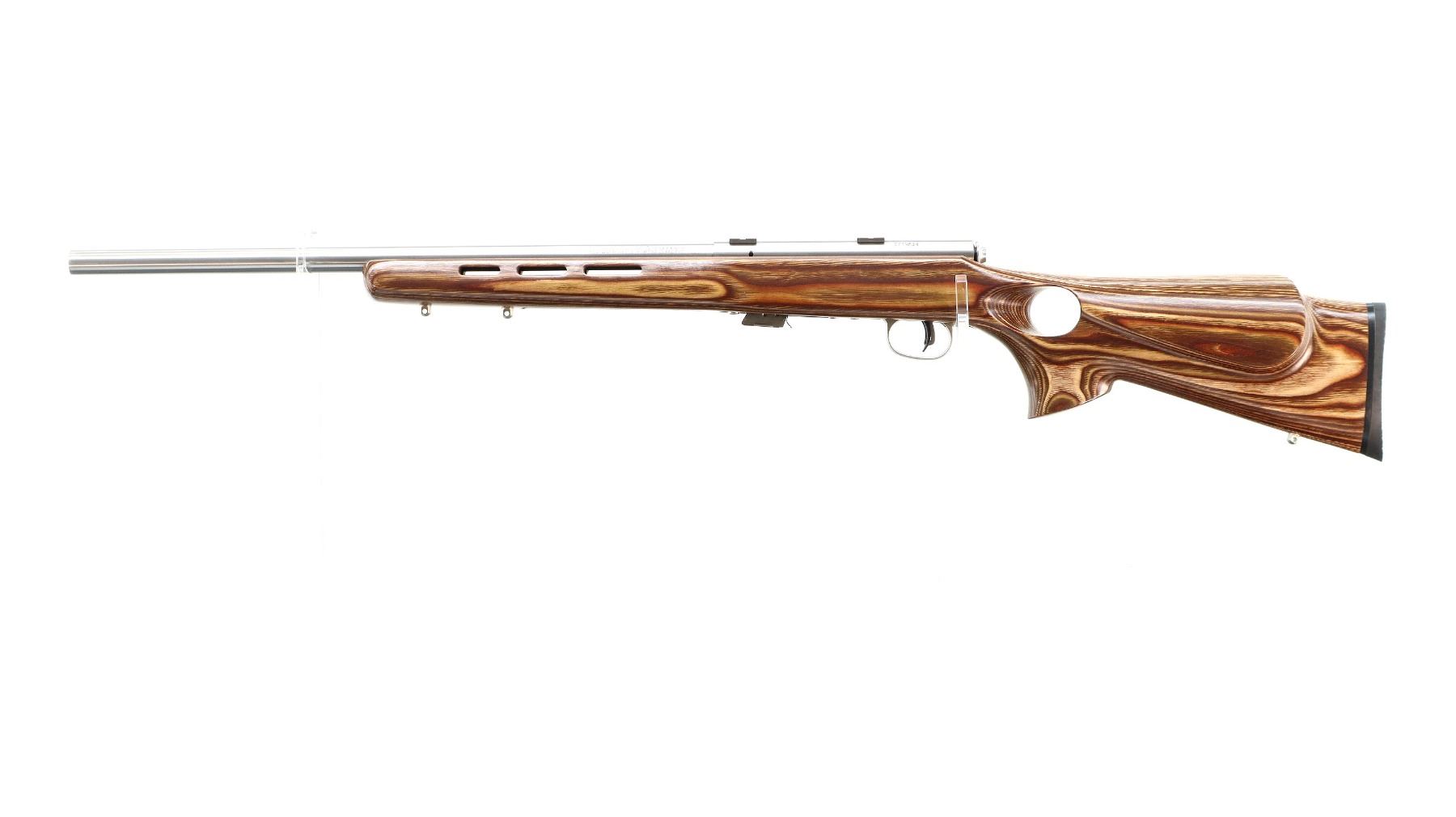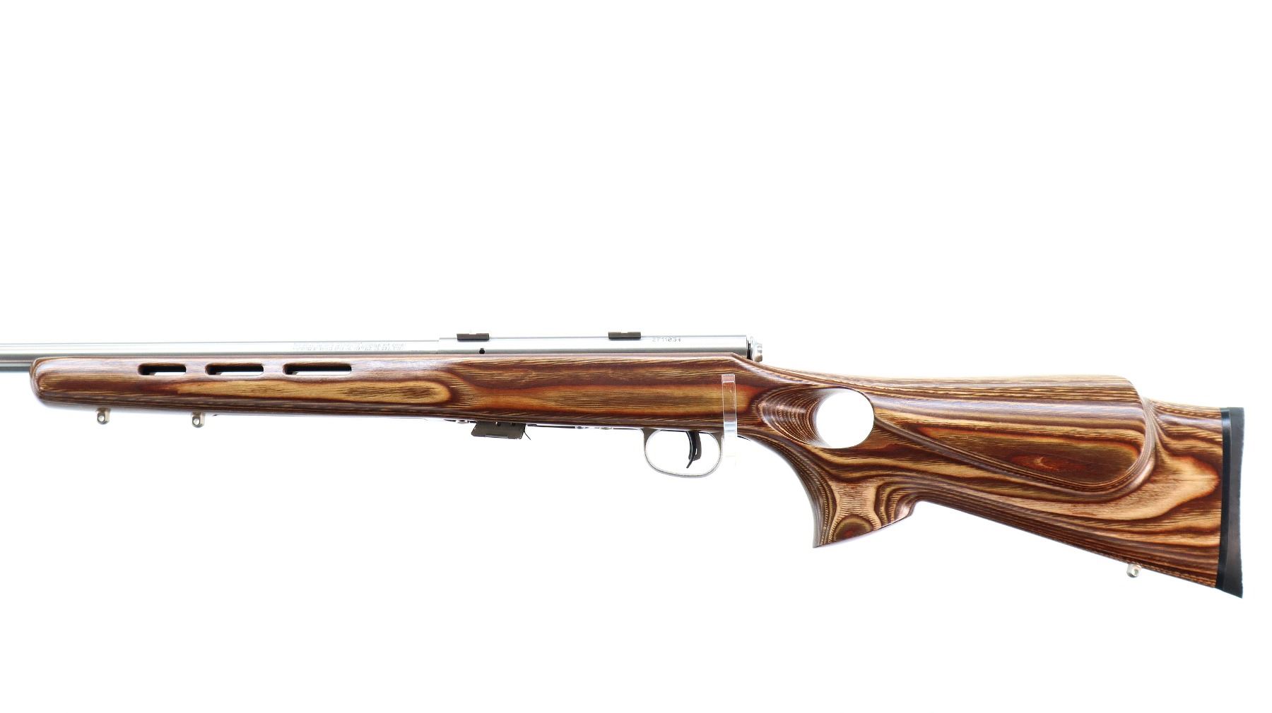 Main Description: No sights, stainless finish, heavy barrel, receiver drilled and tapped with two piece scope bases installed. One piece brown laminate wood stock, ventilated forearm, thumb hole pistol grip, cheek rest, black rubber recoil pad, accu trigger, three swivel studs, retains factory stickers.