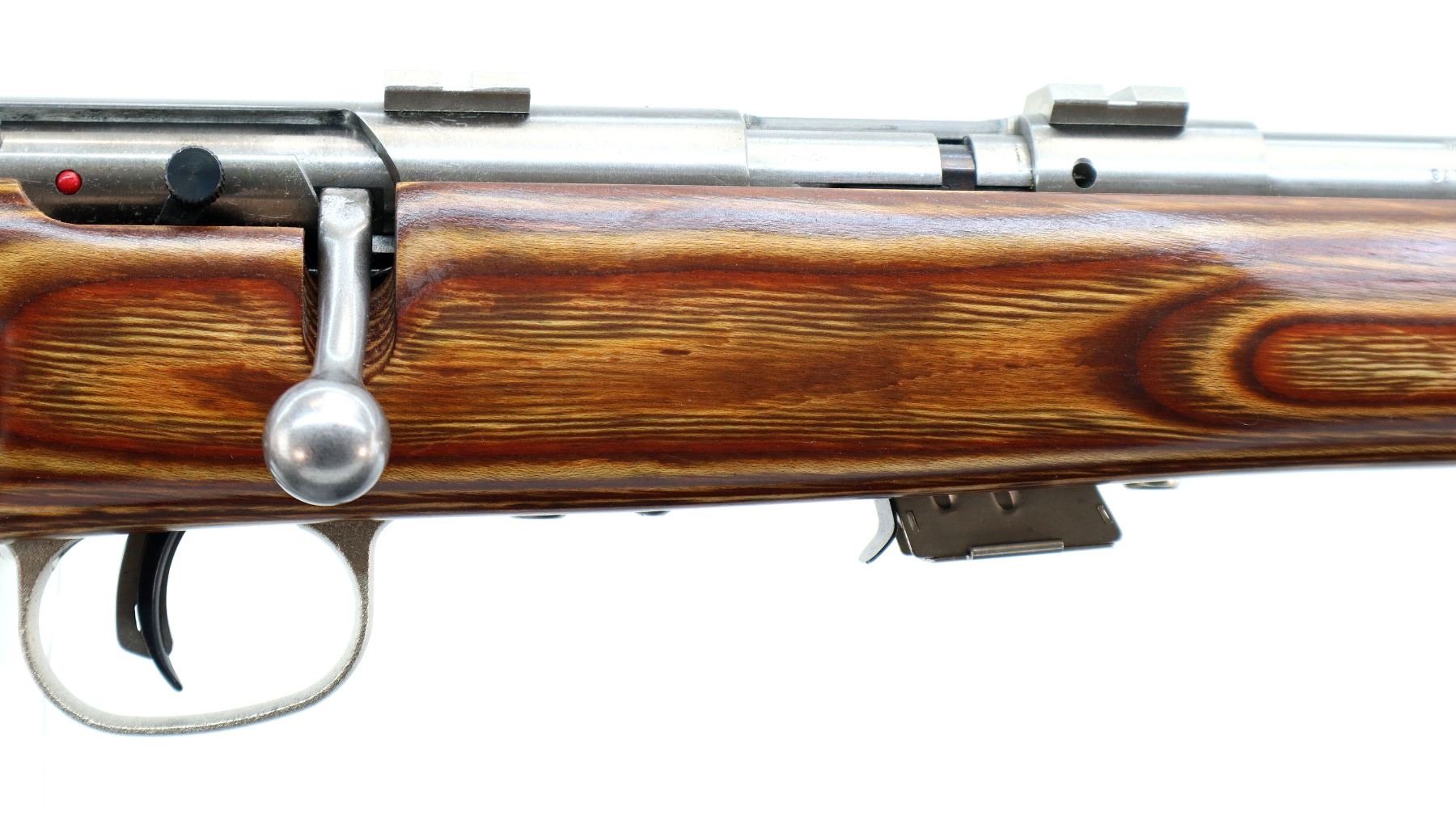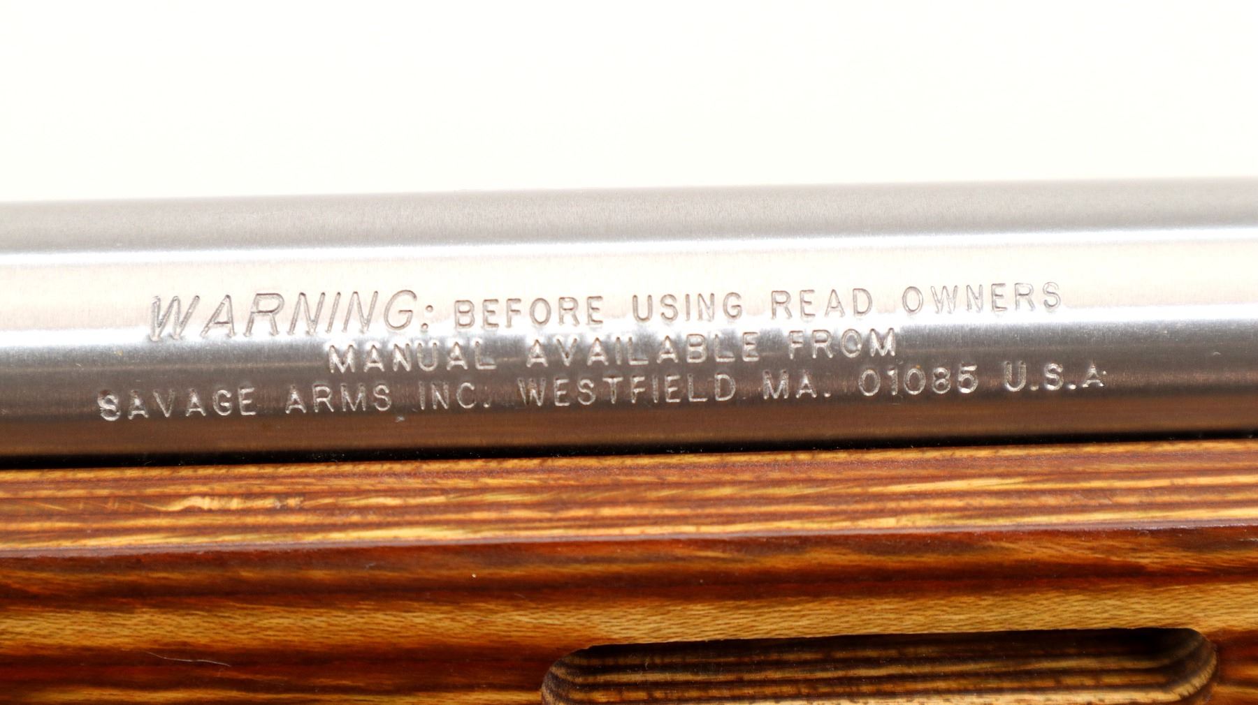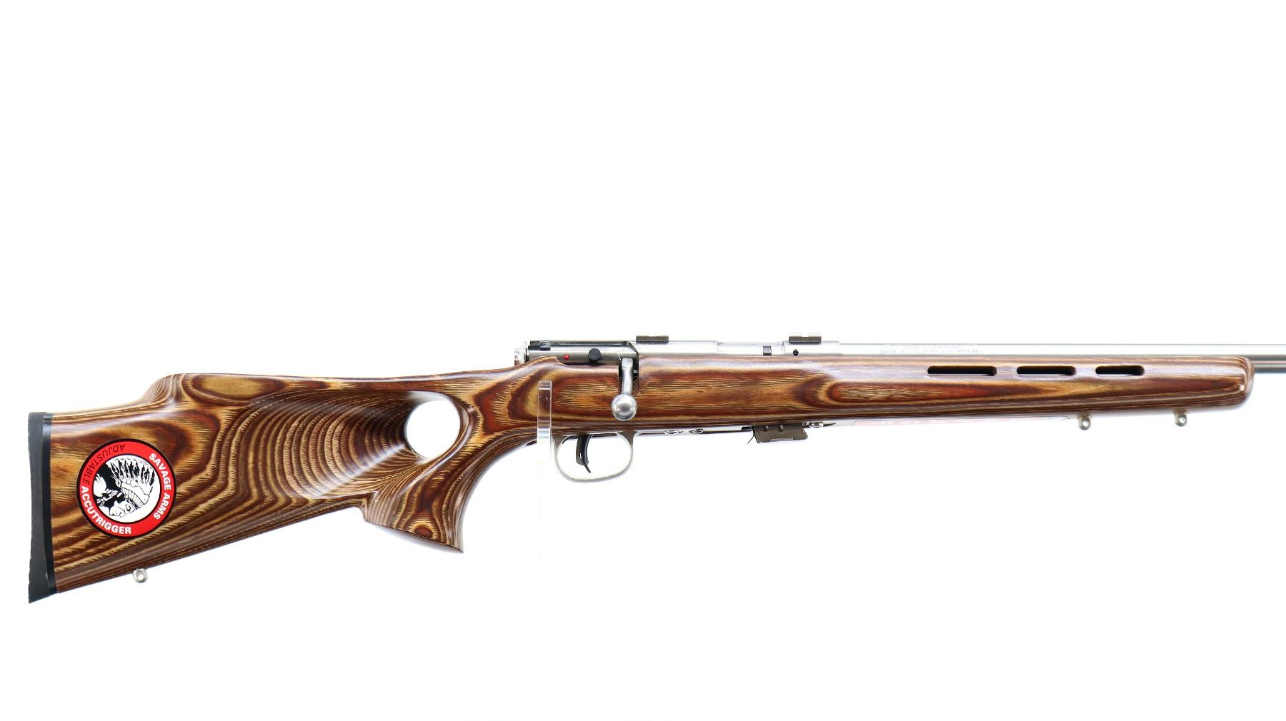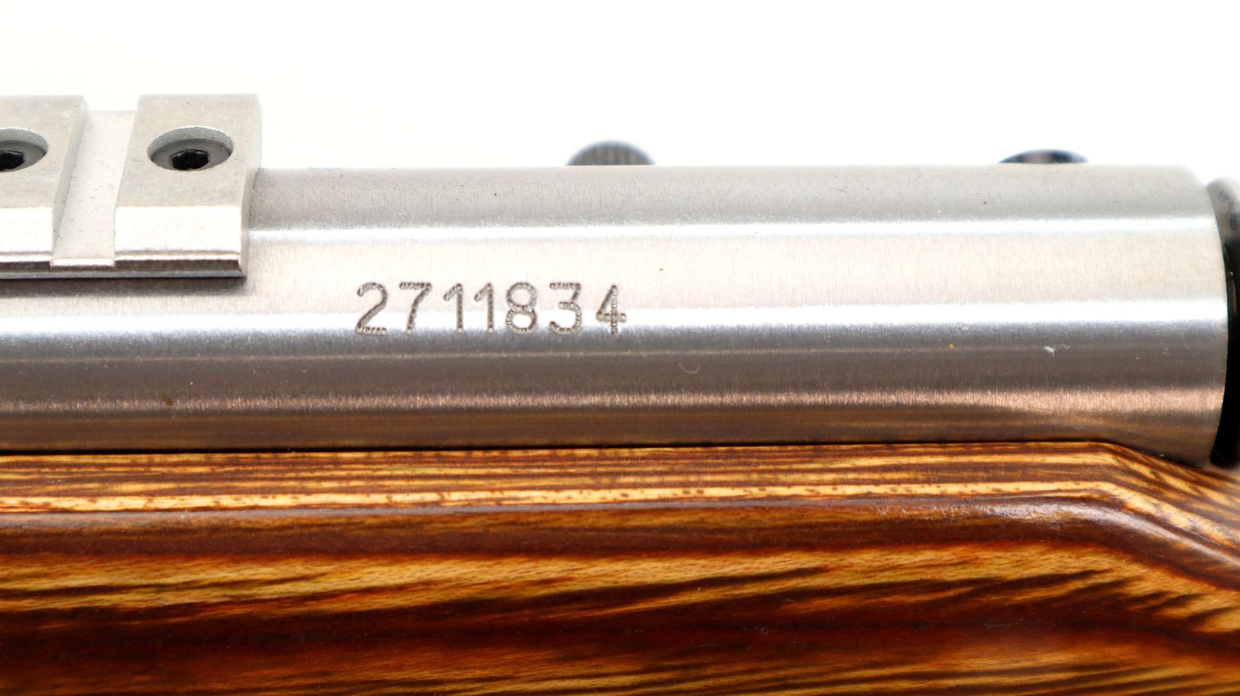 Main Description: No sights, stainless finish, heavy barrel, receiver drilled and tapped with two piece scope bases installed. One piece brown laminate wood stock, ventilated forearm, thumb hole pistol grip, cheek rest, black rubber recoil pad, accu trigger, three swivel studs, retains factory stickers.