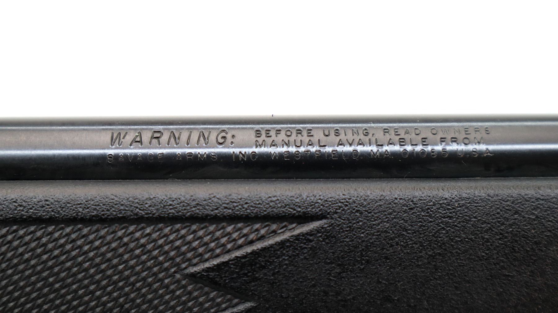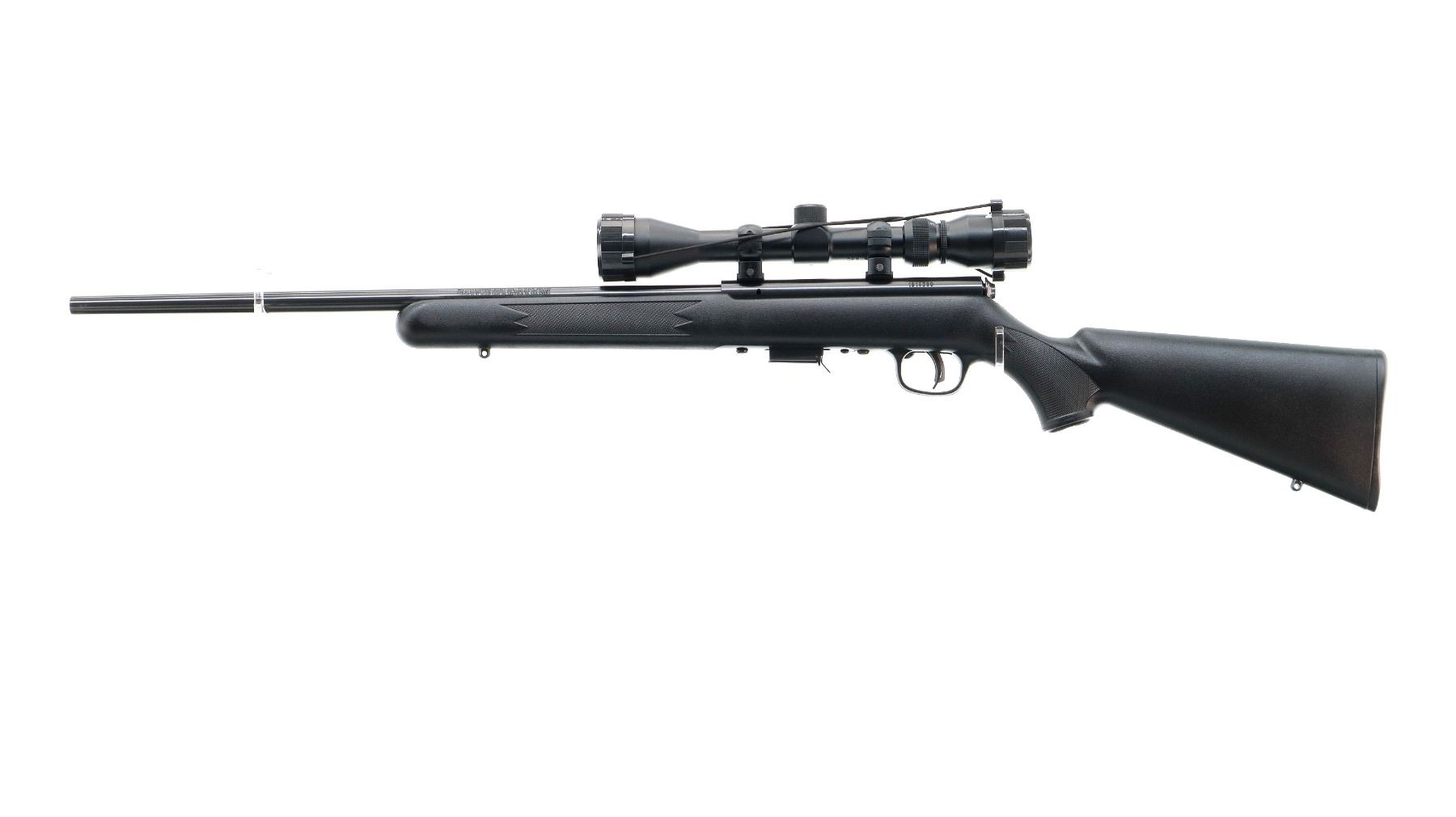 Main Description: No sights, blued finish, receiver drilled and tapped with Bushnell 3-9x40 scope installed, clear optics with duplex crosshair. One piece black synthetic stock, checkered forearm and pistol grip, grooved black polymer butt plate, grip cap, accu trigger, swivel studs, retains factory sticker.