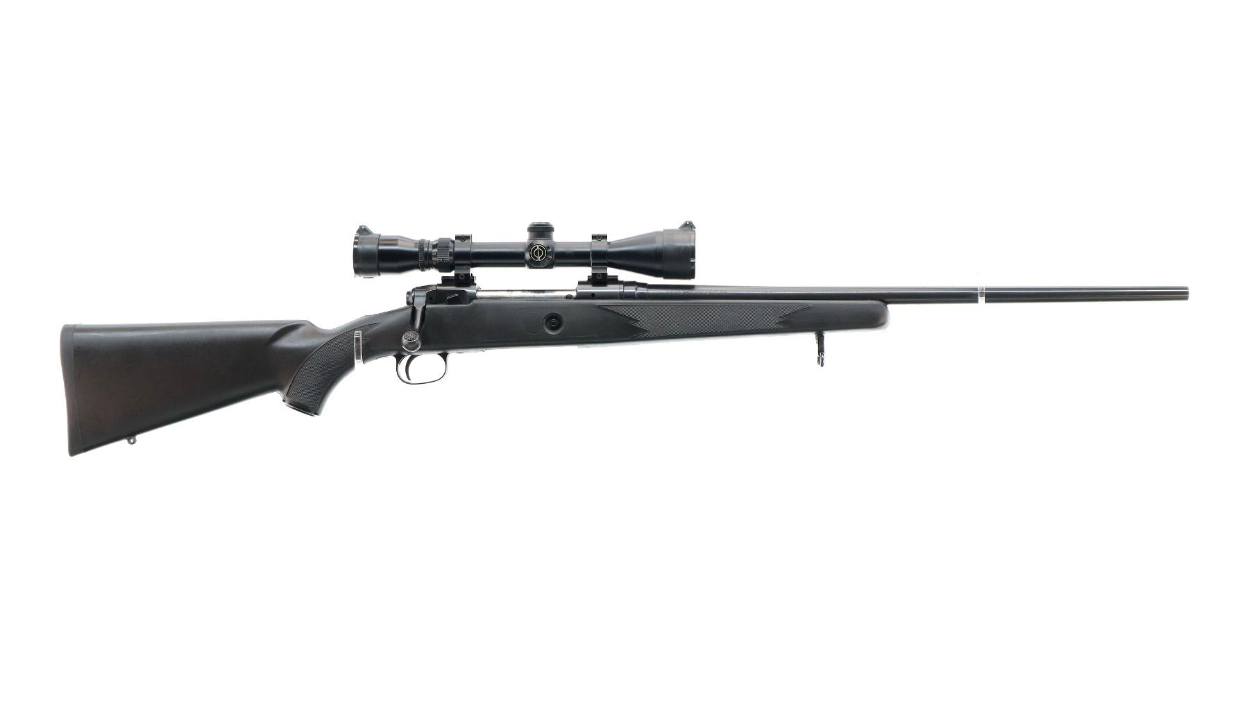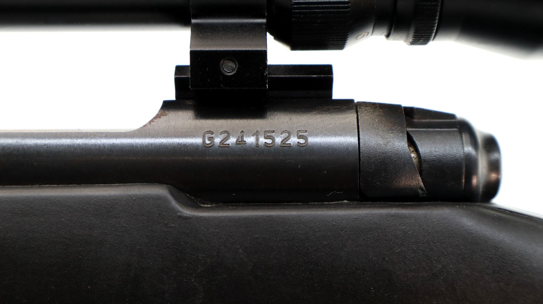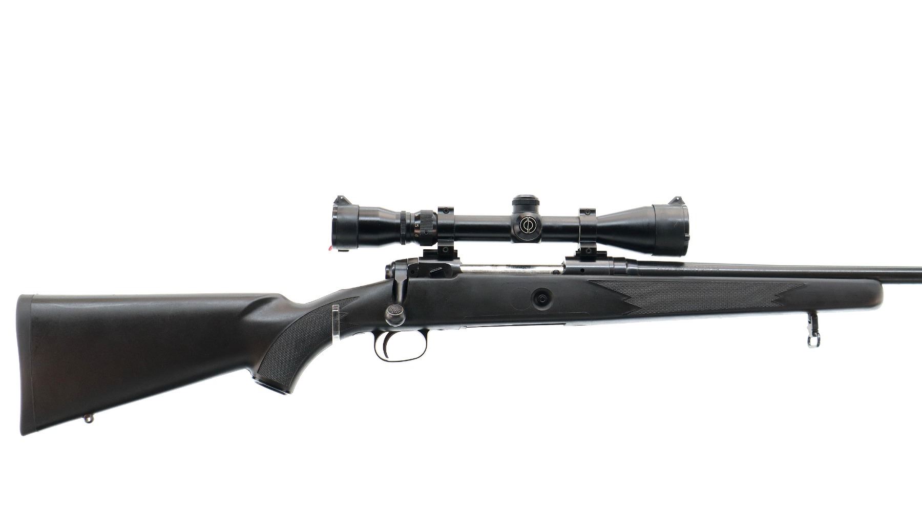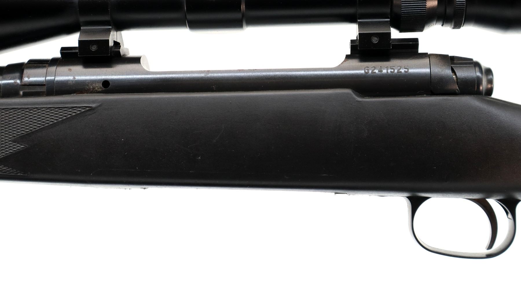 Main Description: No sights, blued finish, receiver drilled and tapped with Simmons 8.3-9x40 scope installed, clear optics with duplex crosshair. Checkered bolt knob, tang safety. One piece black synthetic stock, checkered forearm and pistol grip, black rubber recoil pad, grip cap, non accu trigger, missing front action screw, sling swivels, sling is missing one Chicago screw.