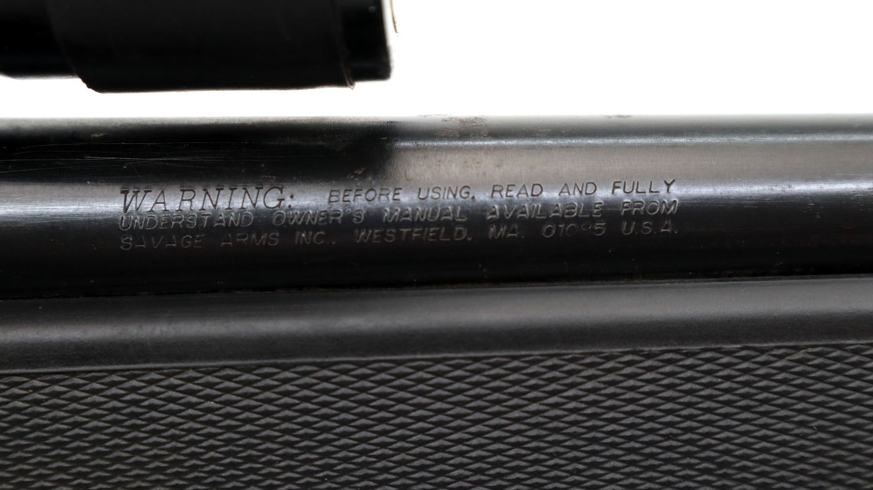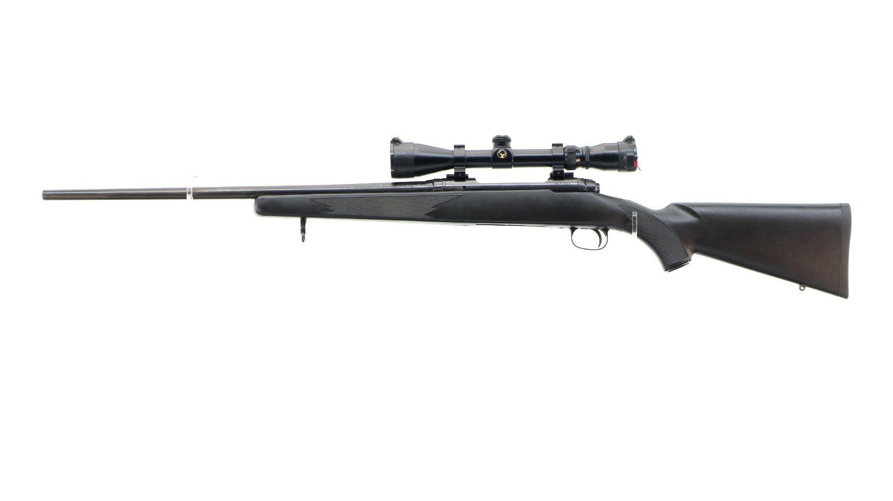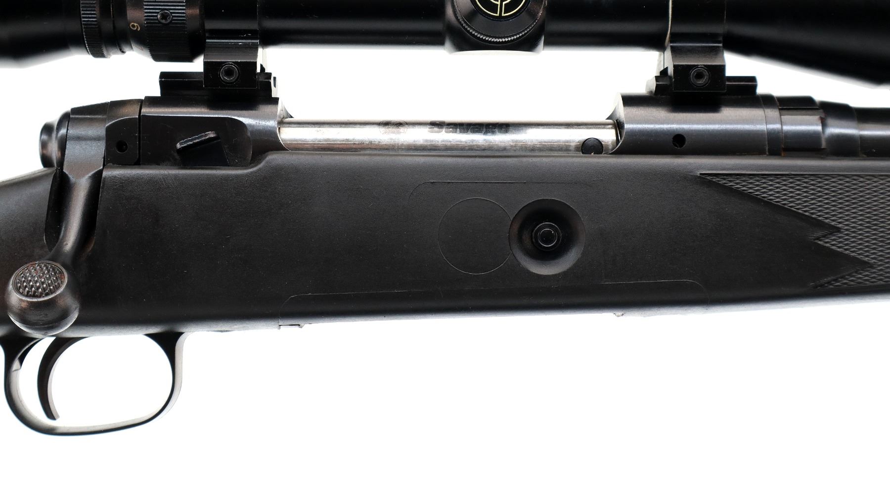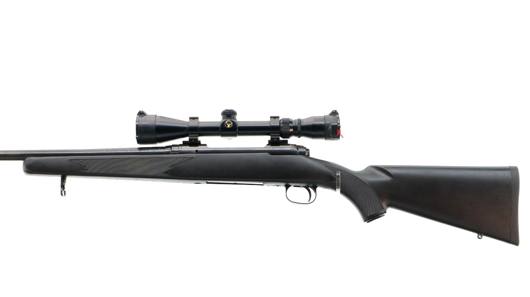 Main Description: No sights, blued finish, receiver drilled and tapped with Simmons 8.3-9x40 scope installed, clear optics with duplex crosshair. Checkered bolt knob, tang safety. One piece black synthetic stock, checkered forearm and pistol grip, black rubber recoil pad, grip cap, non accu trigger, missing front action screw, sling swivels, sling is missing one Chicago screw.