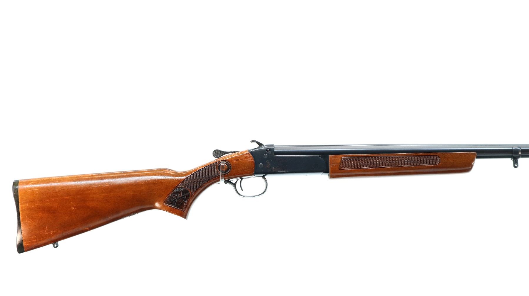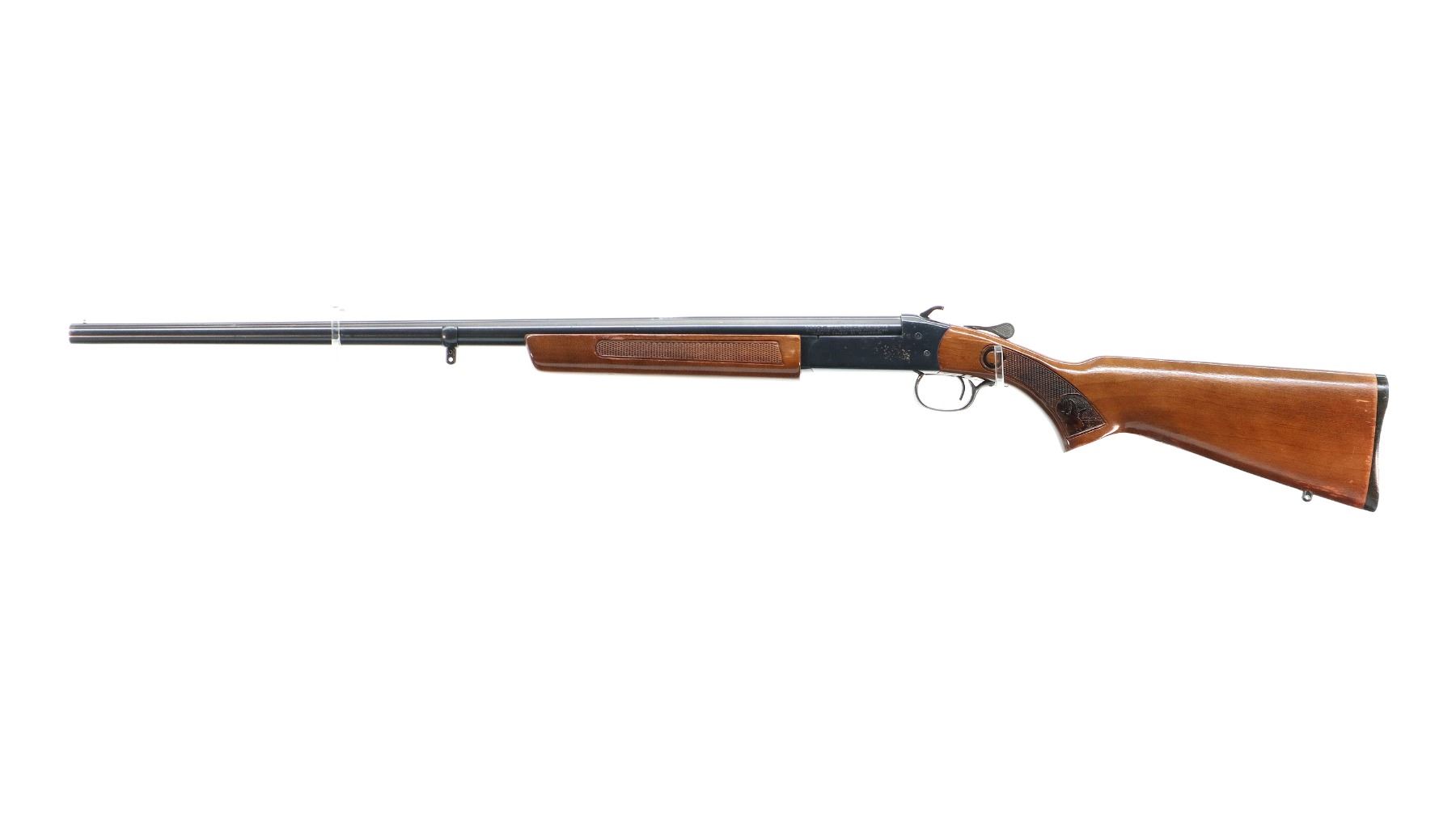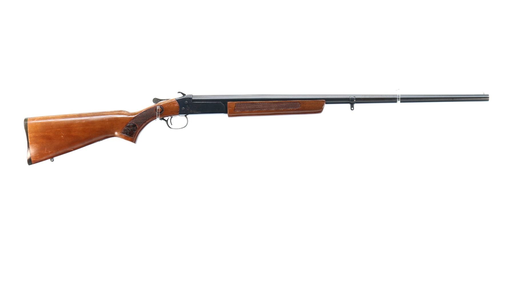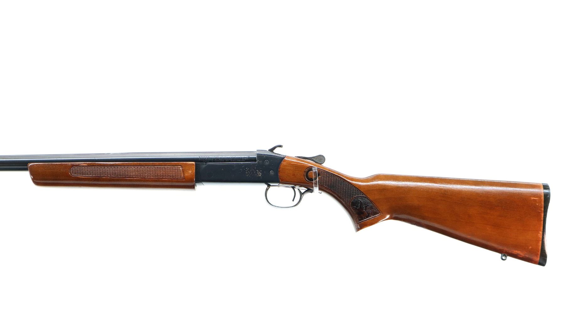 Main Description: Brass bead, blued finish, round barrel, grooved spur hammer, ejector. Two piece wood stocks, checkered forearm and pistol grip, grooved black polymer butt plate, swivel studs.