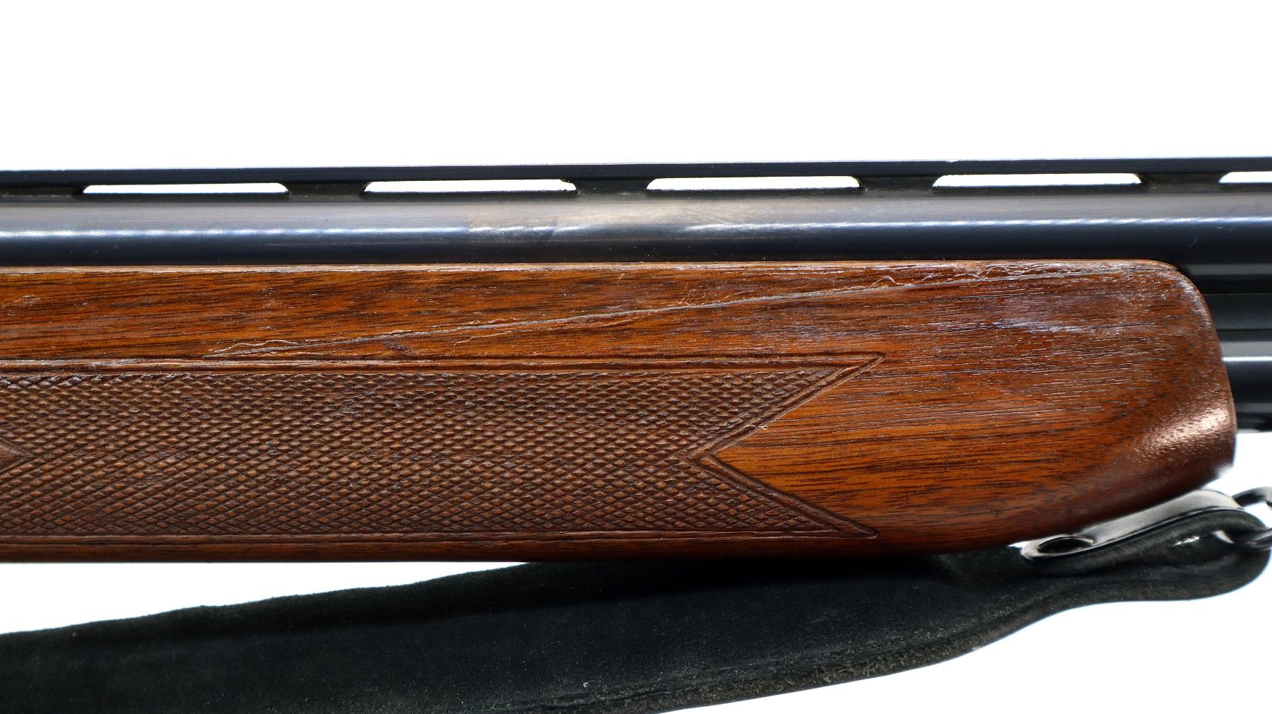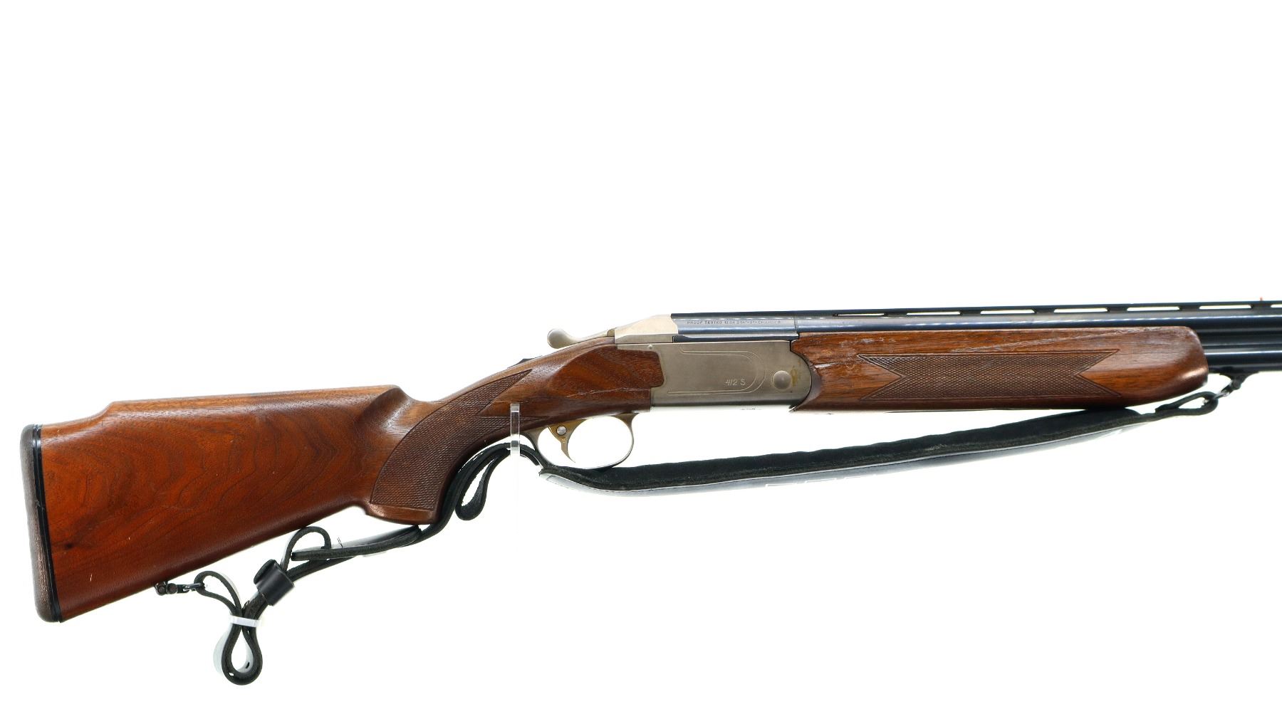 Main Description: Red fiber optic front and mid rib beads, blued vent rib barrel, stainless receiver, automatic safety, cocking indicators, ejectors, single gold selective mechanical trigger. Two piece wood stocks, checkered forearm which has been cracked and repaired, checkered pistol grip with right hand palm swell cracked through wrist, raised comb, brown rubber recoil pad, 14" LOP, sling swivels with black leather Tikka sling.