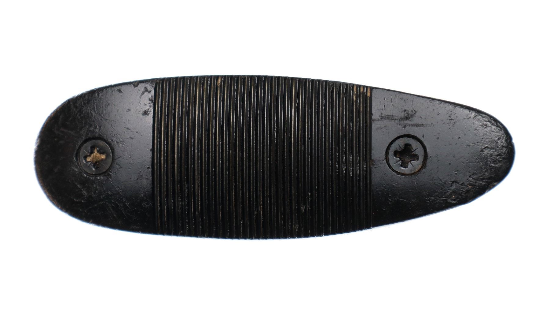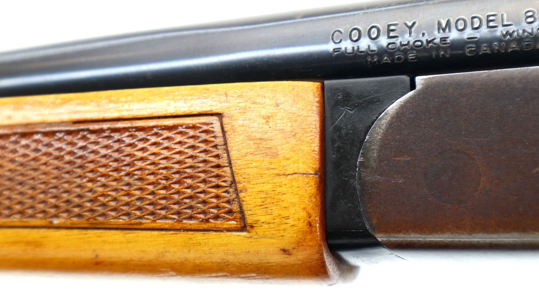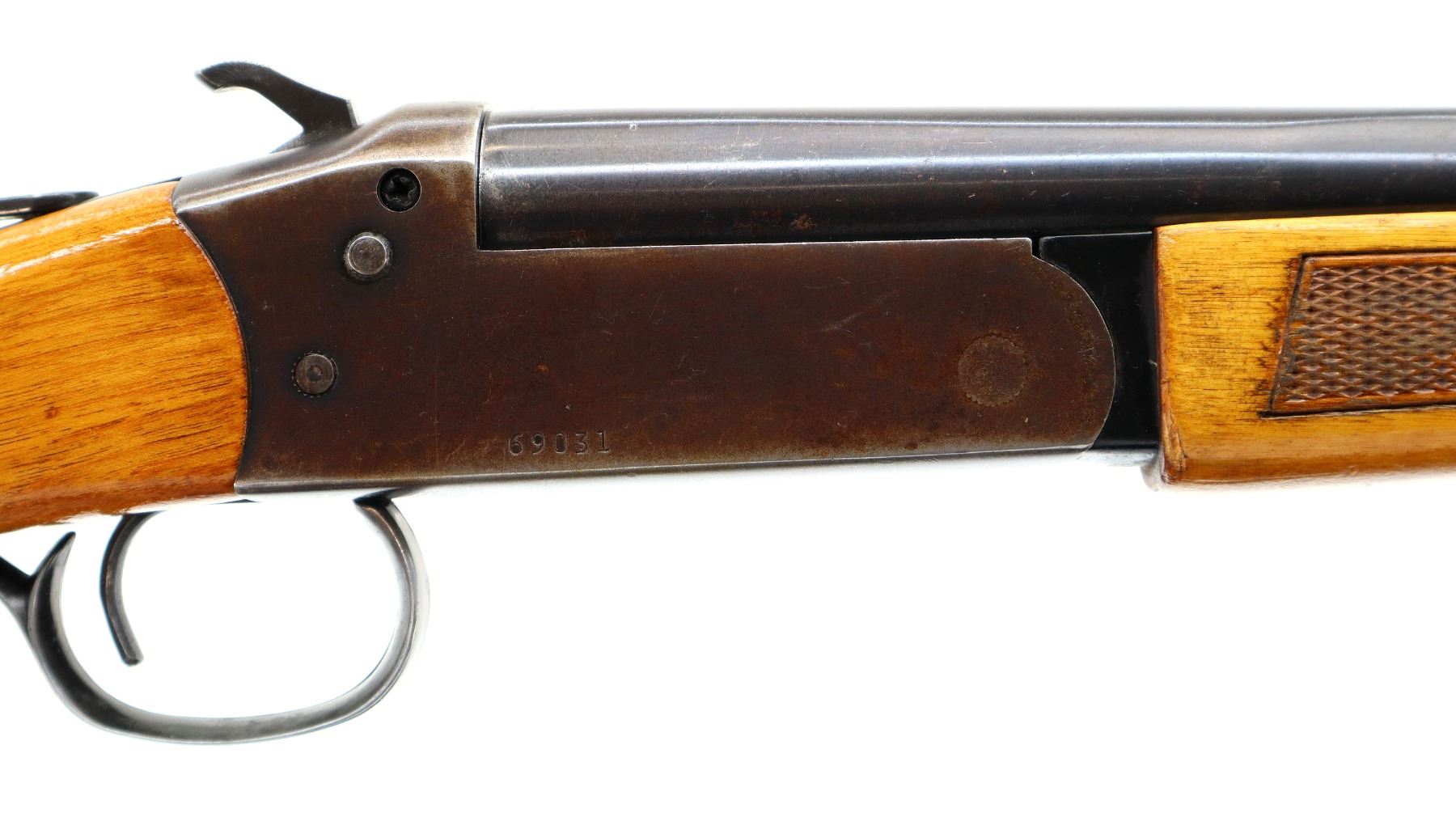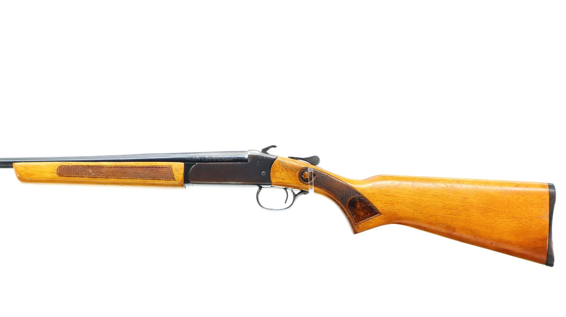 Main Description: Brass bead, blued finish, round barrel, grooved spur hammer, ejector. Two piece wood stocks, checkered forearm with small chip and crack, checkered pistol grip cracked behind lower tang, grooved black polymer butt plate.
