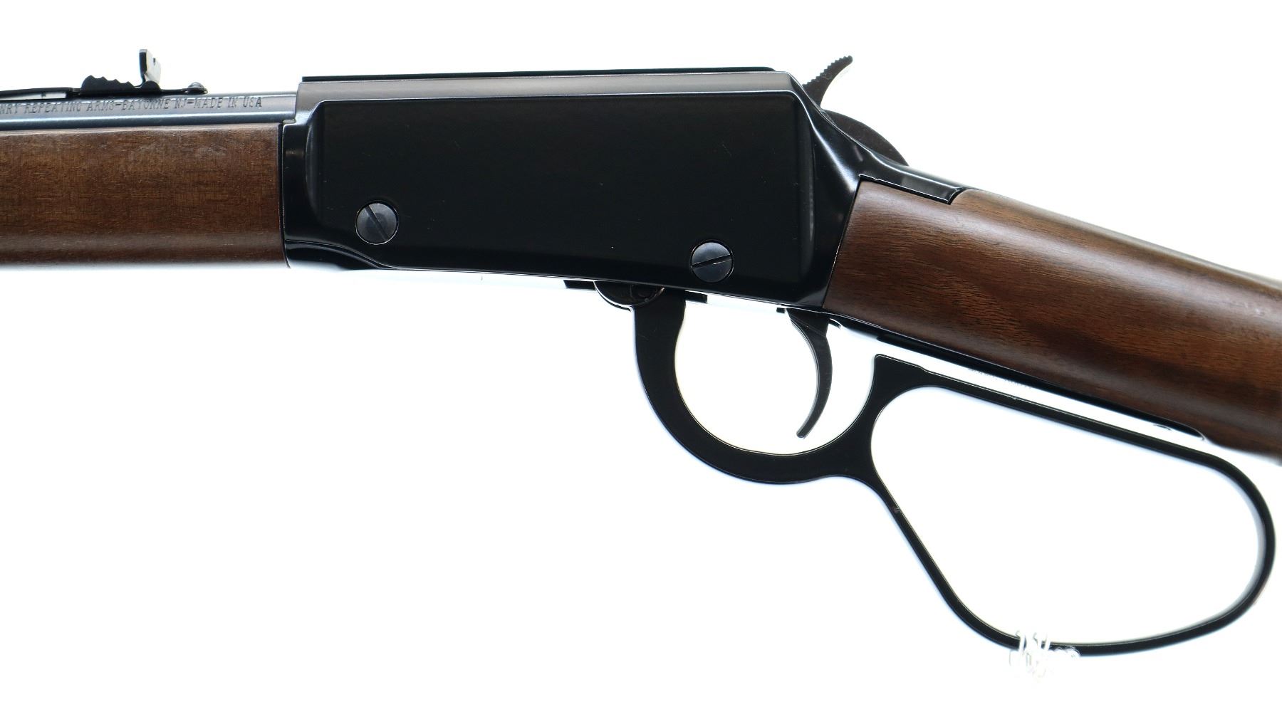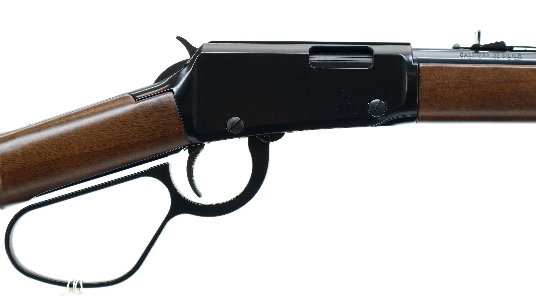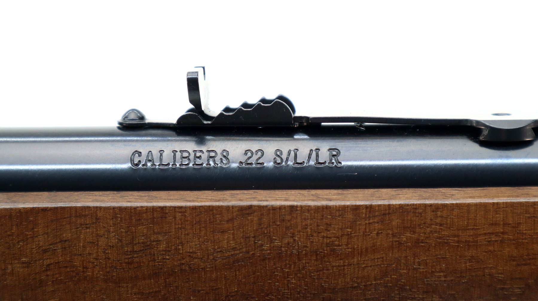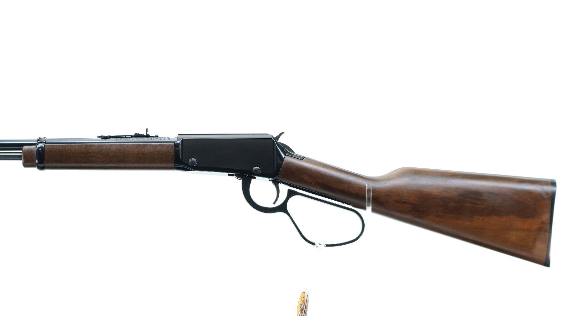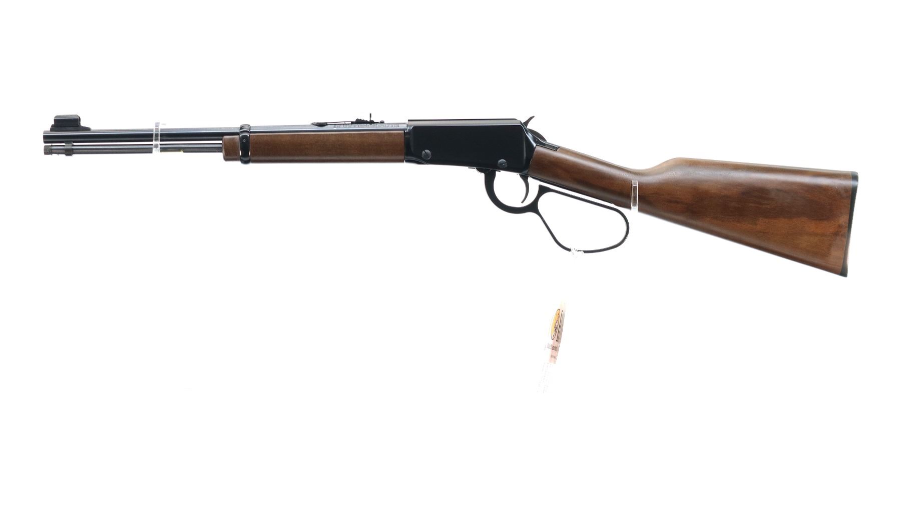 Main Description: Blade front sight with hood and ramp, adjustable u notched rear sight, blued barrel and outer magtube, grooved black finish receiver, spur hammer. Two piece wood stocks, straight grip, checkered black polymer butt plate, large loop lever, retains factory hang tags.