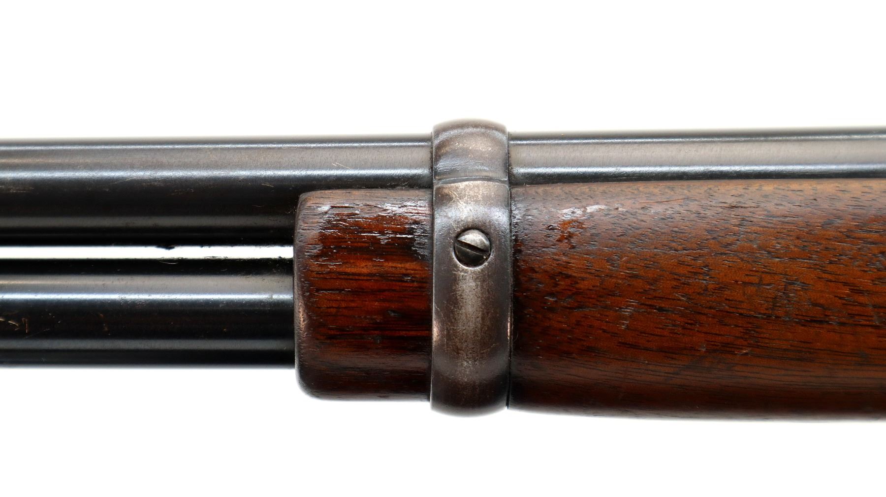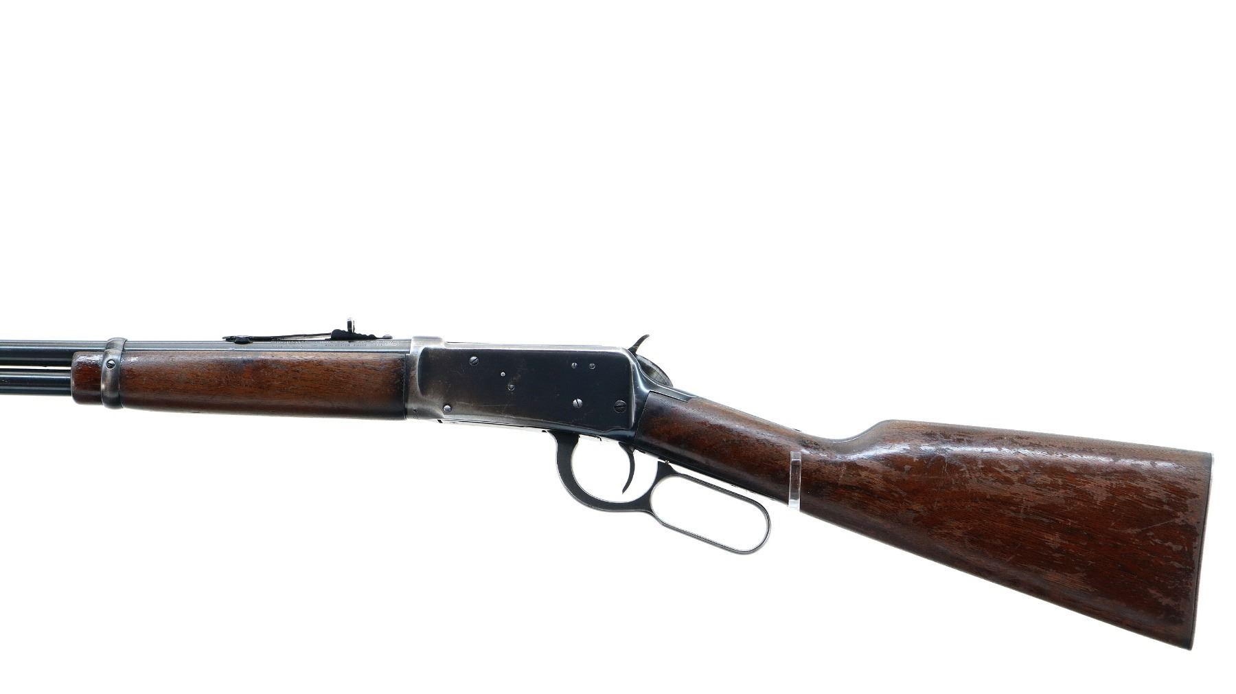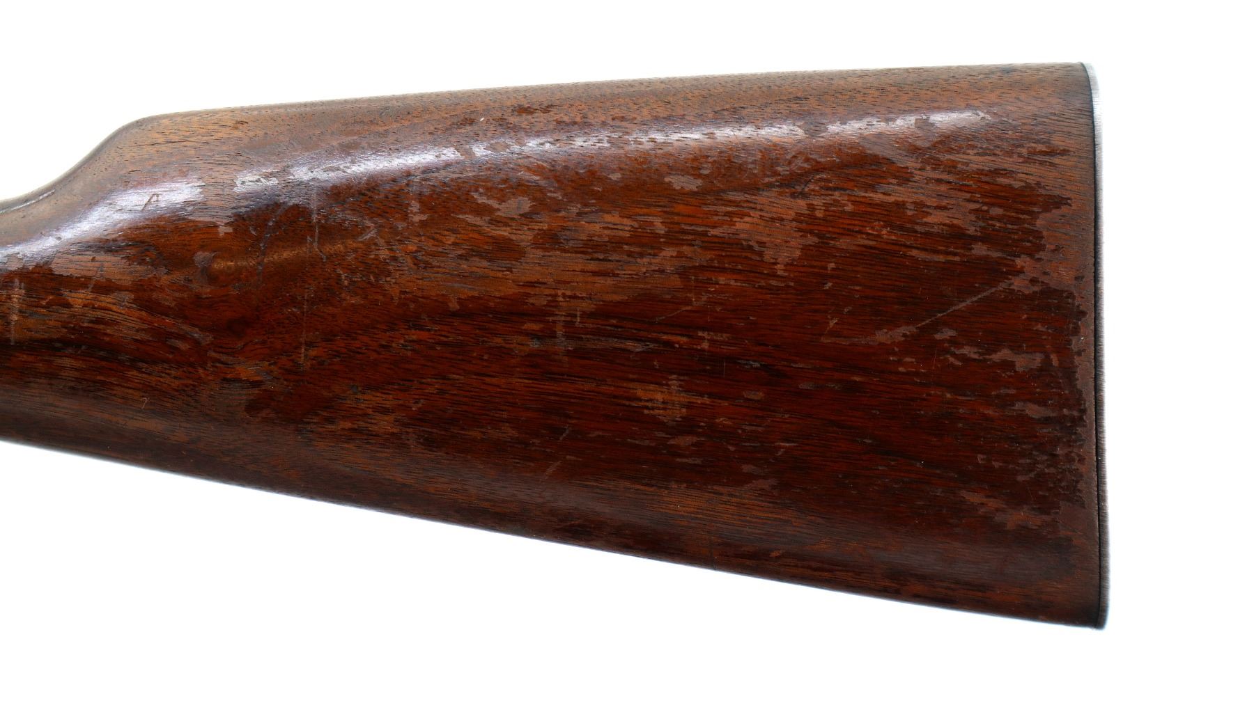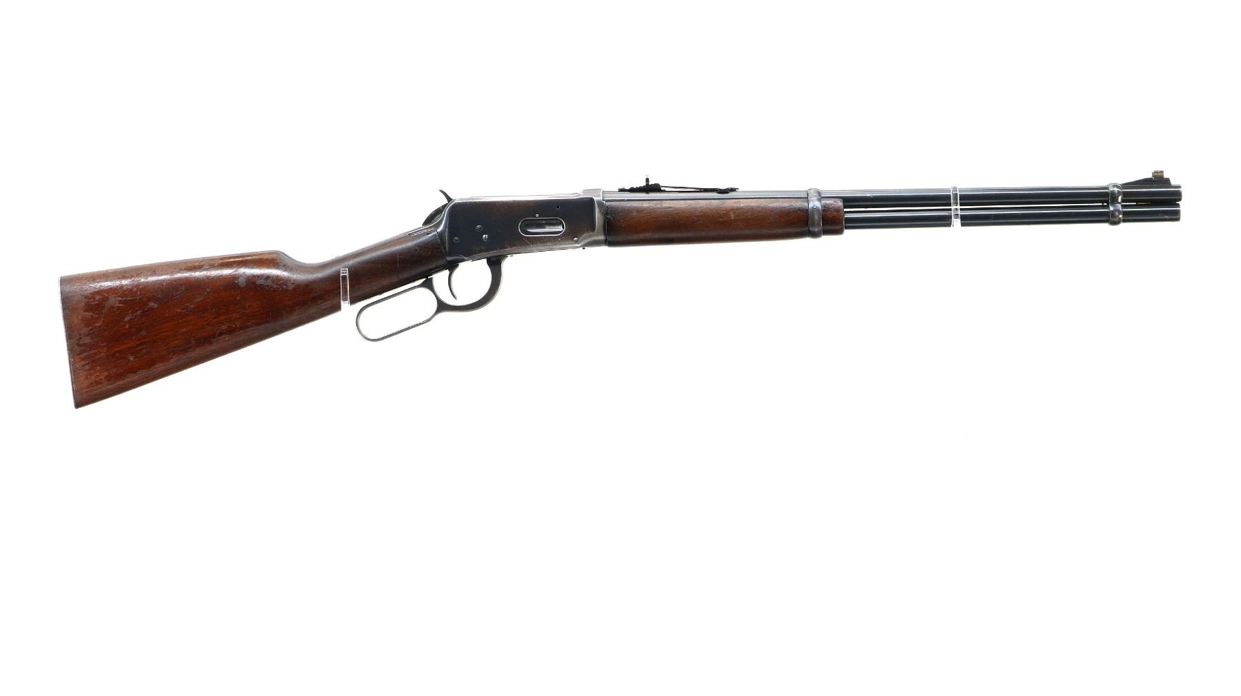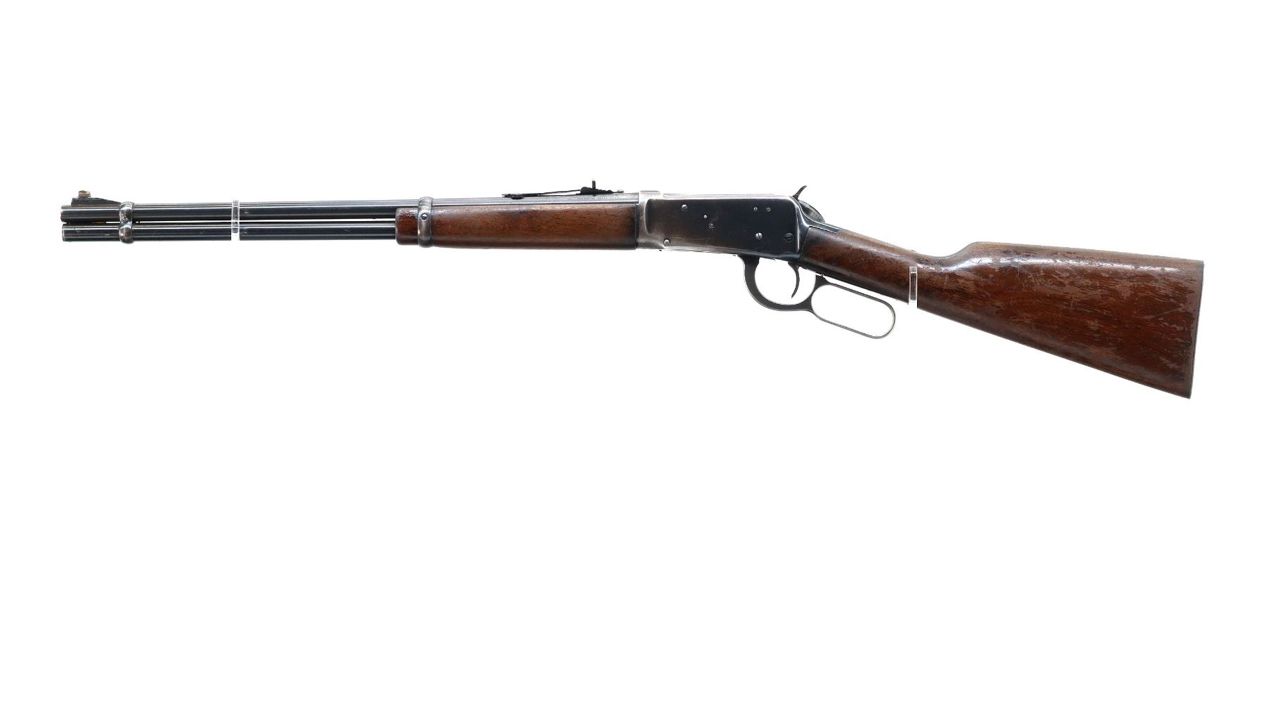 Main Description: Manufactured 1953. Blade front sight with ramp, replaced adjustable u notched rear sight, blued finish, grooved spur hammer. Two piece wood stocks, straight grip, checkered steel butt plate, full length magtube.