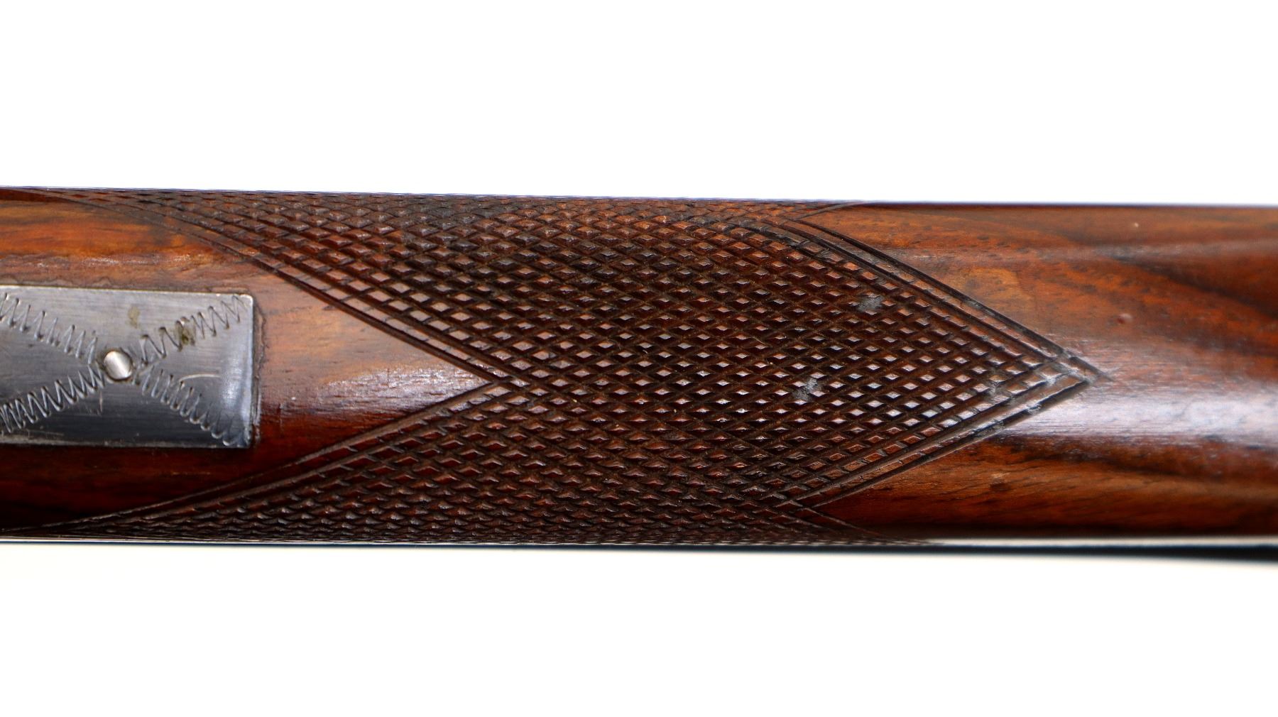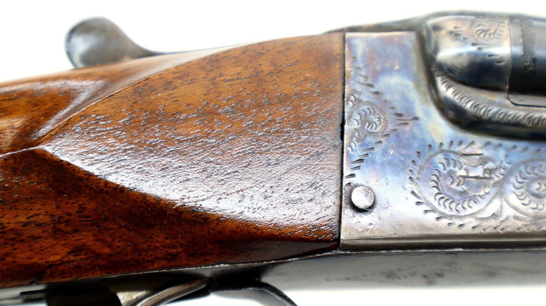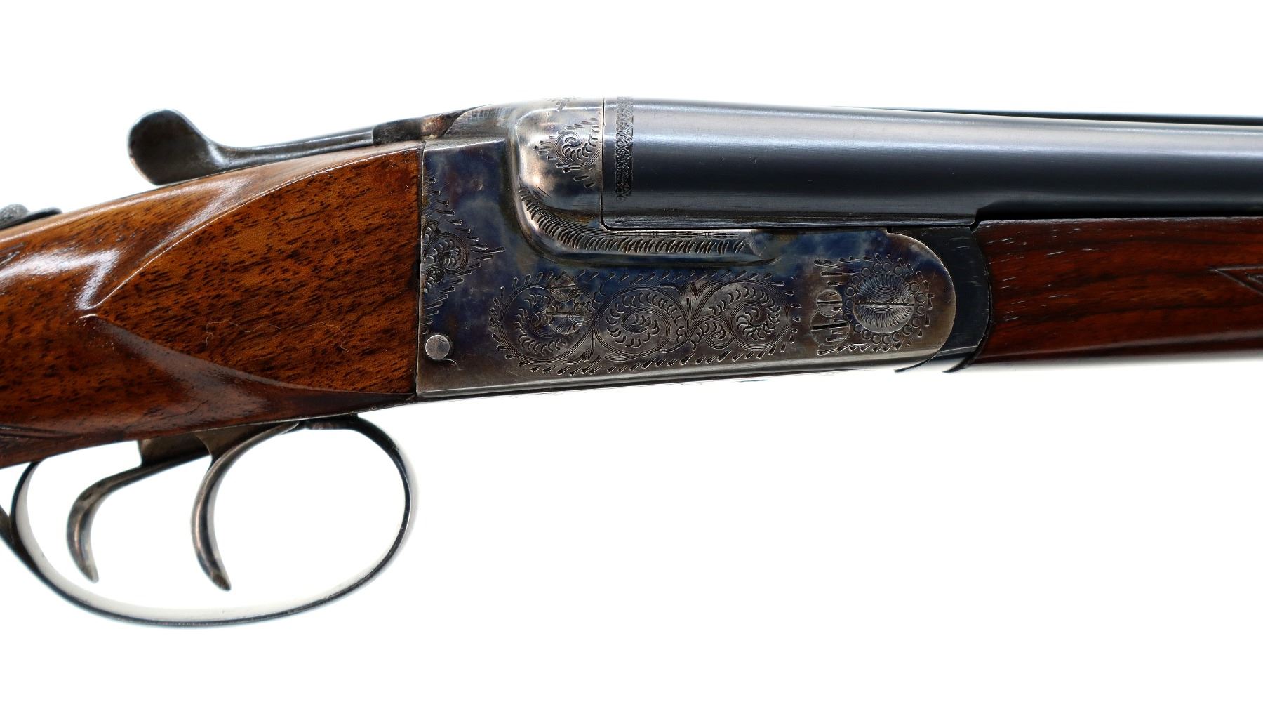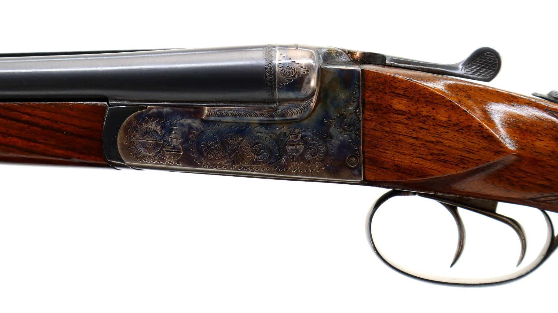 Main Description: Silver bead, blued barrels with raised rib, engraved colour case hardened receiver, manual safety, extractor, double triggers. Two piece wood stocks, checkered forearm cracked and repaired at tip, checkered pistol grip, black rubber recoil pad, 15.25" LOP, grip cap, vanity plate, swivel studs.