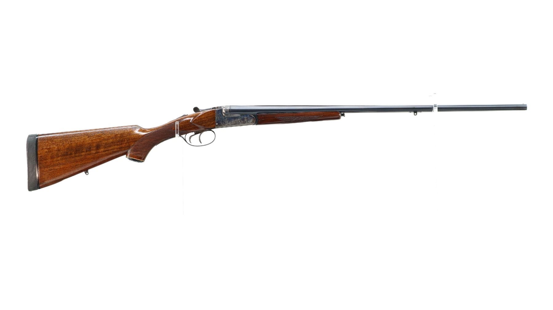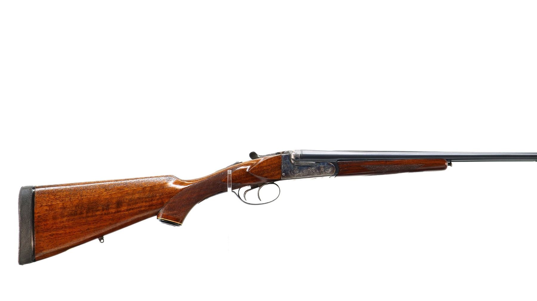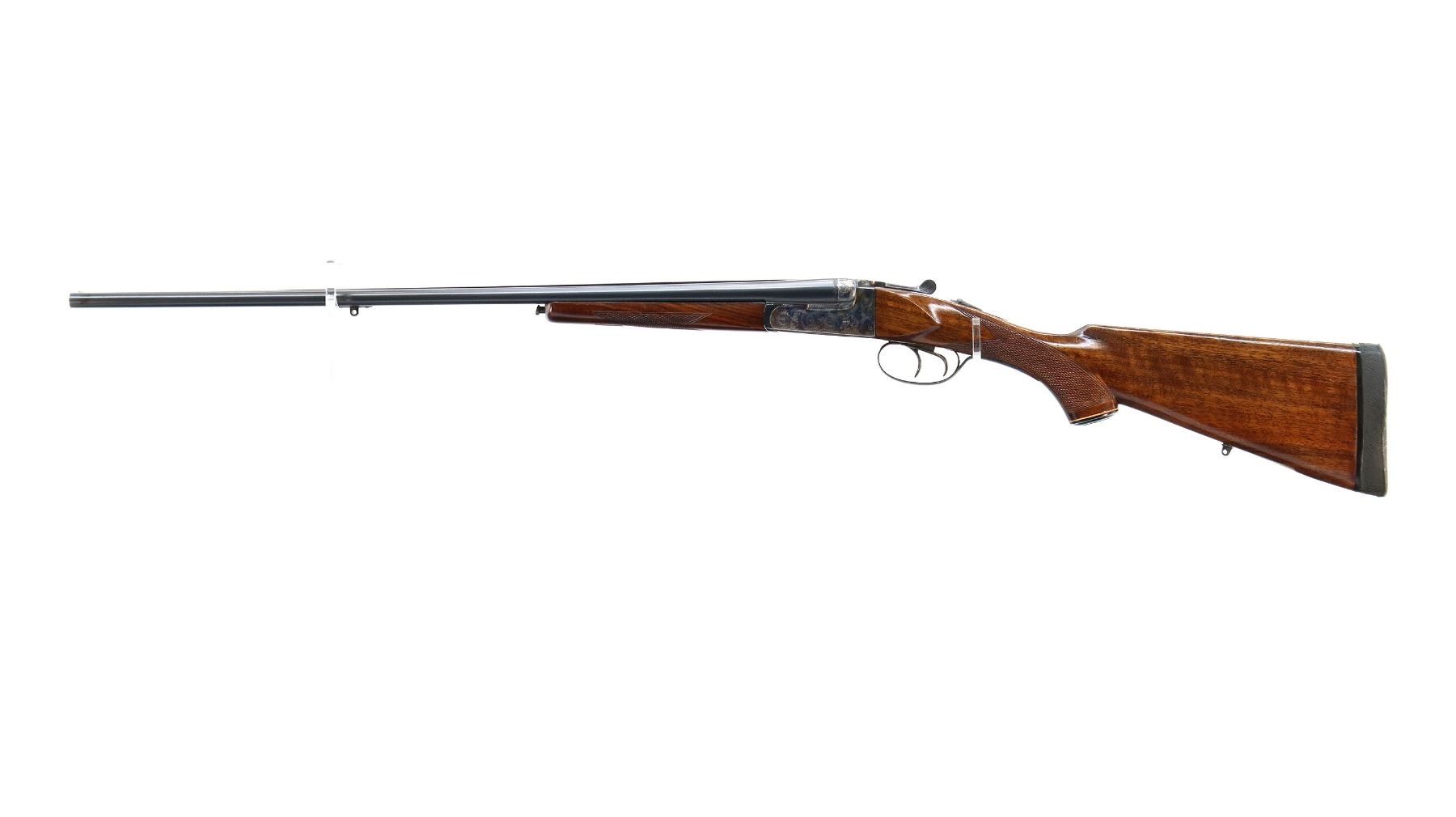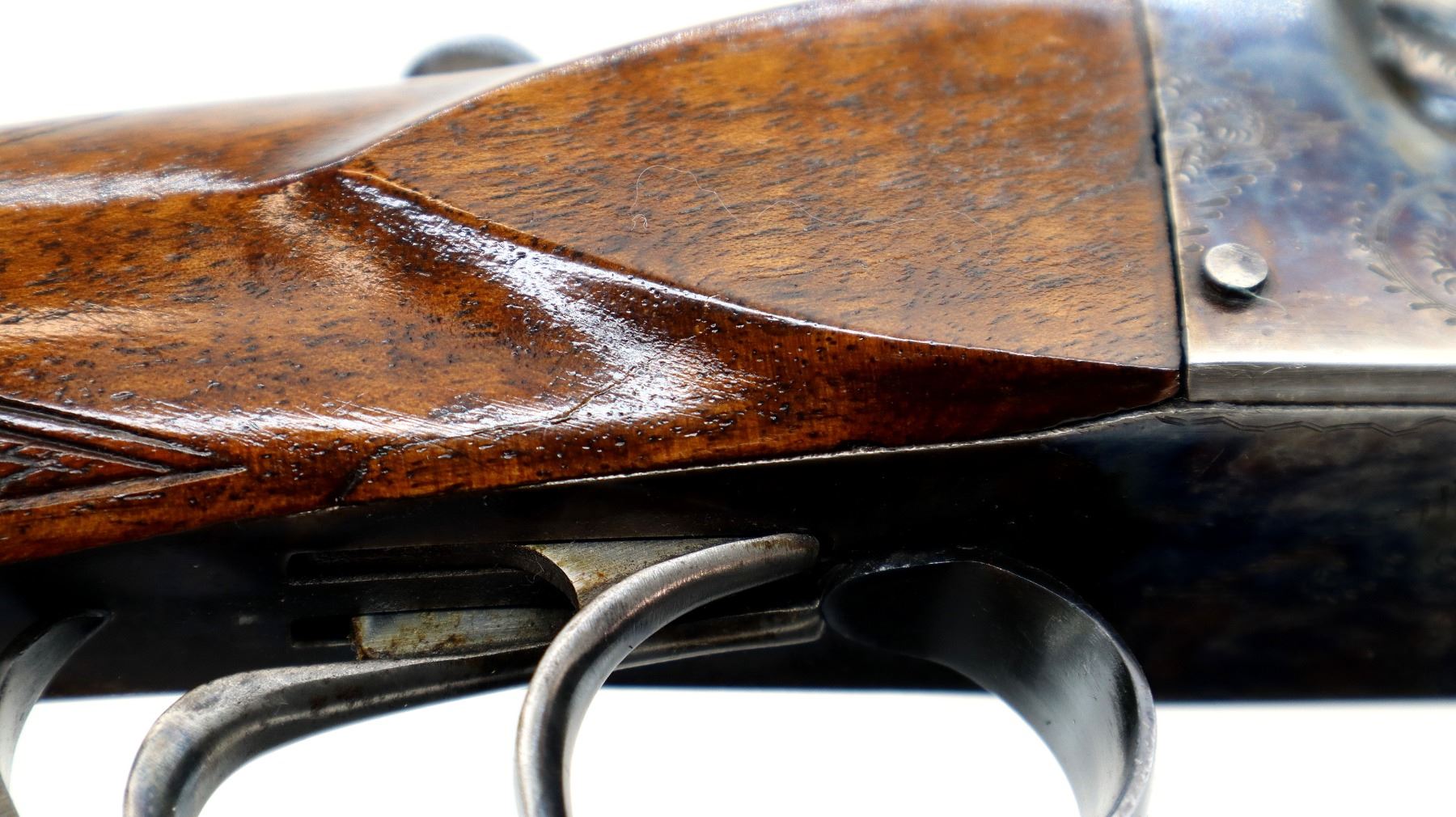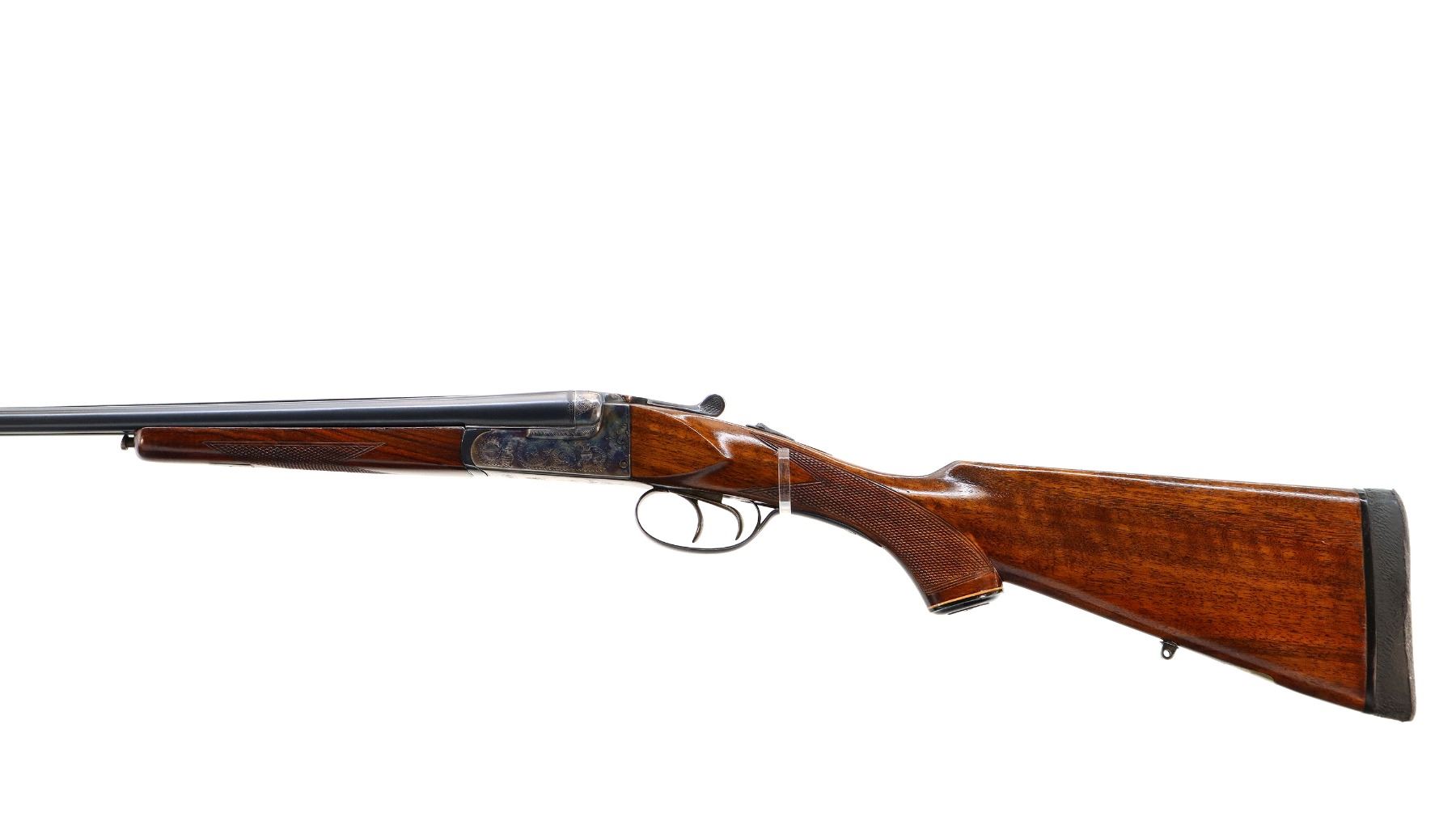Main Description: Silver bead, blued barrels with raised rib, engraved colour case hardened receiver, manual safety, extractor, double triggers. Two piece wood stocks, checkered forearm cracked and repaired at tip, checkered pistol grip, black rubber recoil pad, 15.25" LOP, grip cap, vanity plate, swivel studs.