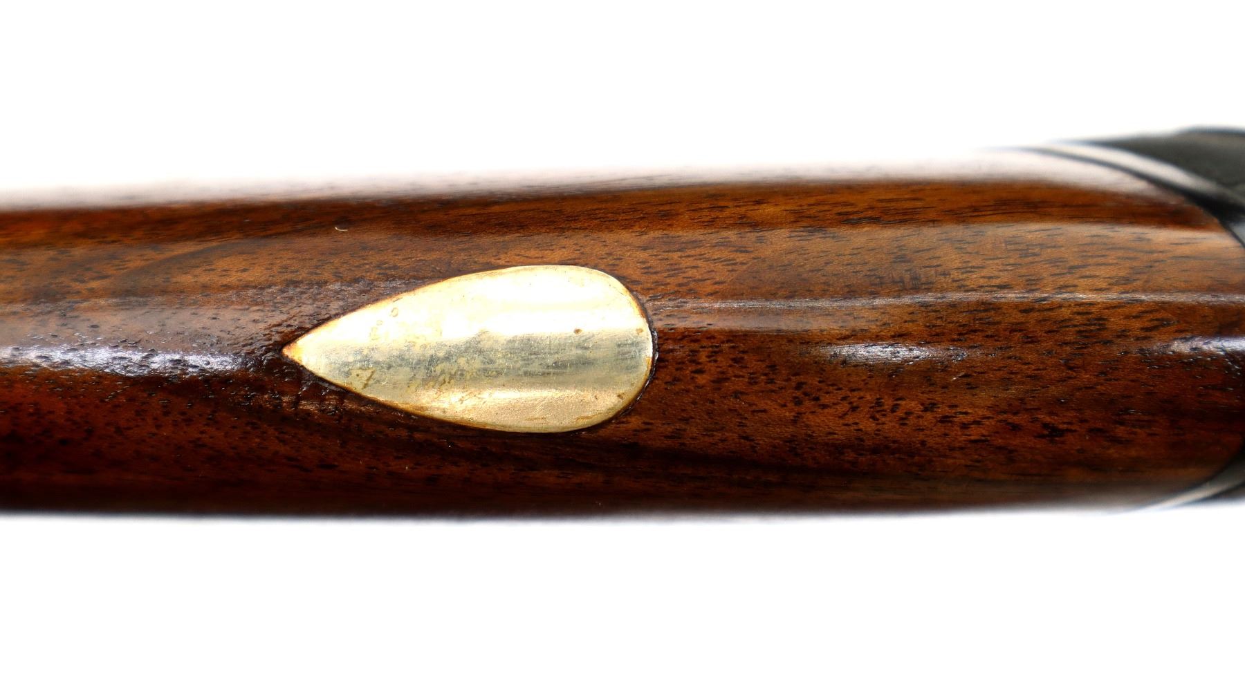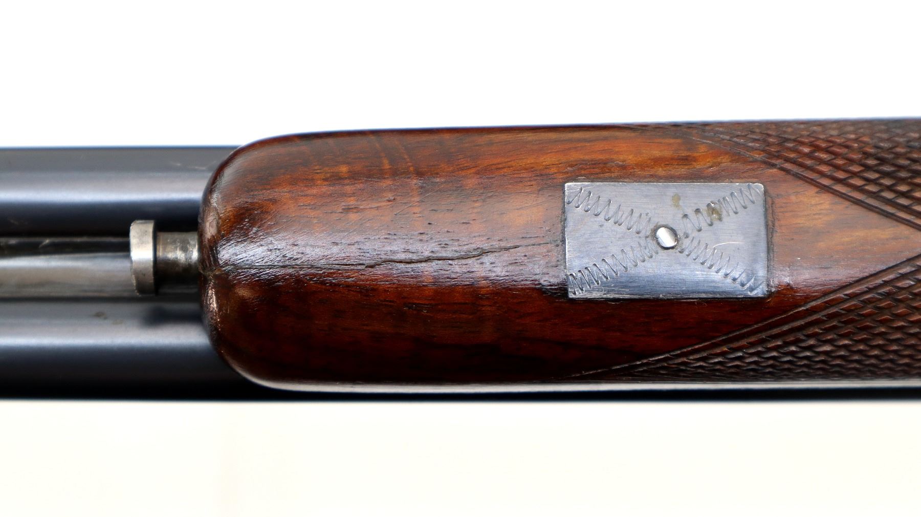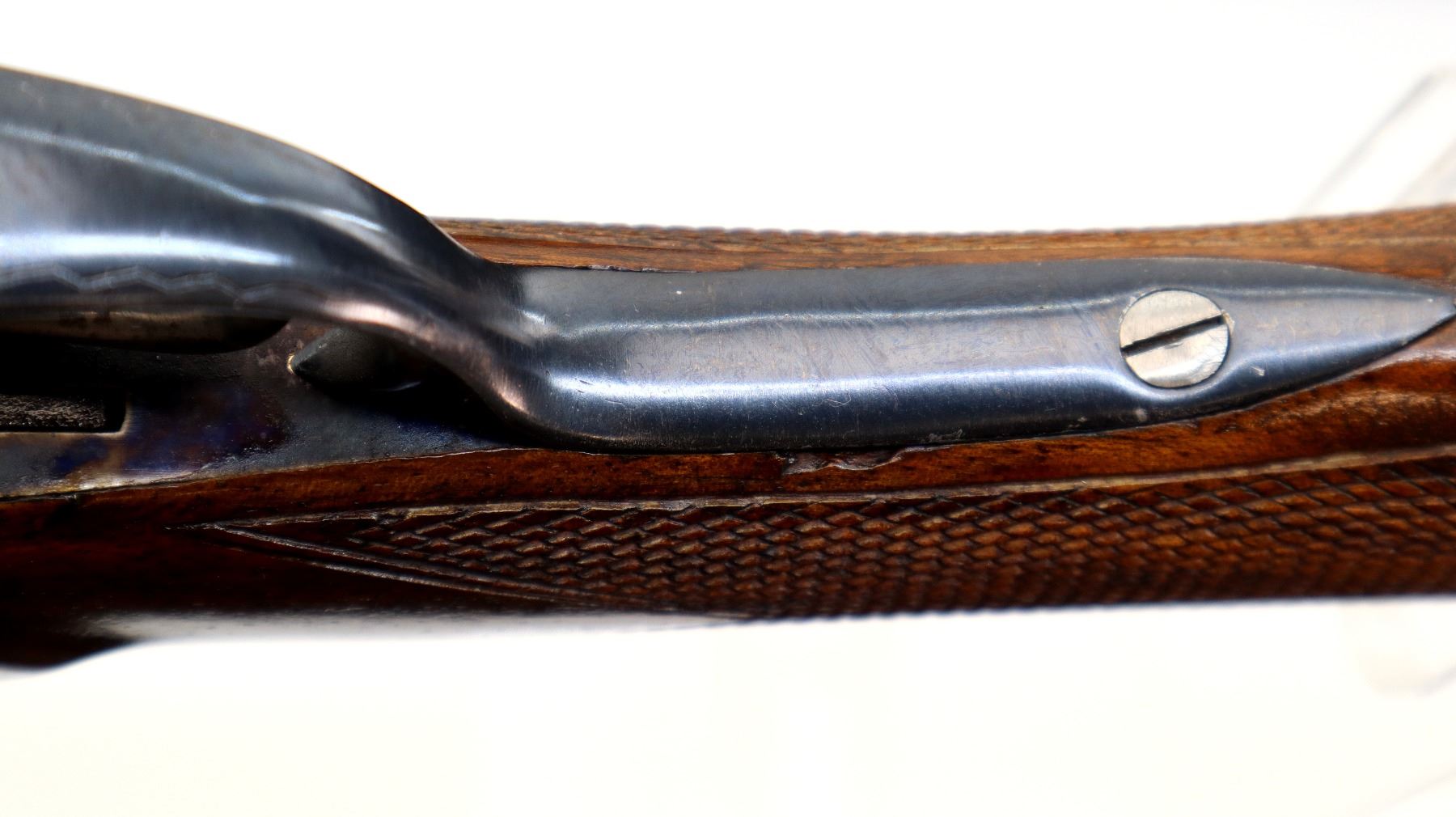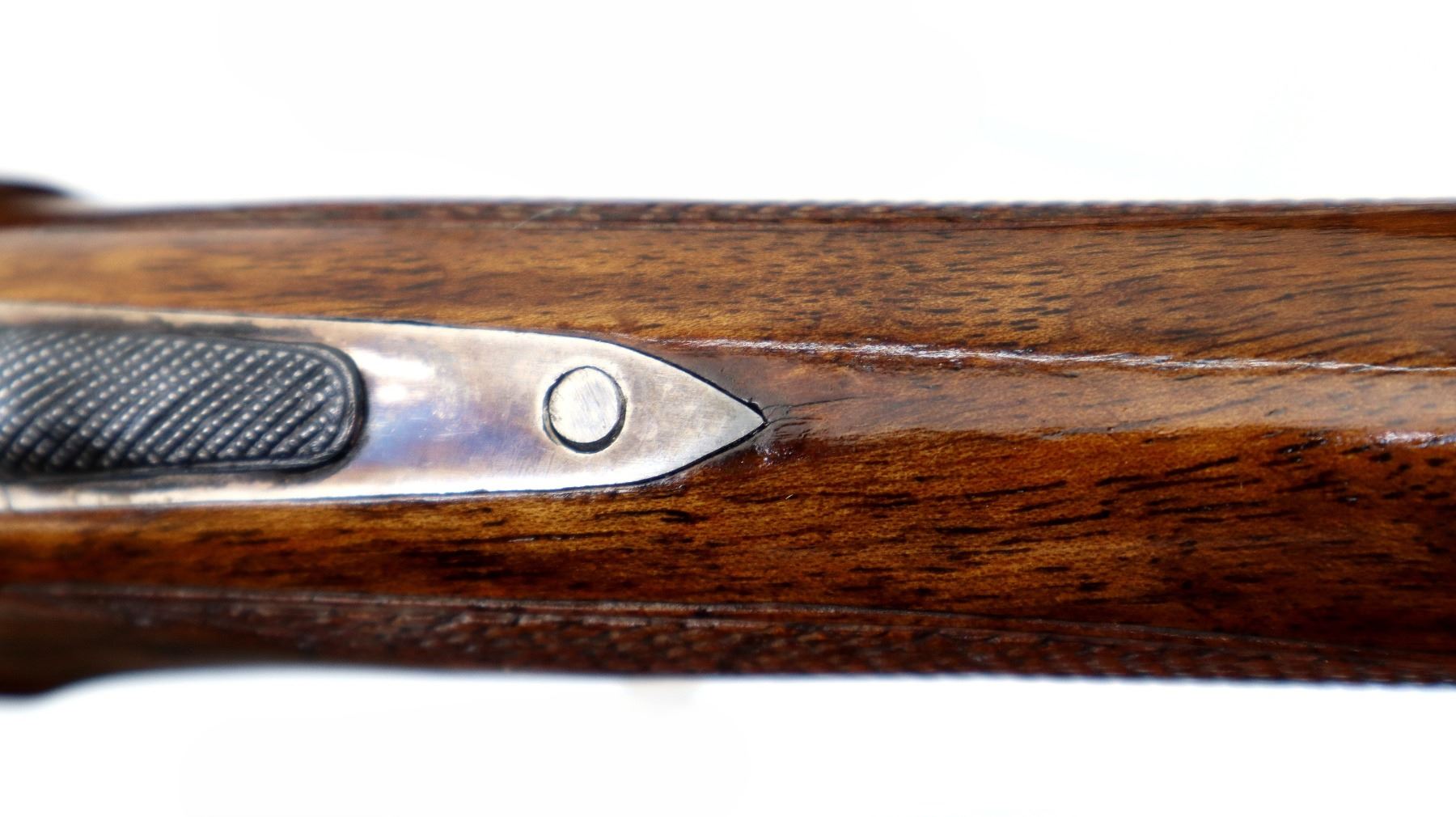 Main Description: Silver bead, blued barrels with raised rib, engraved colour case hardened receiver, manual safety, extractor, double triggers. Two piece wood stocks, checkered forearm cracked and repaired at tip, checkered pistol grip, black rubber recoil pad, 15.25" LOP, grip cap, vanity plate, swivel studs.