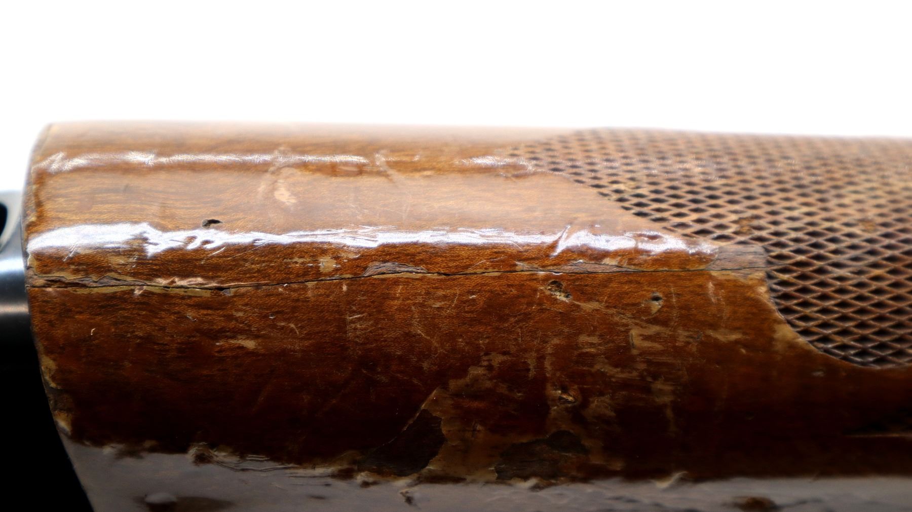 Main Description: Silver bead, blued finish, vent rib, engraved receiver and bolt. Two piece wood stocks, checkered forearm which is cracked, checkered pistol grip, black vented rubber recoil pad, 14" LOP, grip cap.