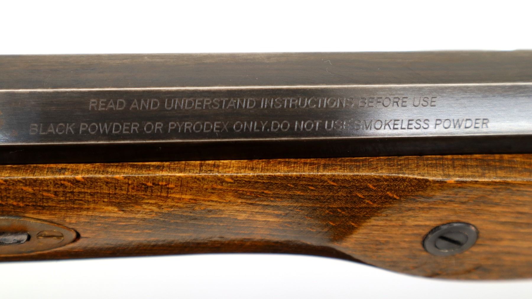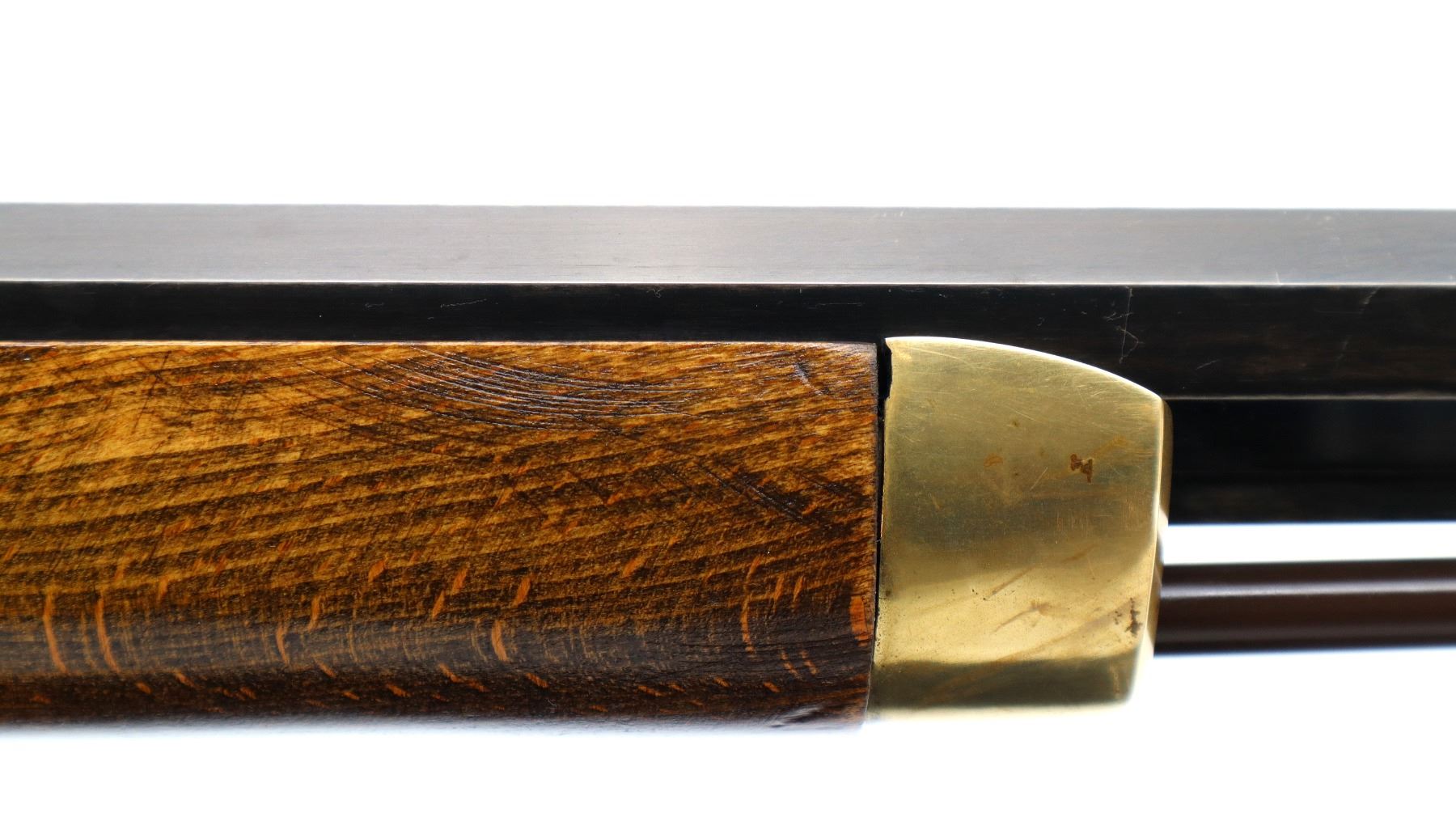 Main Description: Blade front sight with ramp, adjustable u notched rear sight, blued octagon barrel, colour case hardened lock and grooved spur hammer that functions, double set triggers. One piece half length wood stock, single forearm wedge, straight grip, smooth curved brass butt plate, patch box, finger rest trigger guard and nose cap. Brown polymer ramrod with brass tip