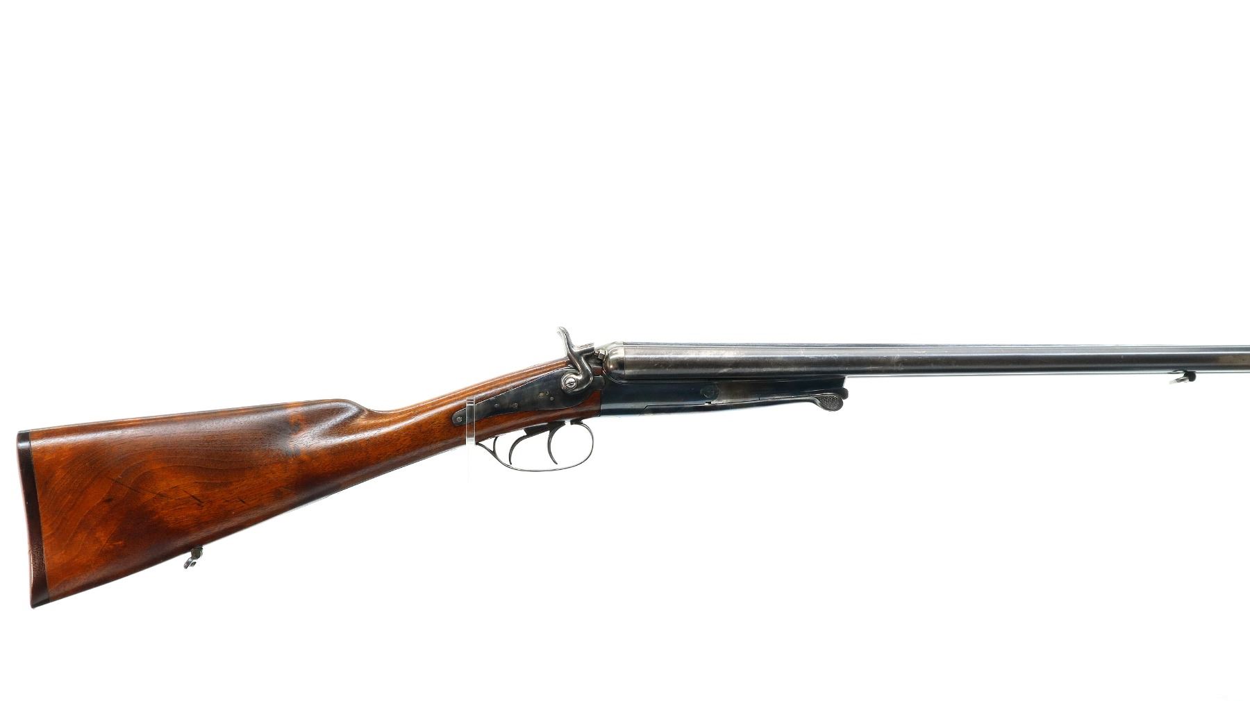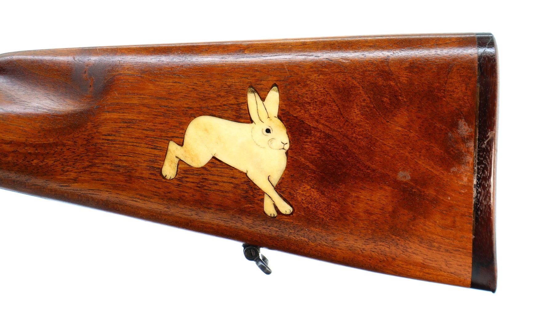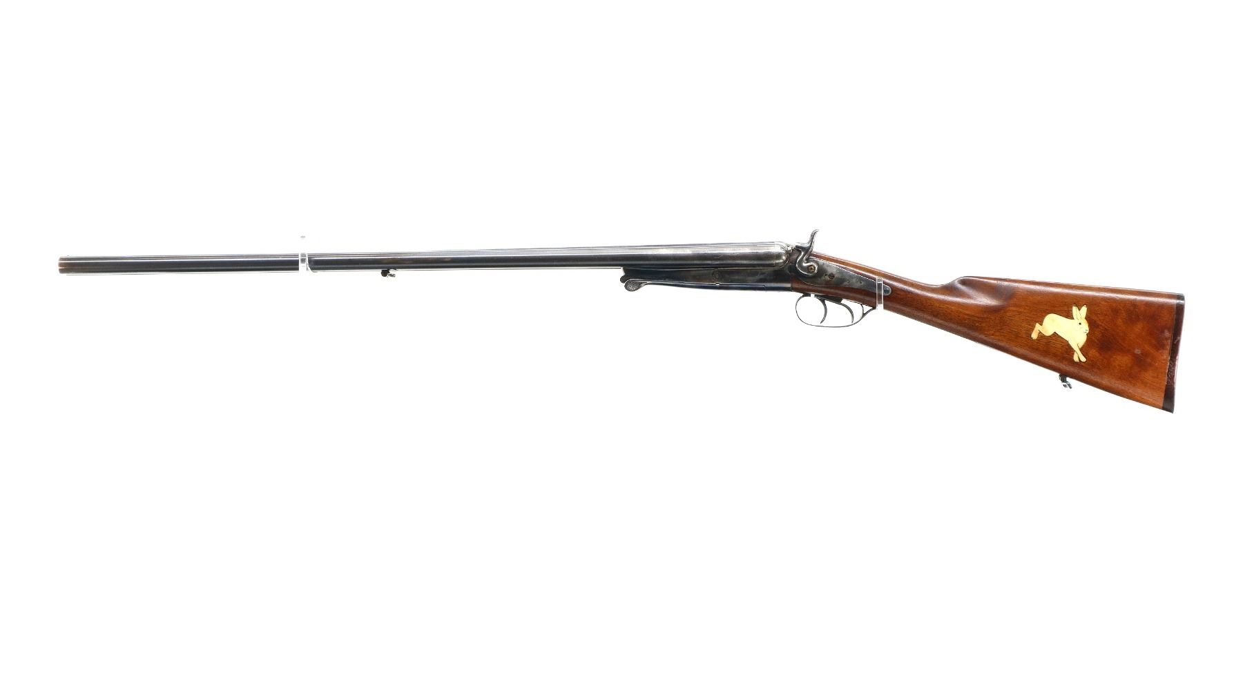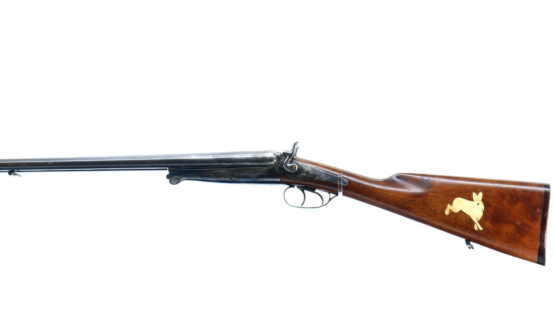 Main Description: Silver bead, blued finish, smooth rib, barrels chime and are tight on face, back action locks with checkered spur hammers that function, extractor, double triggers. One piece wood stock, straight grip, smooth wood butt plate, white rabbit inlay on left side of stock, sling swivels.