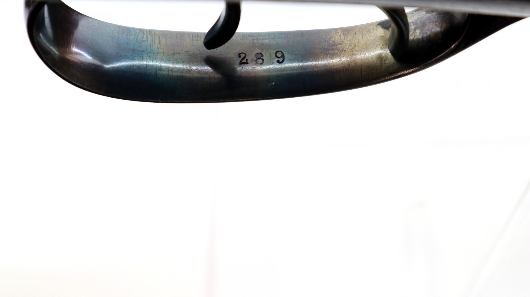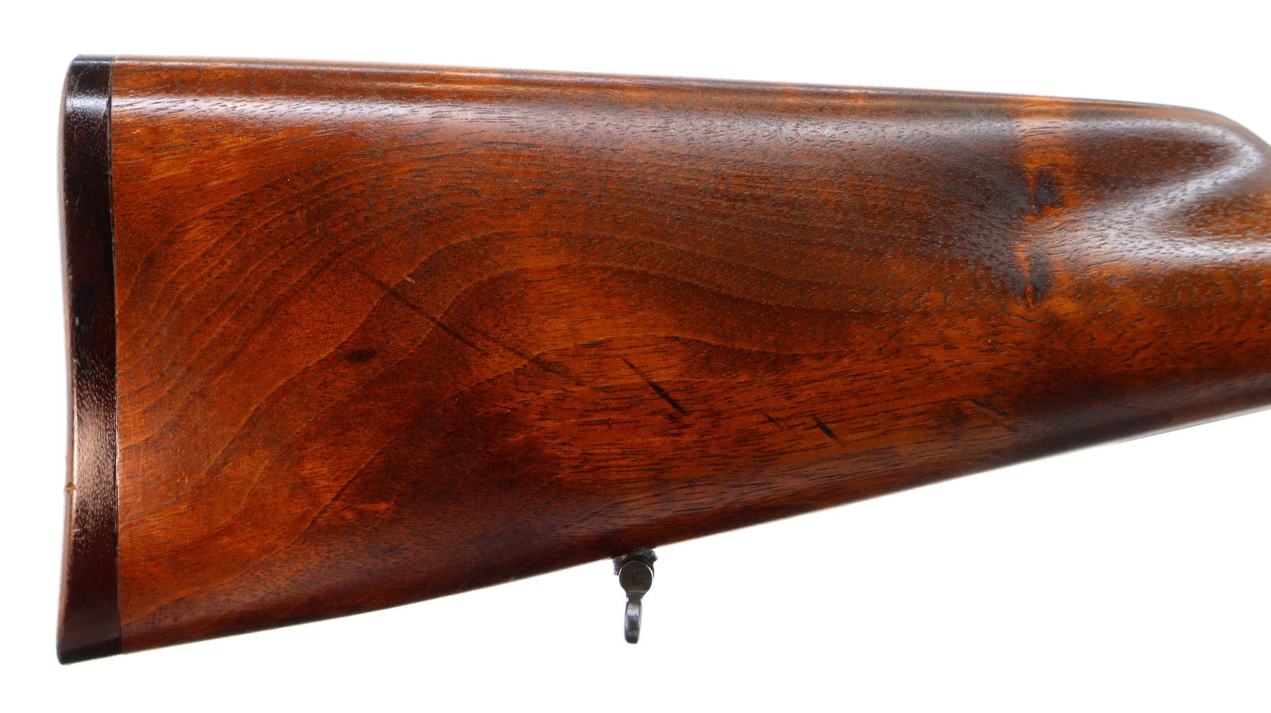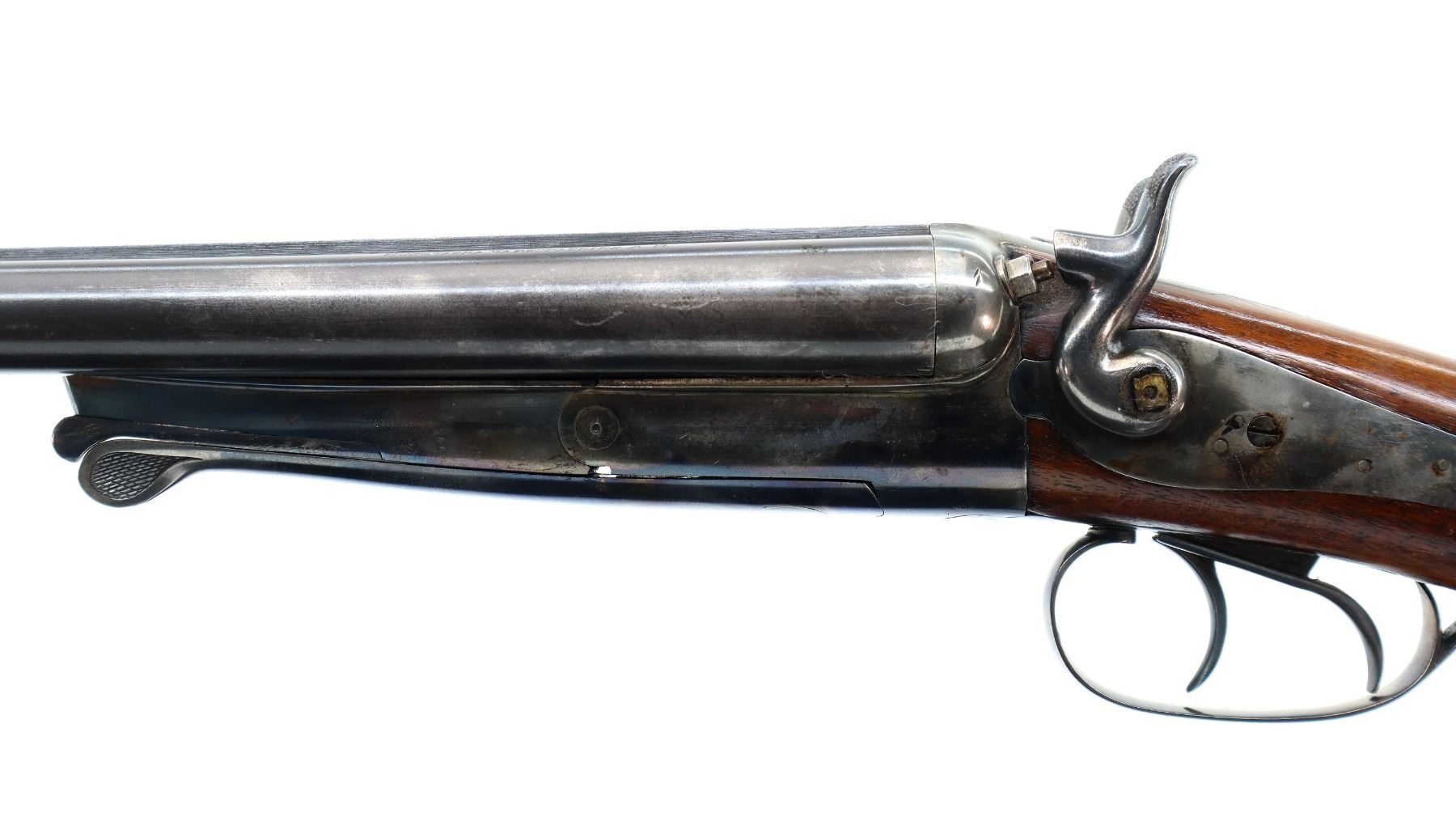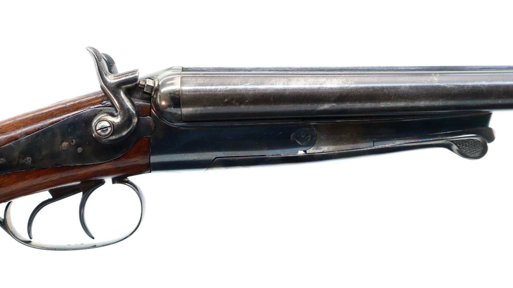 Main Description: Silver bead, blued finish, smooth rib, barrels chime and are tight on face, back action locks with checkered spur hammers that function, extractor, double triggers. One piece wood stock, straight grip, smooth wood butt plate, white rabbit inlay on left side of stock, sling swivels.