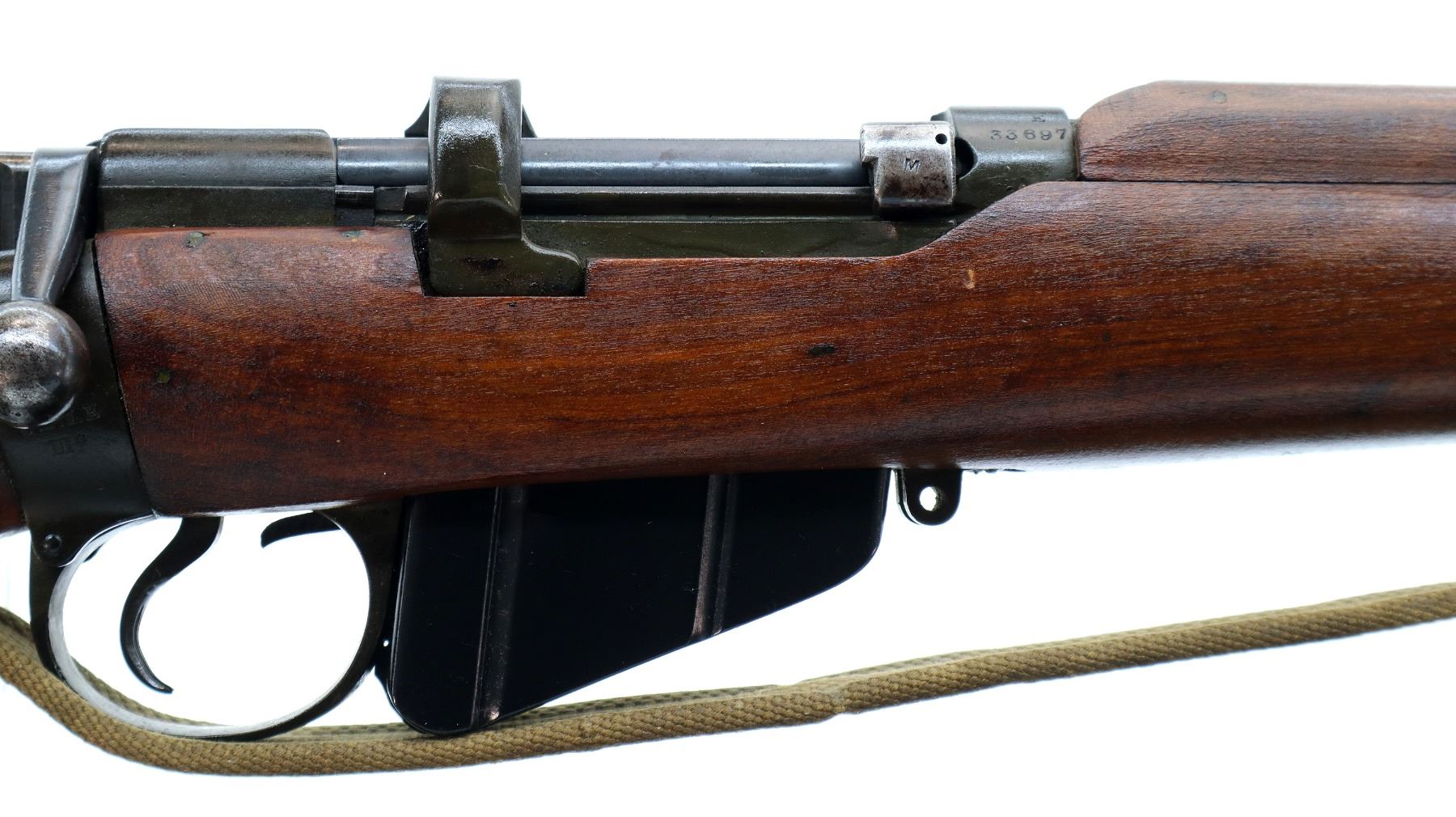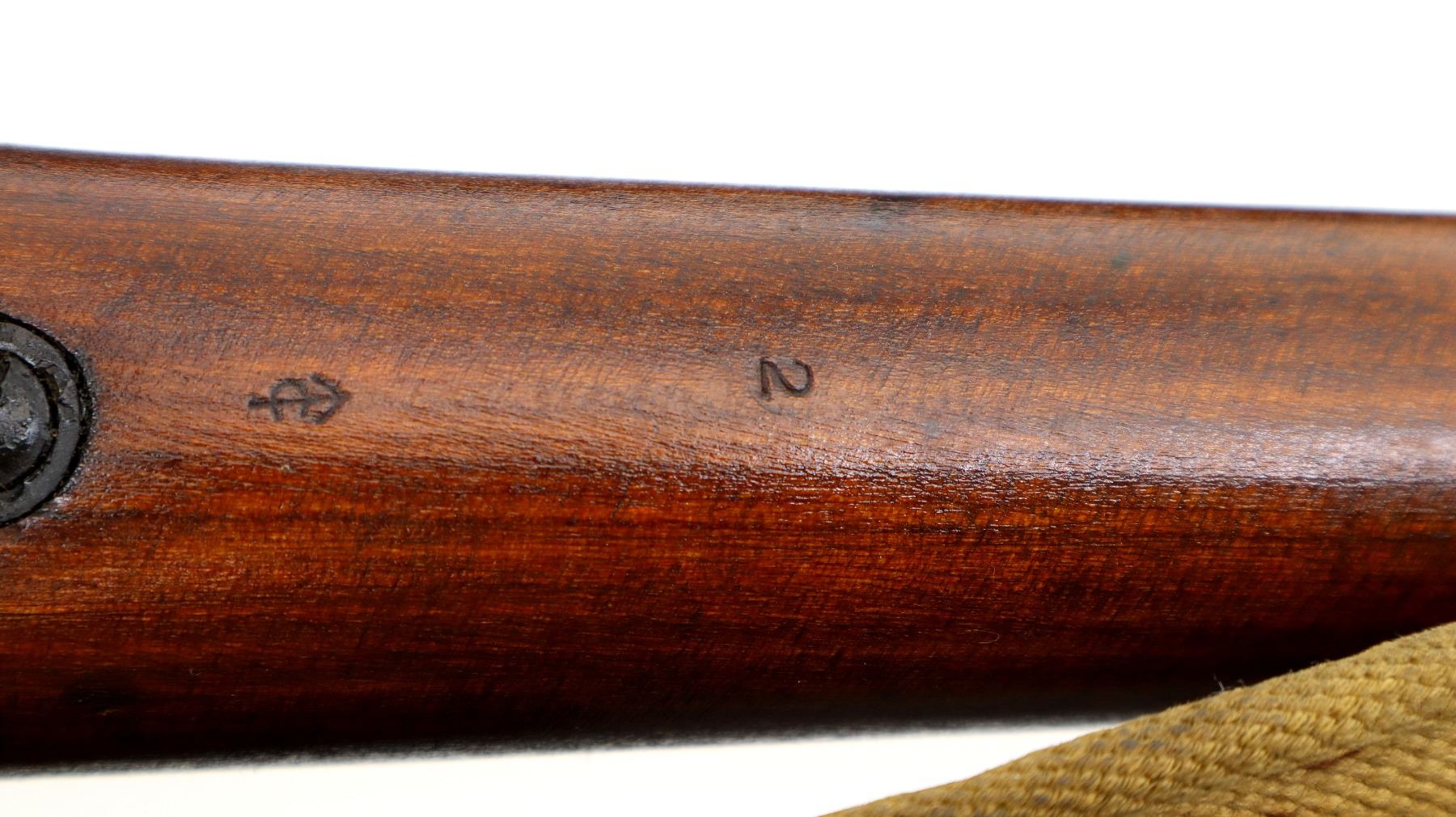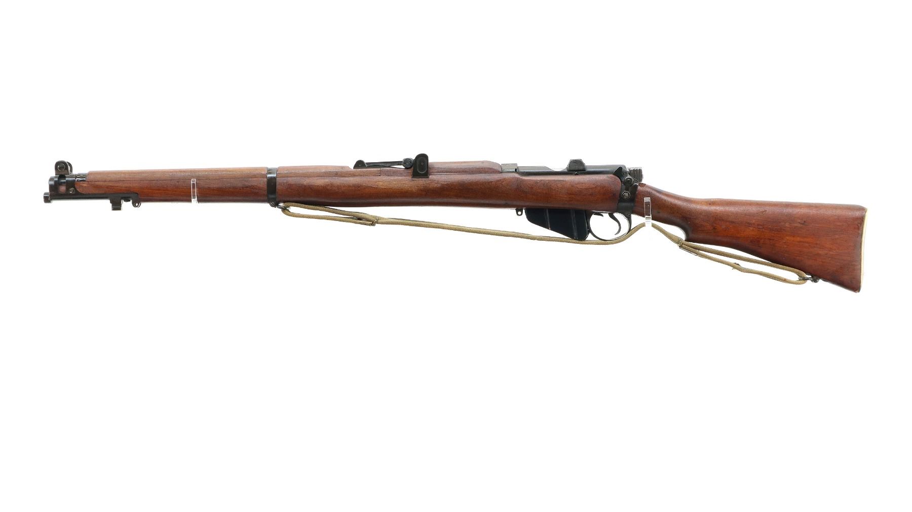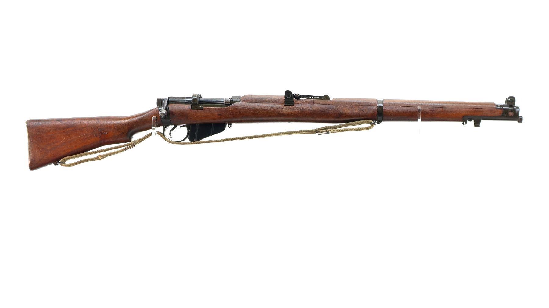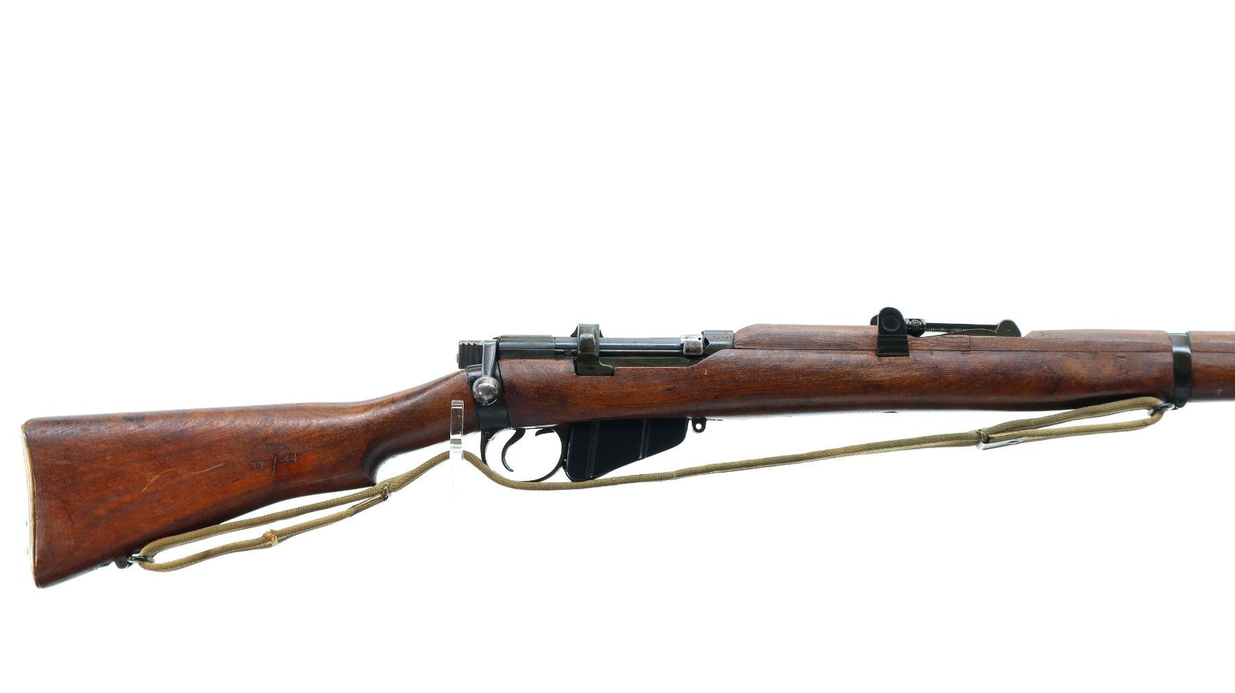 Main Description: Manufactured by BSA Co 1917, bolt mismatched, nose cap and forearm not numbered. Blade front sight with ears and ramp, adjustable u notched rear sight with ears, Parkerized metal finish. Four piece full military wood stocks, pistol grip, smooth brass butt plate with trap, Australian MA 11/44 markings on right side of butt, sling swivels with P37 canvas web sling, forearm has Australian proof marks, bayonet lug.
