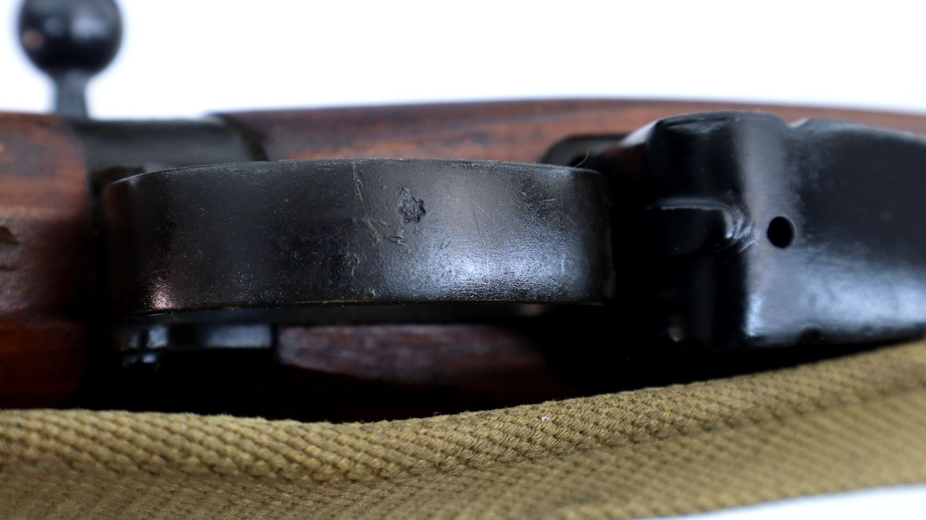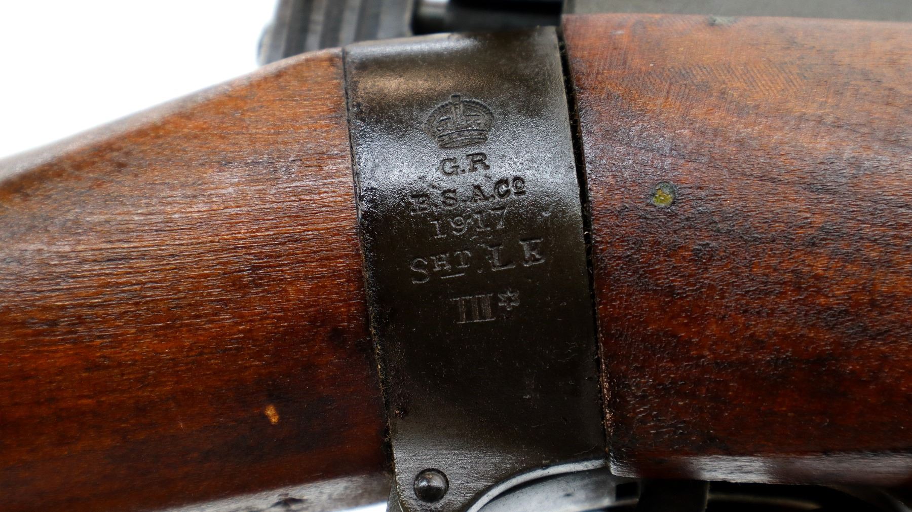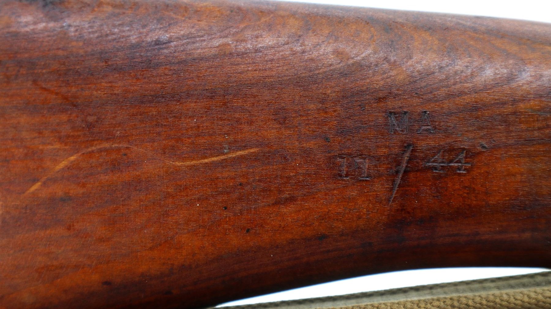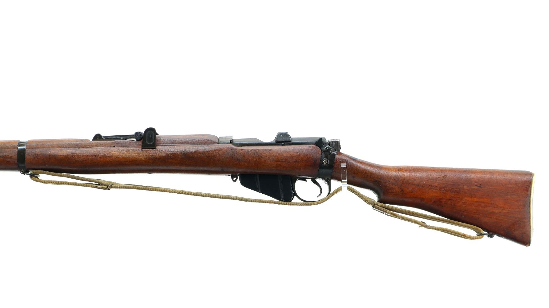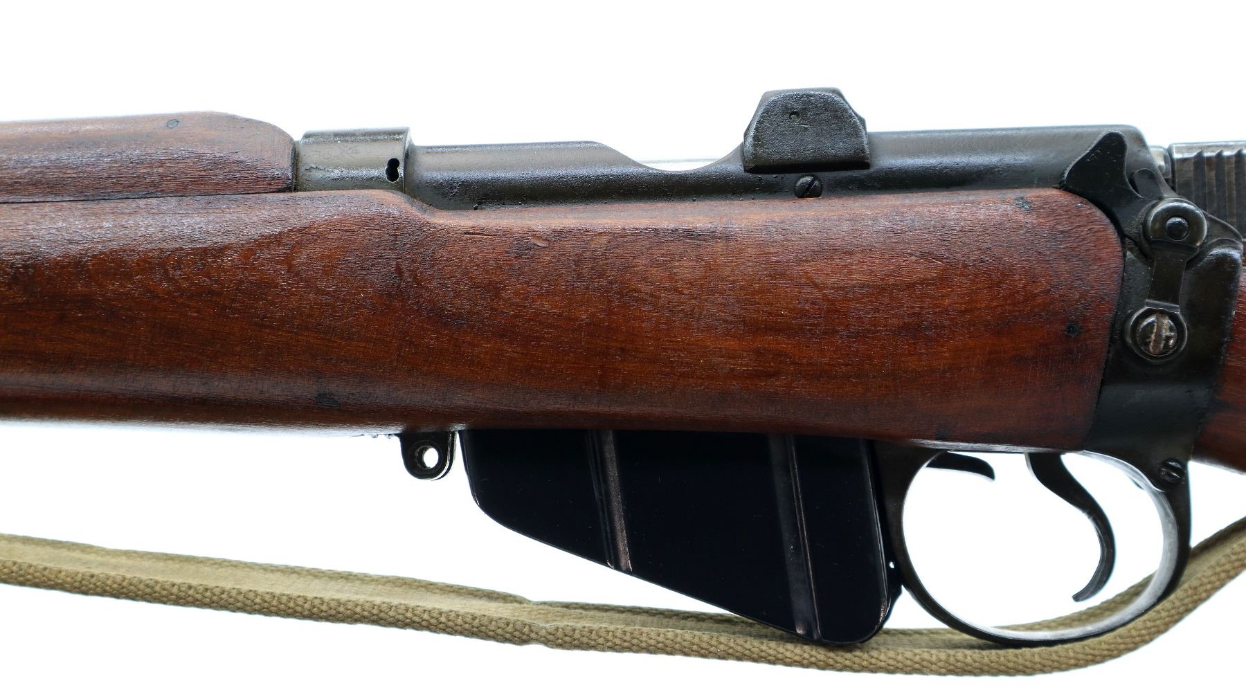 Main Description: Manufactured by BSA Co 1917, bolt mismatched, nose cap and forearm not numbered. Blade front sight with ears and ramp, adjustable u notched rear sight with ears, Parkerized metal finish. Four piece full military wood stocks, pistol grip, smooth brass butt plate with trap, Australian MA 11/44 markings on right side of butt, sling swivels with P37 canvas web sling, forearm has Australian proof marks, bayonet lug.