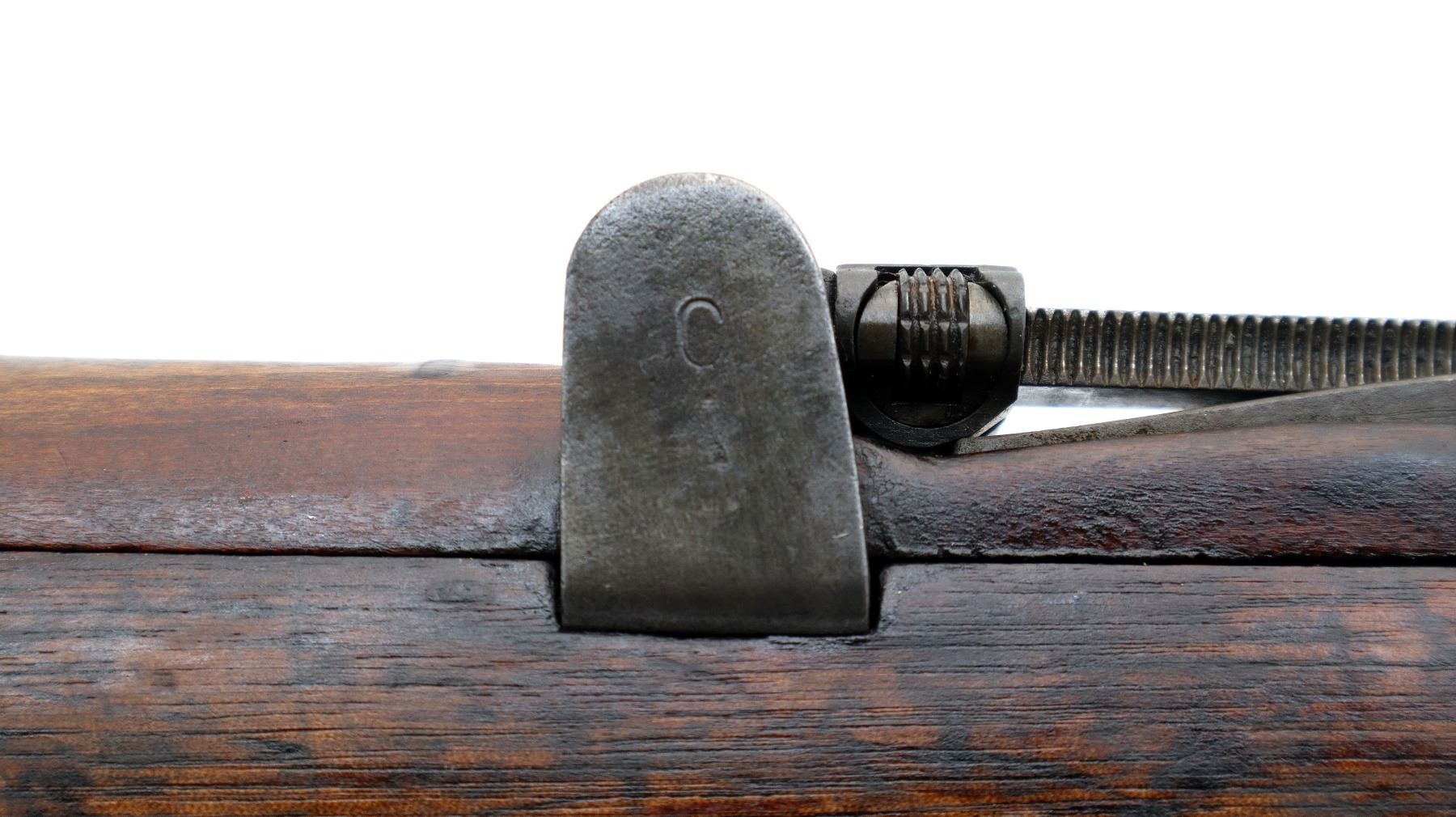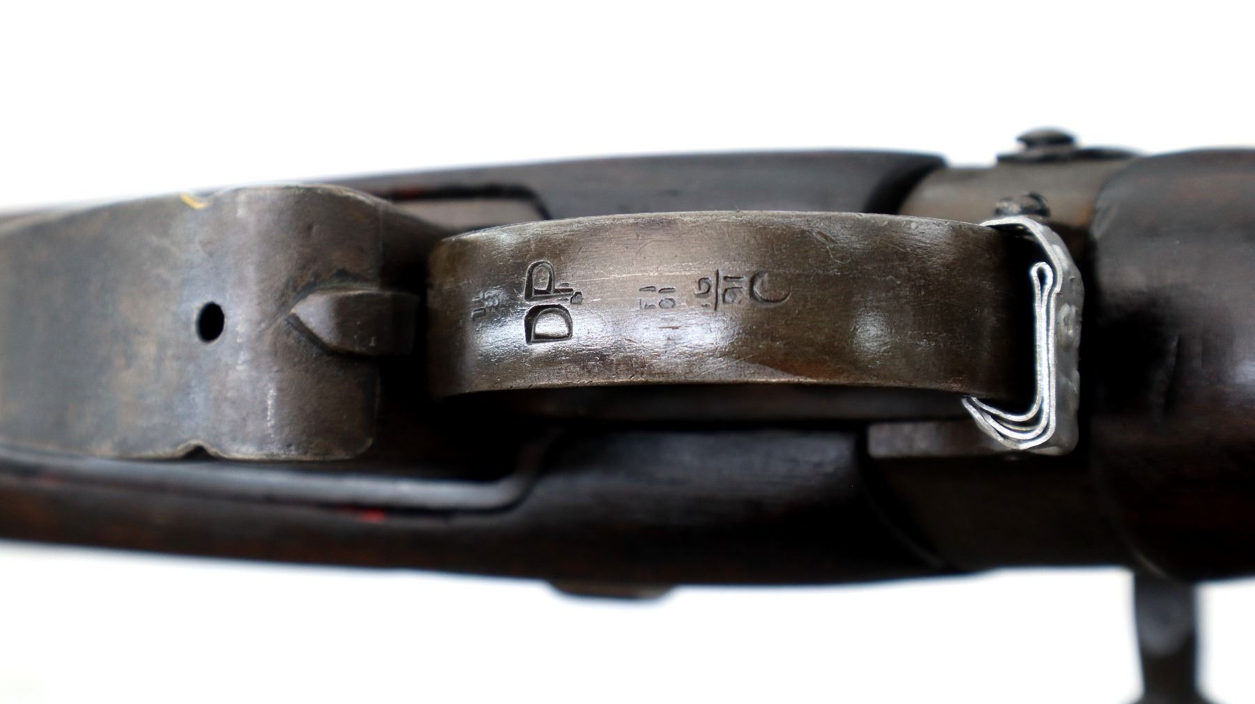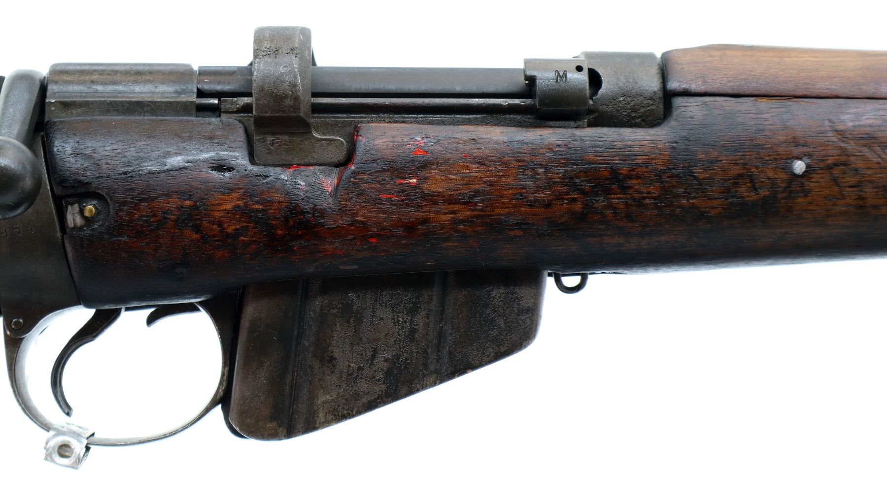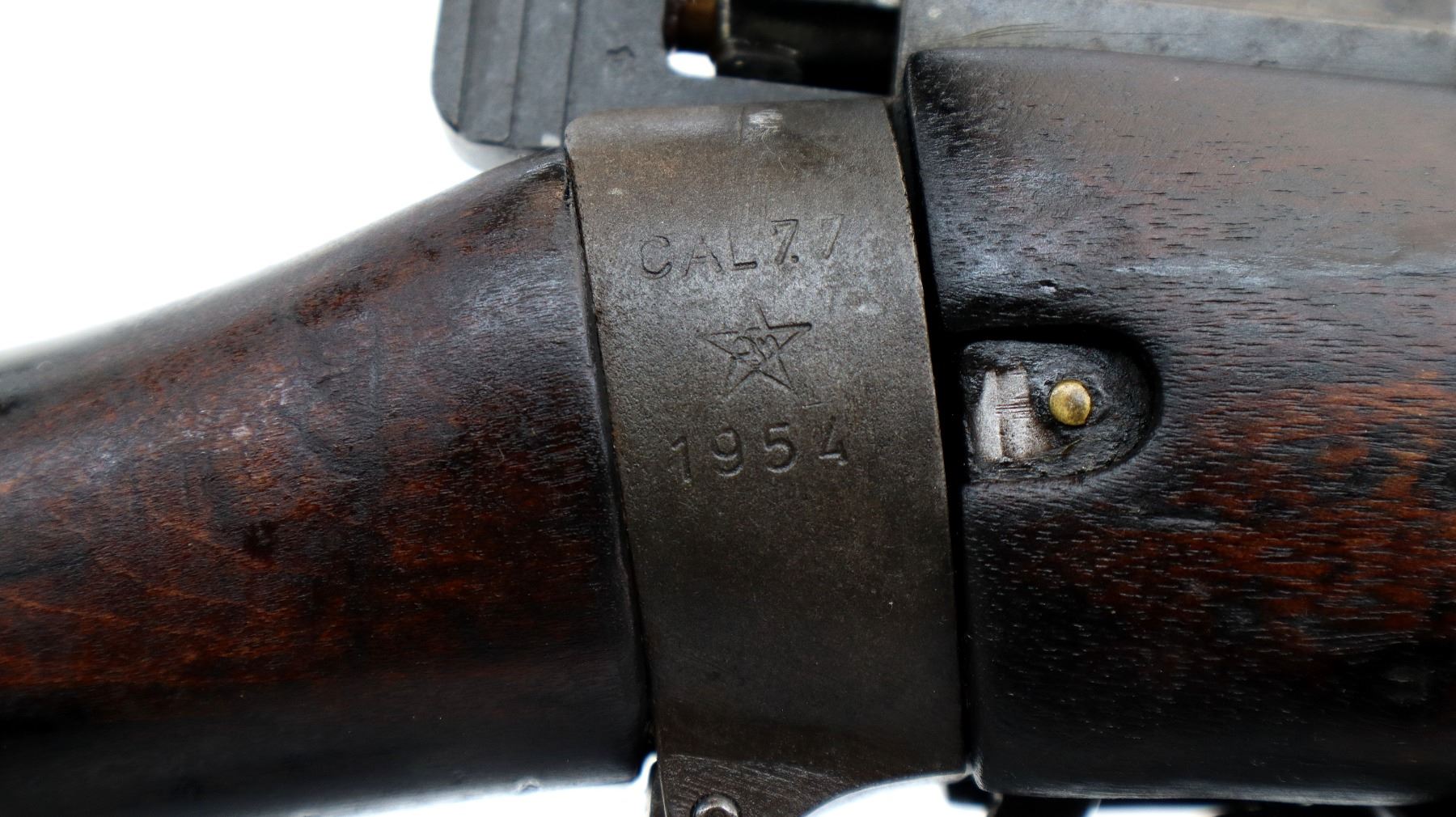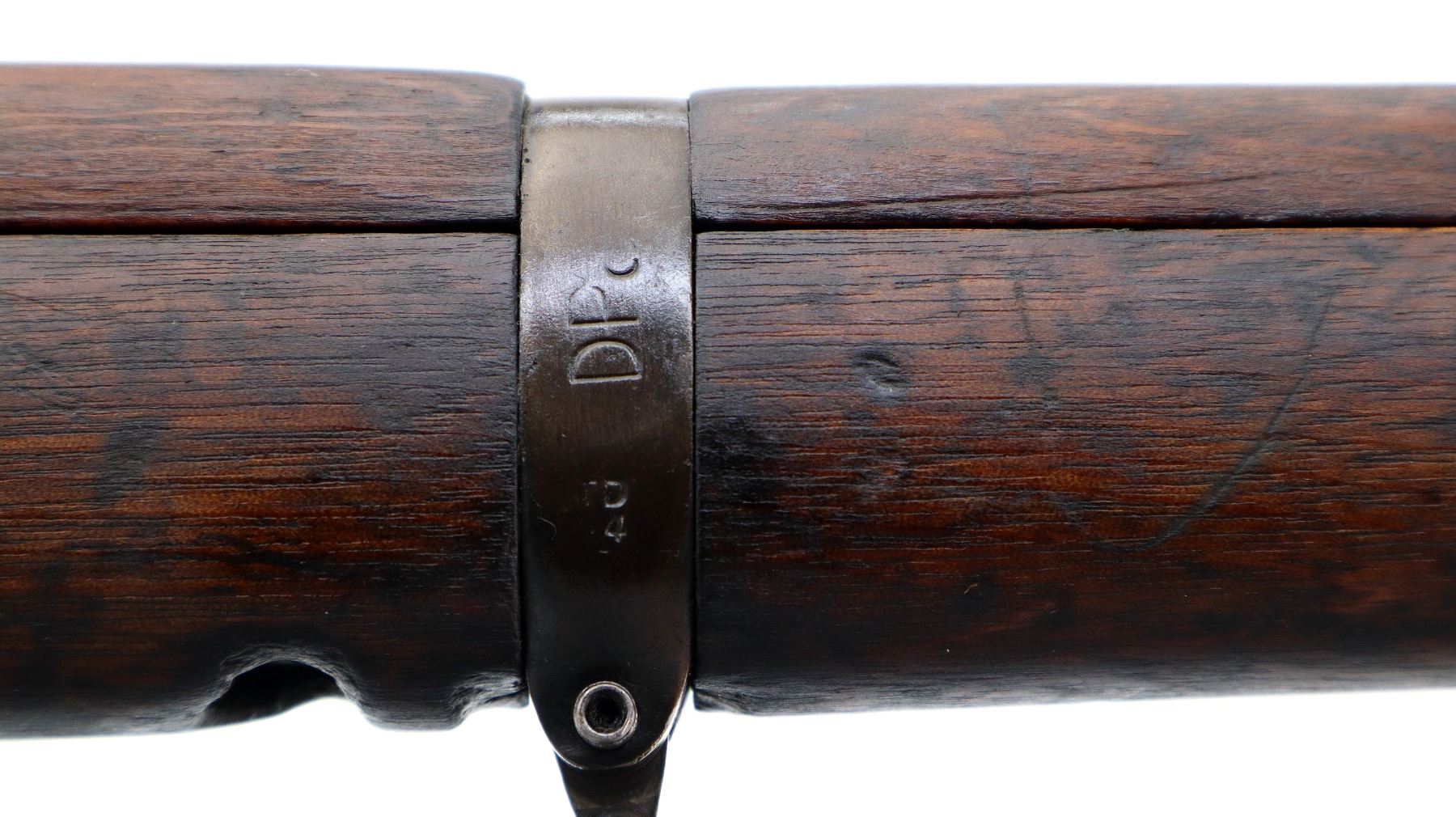 Main Description: Manufactured 1954, serial numbers mismatched. Blade front sight with ears and ramp, adjustable u notched rear sight with ears, Parkerized metal finish. Four piece full military drill purpose marked stocks, handguards cracked and repaired, forearm has Ishapore screw, pistol grip, smooth brass butt plate with trap, arsenal repairs at heel and toe, sling swivels, bayonet lug, some metal parts stamped DP.