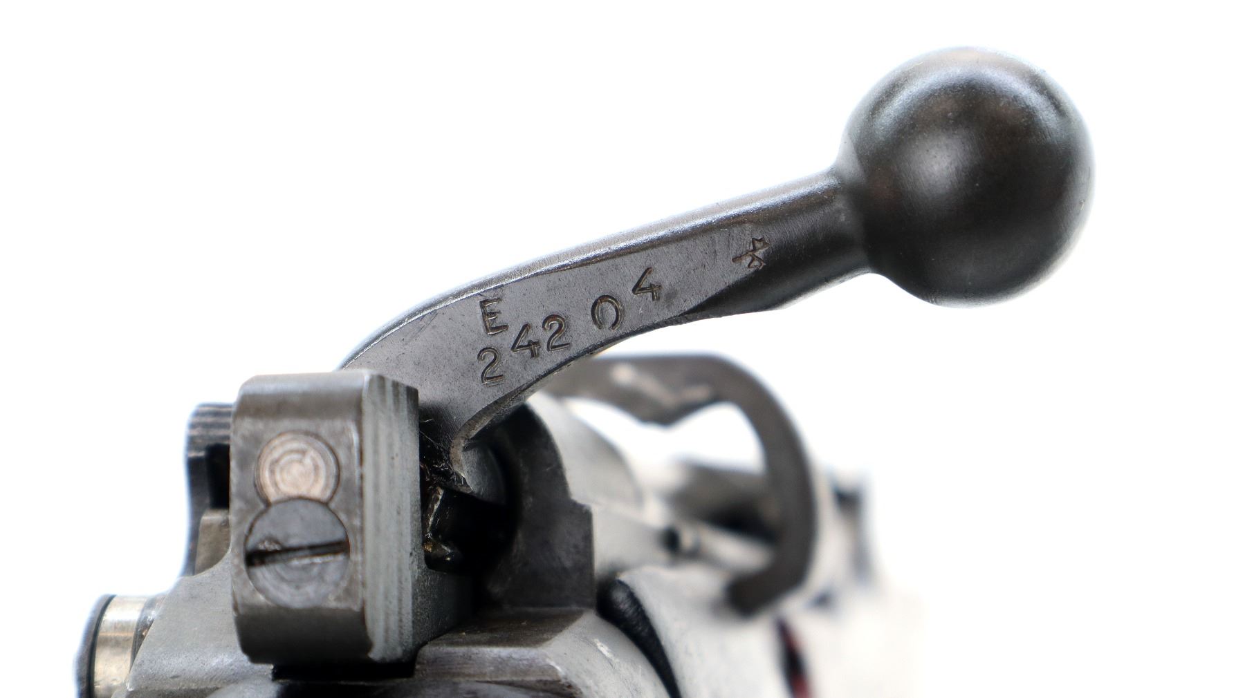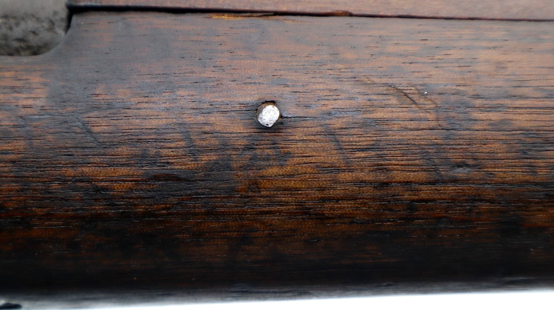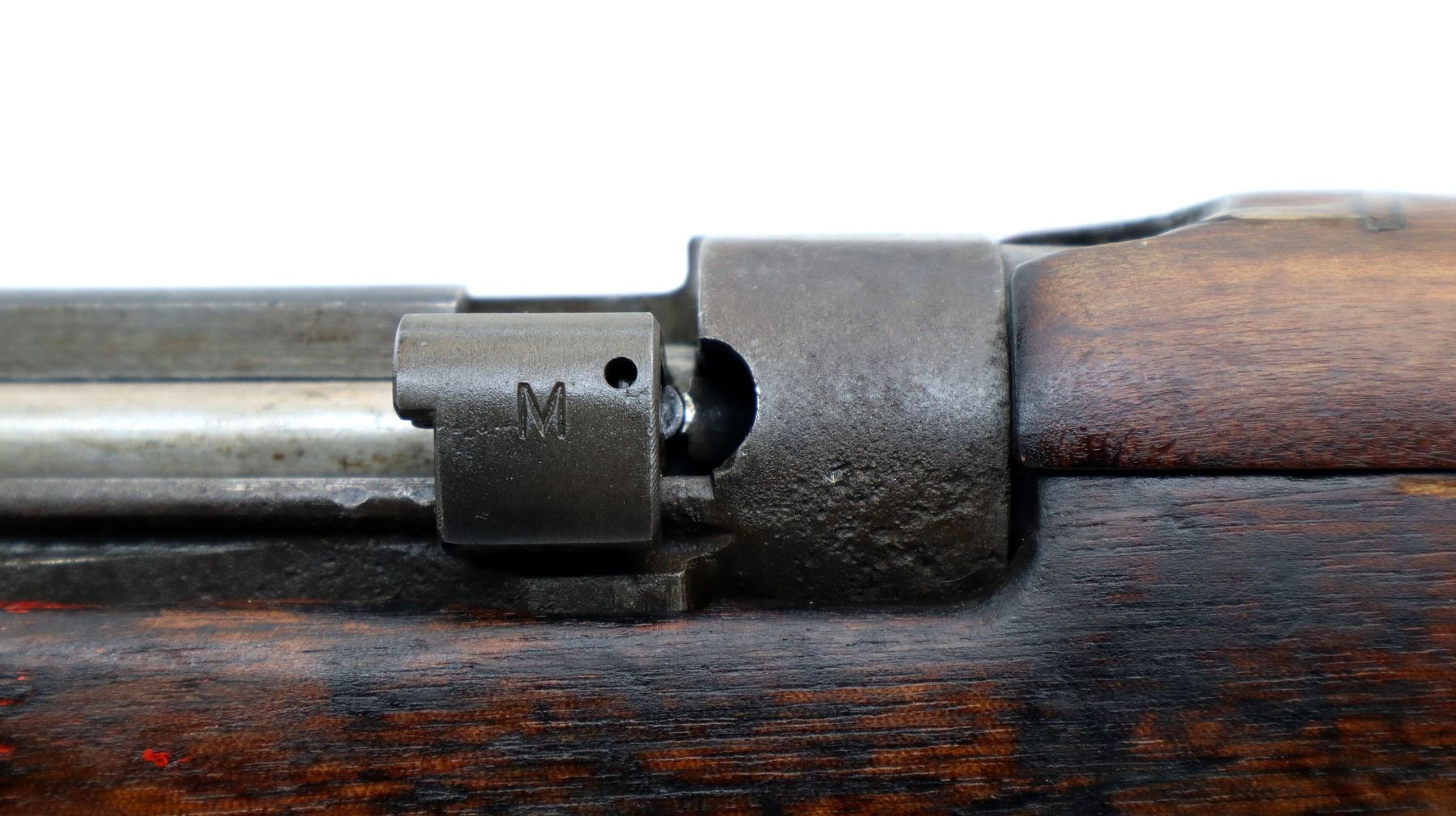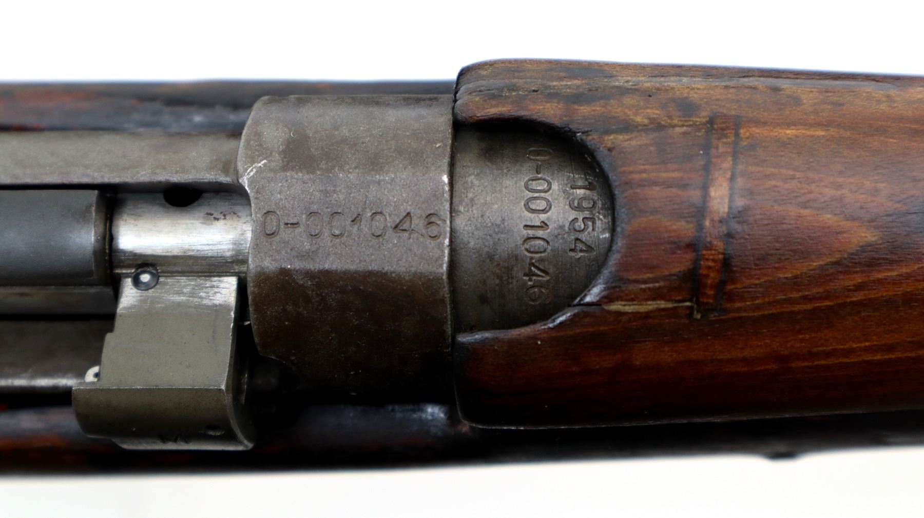Main Description: Manufactured 1954, serial numbers mismatched. Blade front sight with ears and ramp, adjustable u notched rear sight with ears, Parkerized metal finish. Four piece full military drill purpose marked stocks, handguards cracked and repaired, forearm has Ishapore screw, pistol grip, smooth brass butt plate with trap, arsenal repairs at heel and toe, sling swivels, bayonet lug, some metal parts stamped DP.