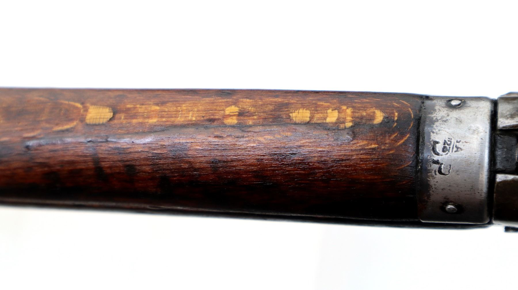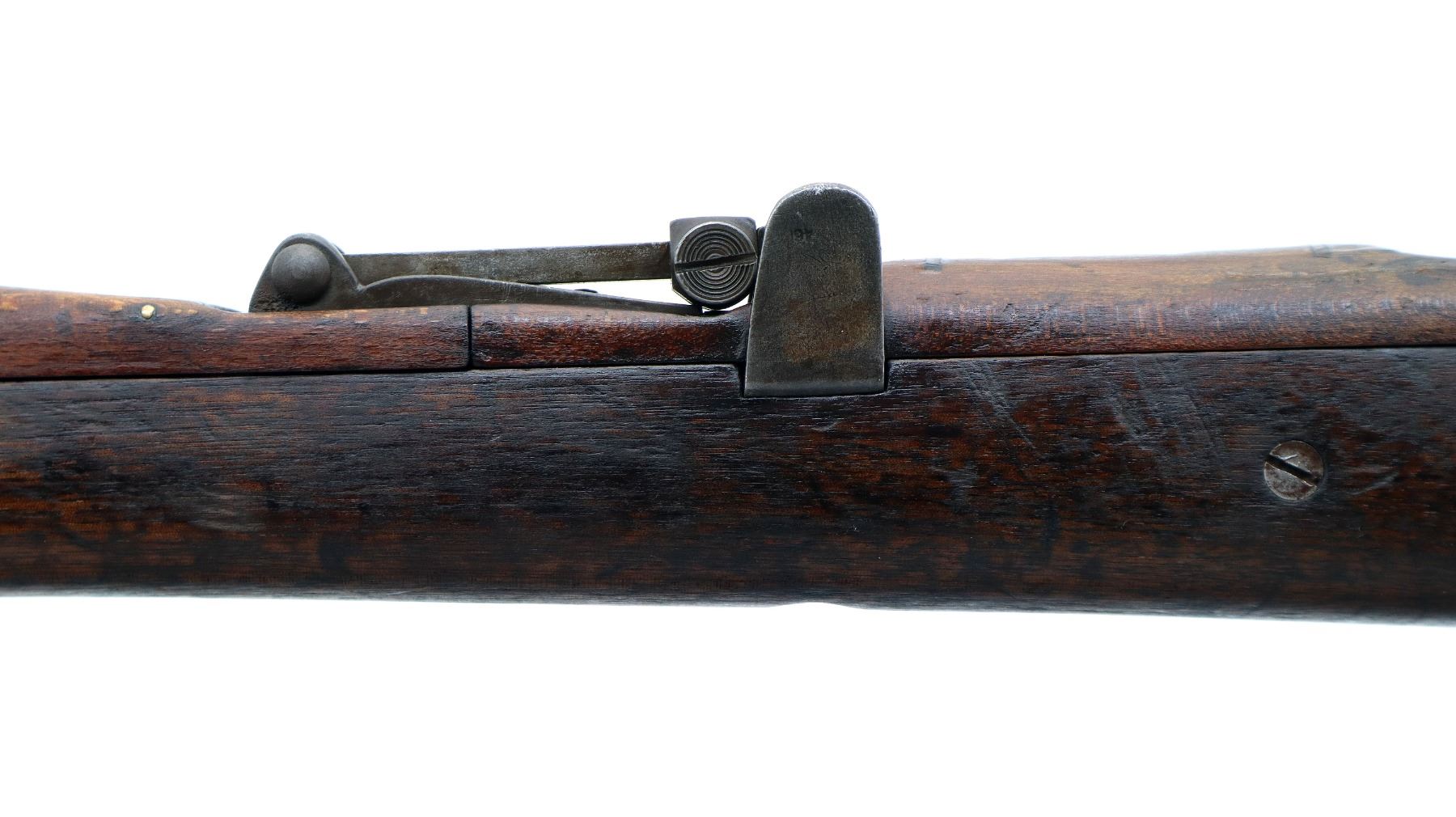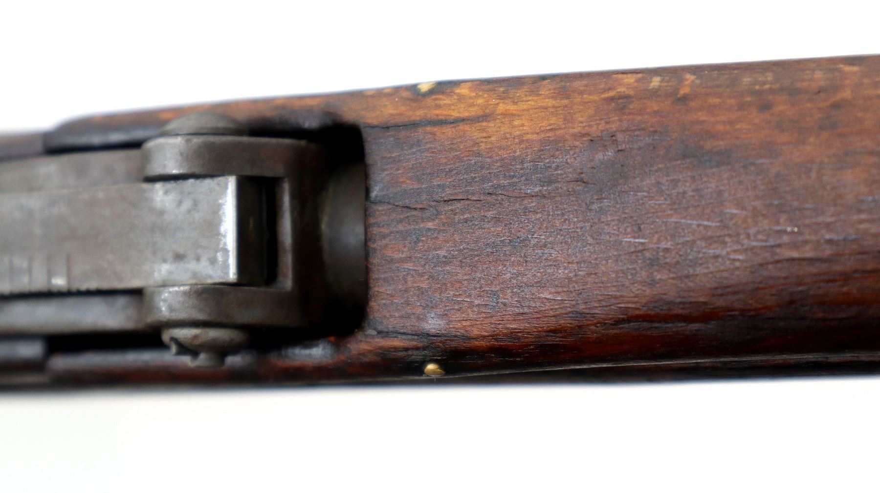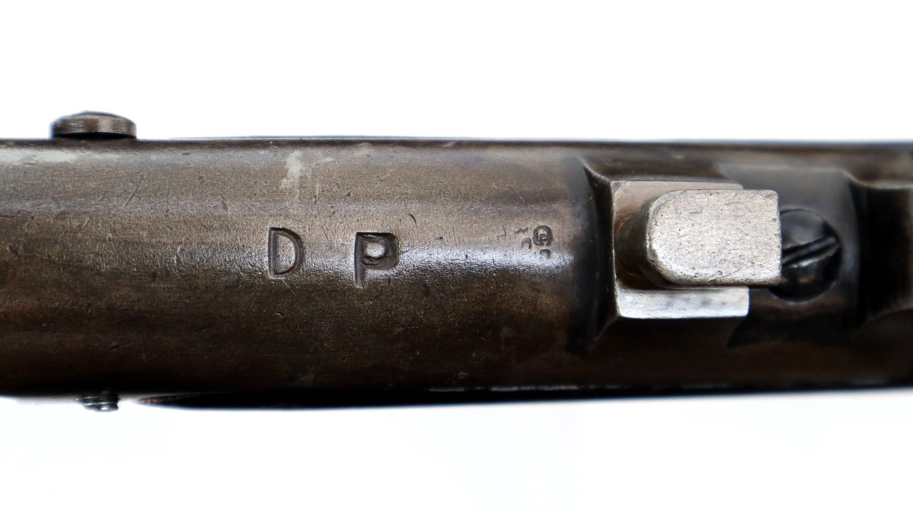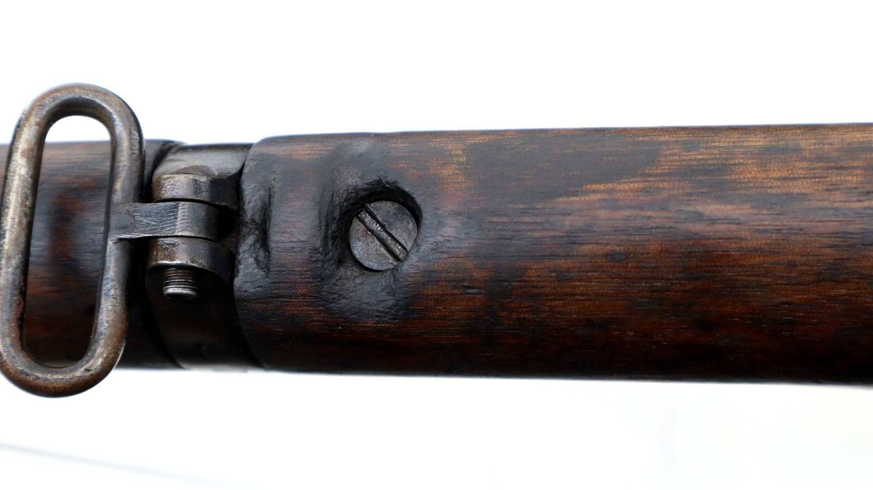 Main Description: Manufactured 1954, serial numbers mismatched. Blade front sight with ears and ramp, adjustable u notched rear sight with ears, Parkerized metal finish. Four piece full military drill purpose marked stocks, handguards cracked and repaired, forearm has Ishapore screw, pistol grip, smooth brass butt plate with trap, arsenal repairs at heel and toe, sling swivels, bayonet lug, some metal parts stamped DP.