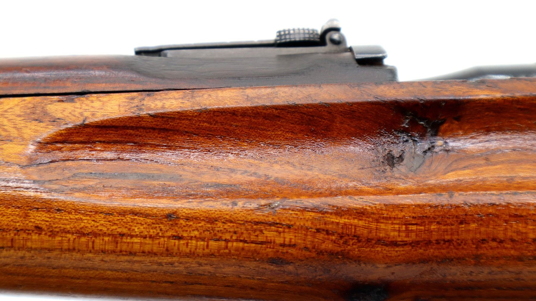 Main Description: Arsenal rebuilt numbered to match. Barley corn front sight with ramp, adjustable u notched ladder rear sight, blued finish, silver bolt with straight handle and large knob. Two piece full military wood stocks, finger grooved forearm, pistol grip, smooth steel butt plate, sling swivels, stacking hook, bayonet lug.