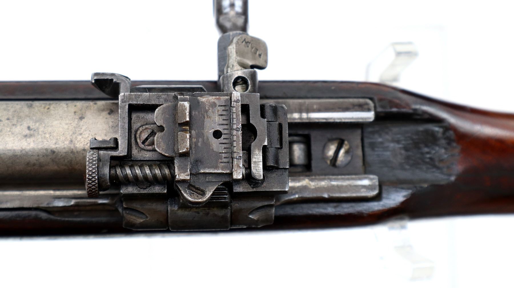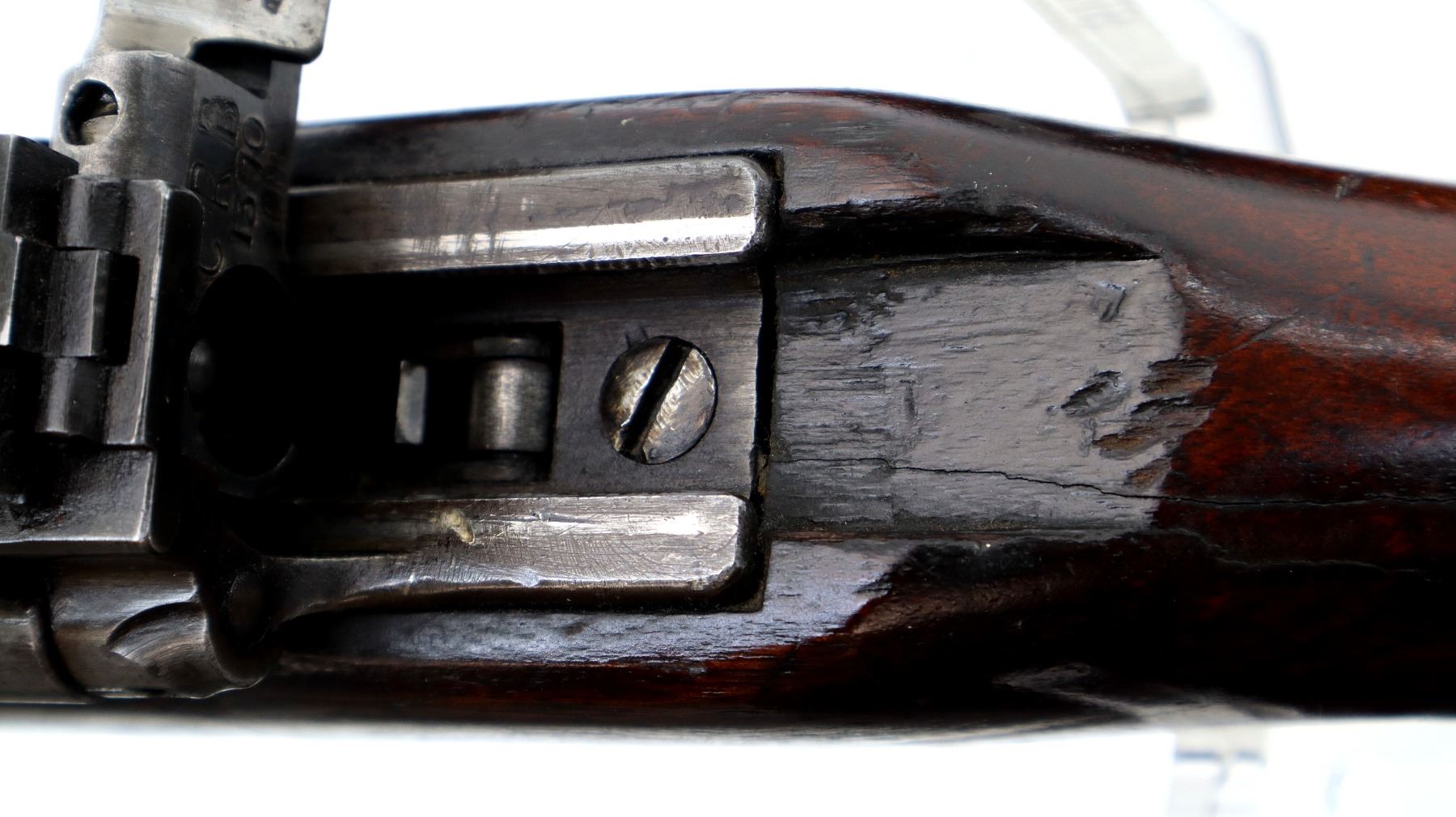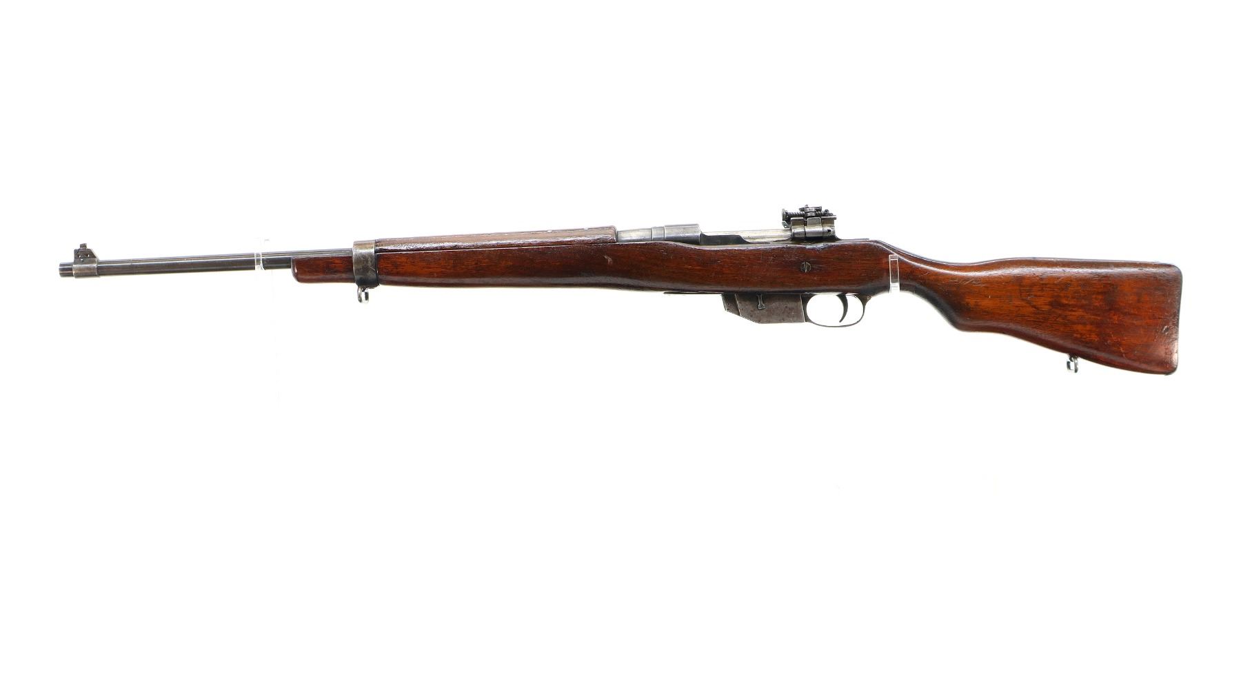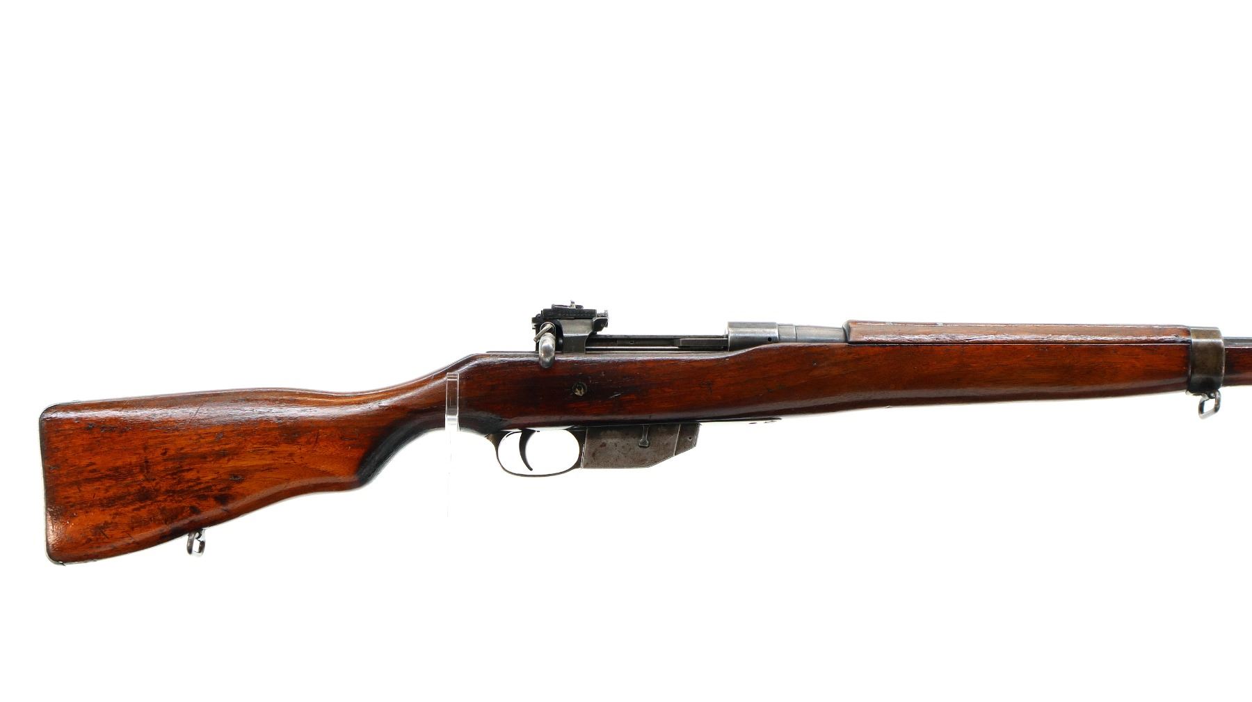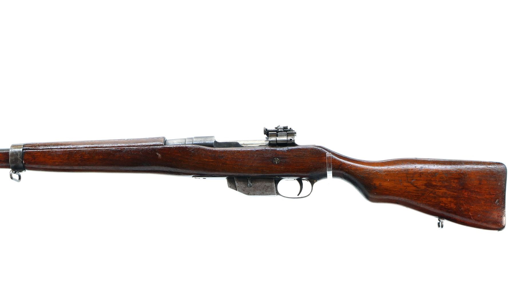 Main Description: Blade front sight with ramp, adjustable folding rear peep sight, blued finish, shortened barrel, unpinned bolt, flag safety. Two piece sporterized wood stocks, handguard is cracked, pistol grip cracked behind receiver, smooth steel butt plate with brass trap, sling swivels.