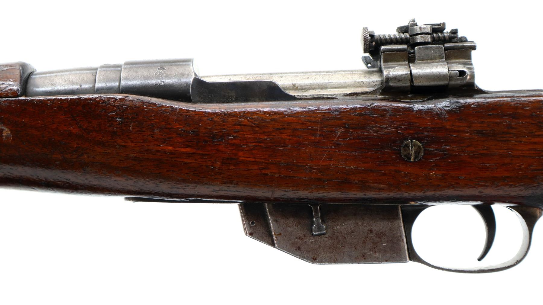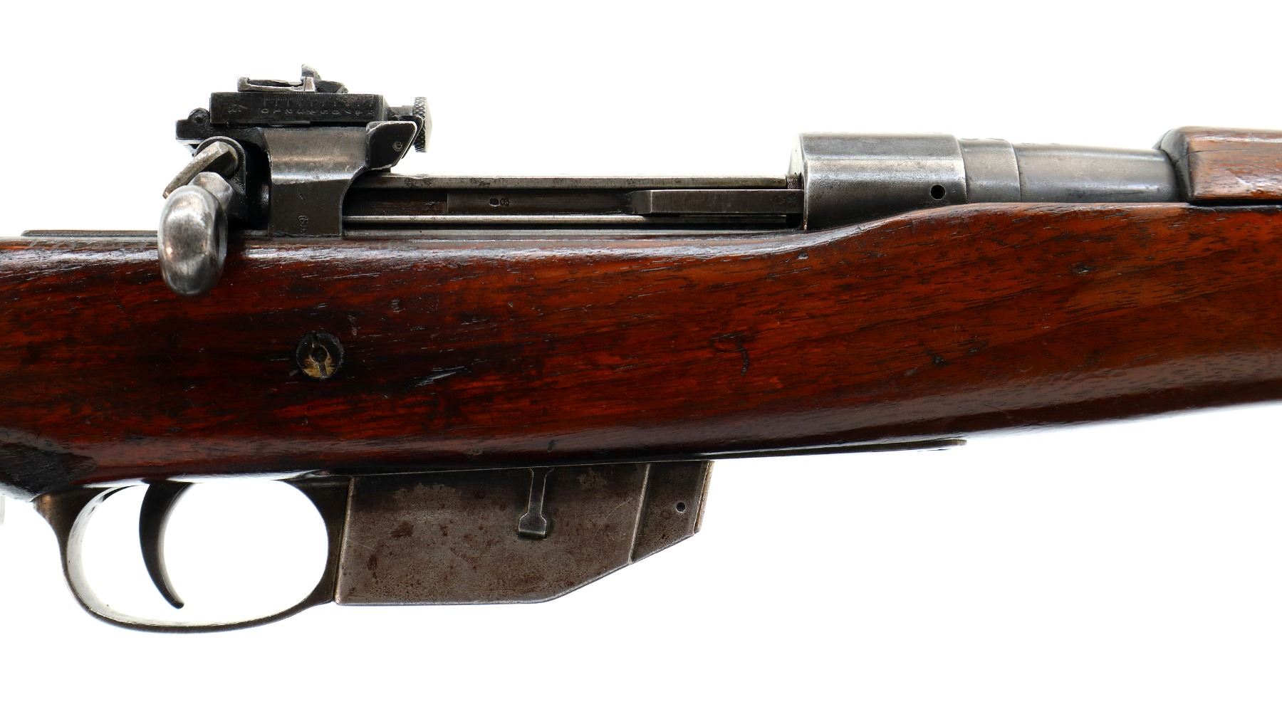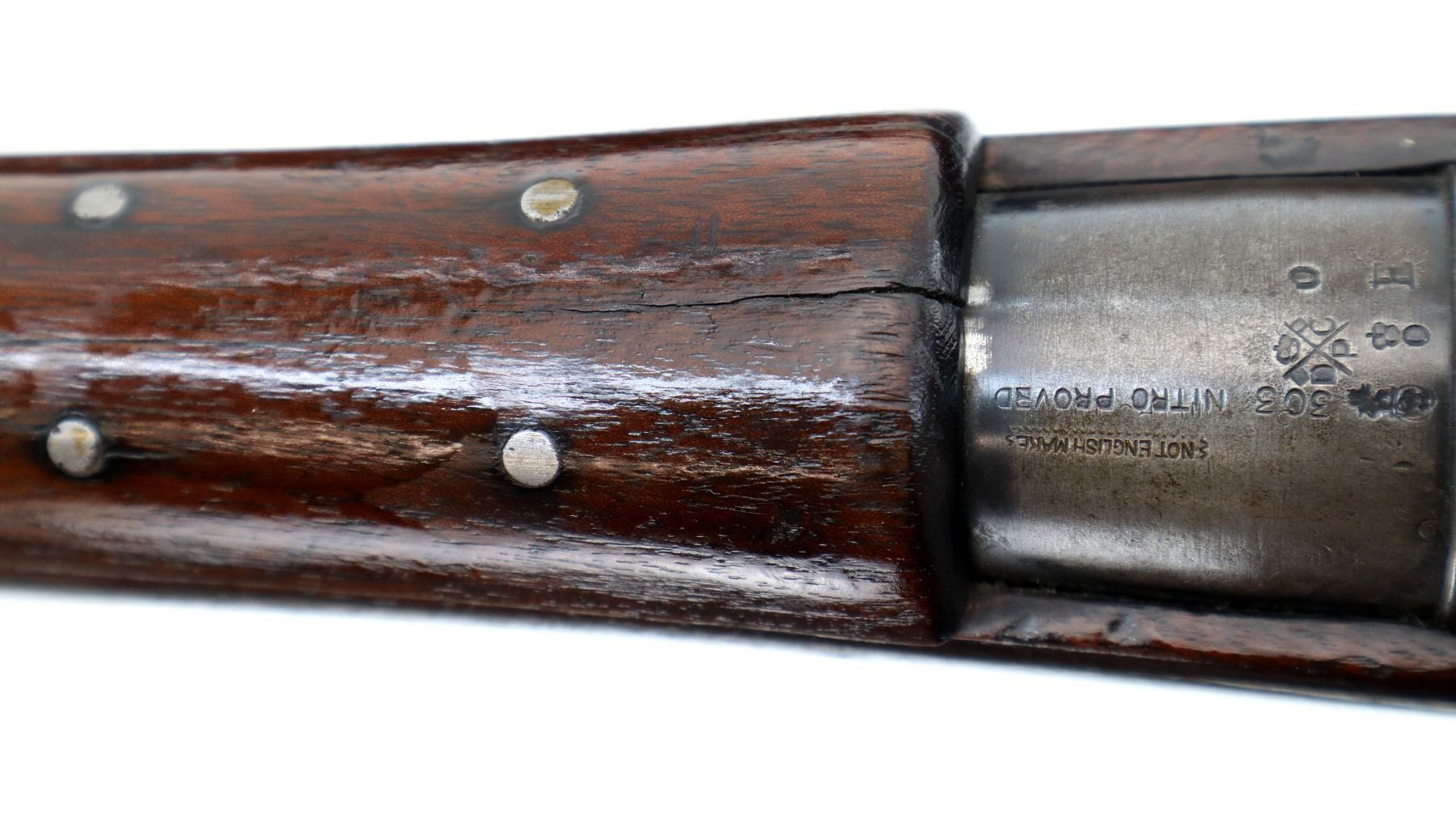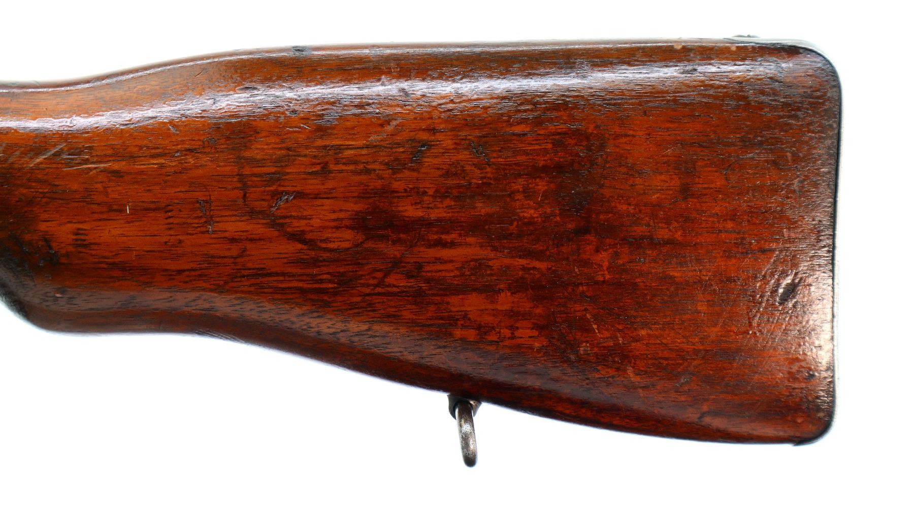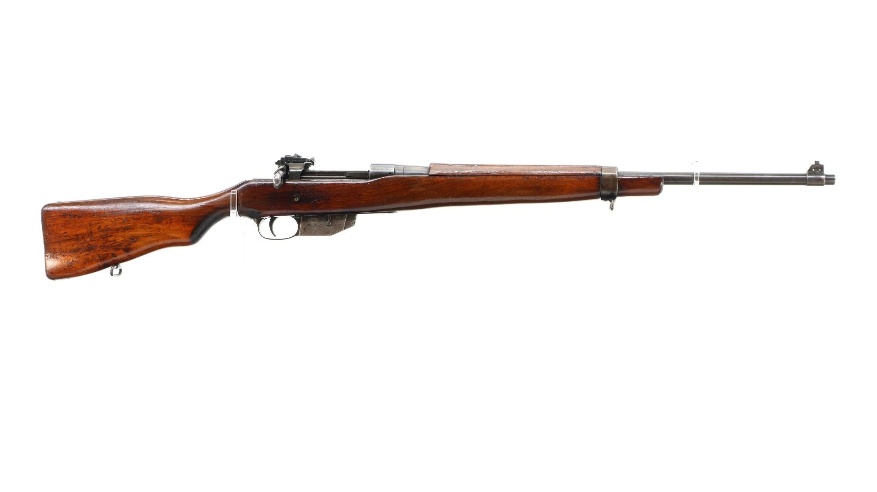 Main Description: Blade front sight with ramp, adjustable folding rear peep sight, blued finish, shortened barrel, unpinned bolt, flag safety. Two piece sporterized wood stocks, handguard is cracked, pistol grip cracked behind receiver, smooth steel butt plate with brass trap, sling swivels.
