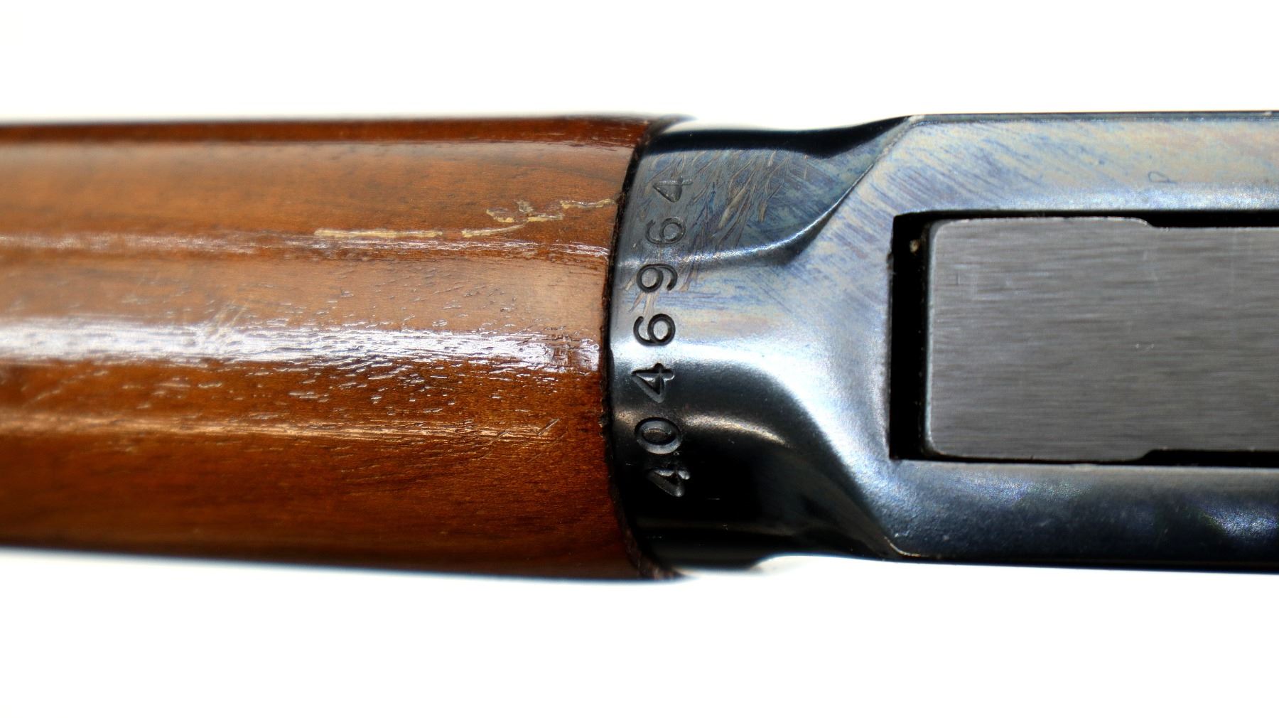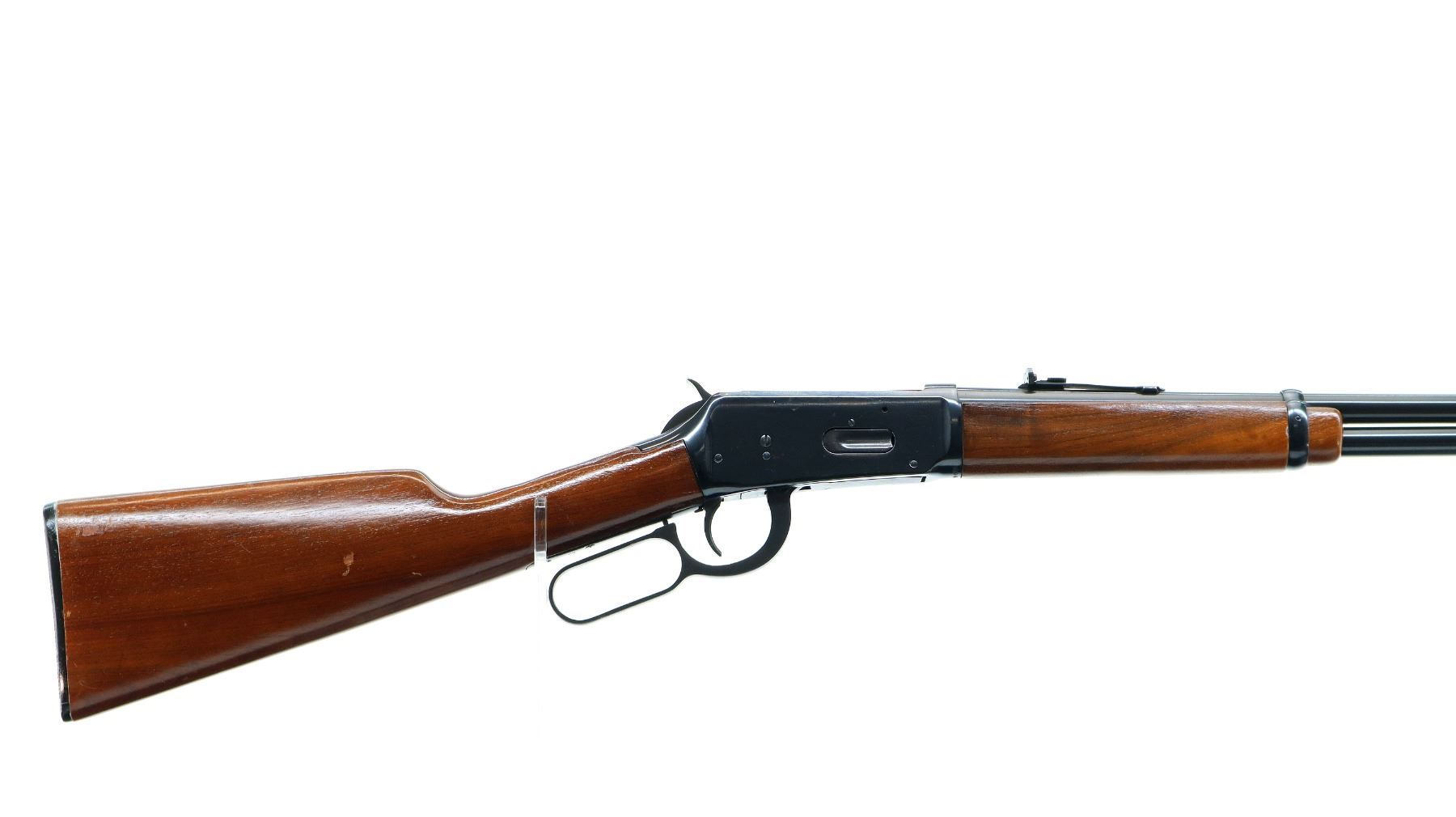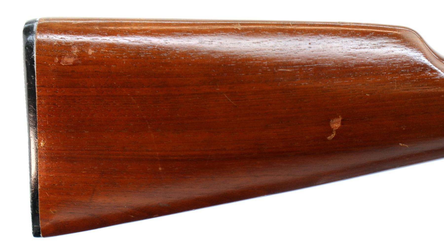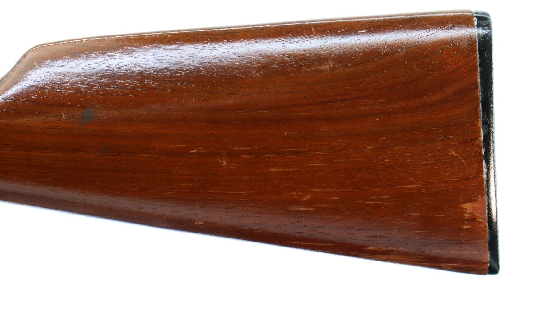 Main Description: Manufactured 1974. Blade front sight with hood and ramp, adjustable u notched rear sight, blued finish, grooved spur hammer. Two piece wood stocks, straight grip, checkered black polymer butt plate.
