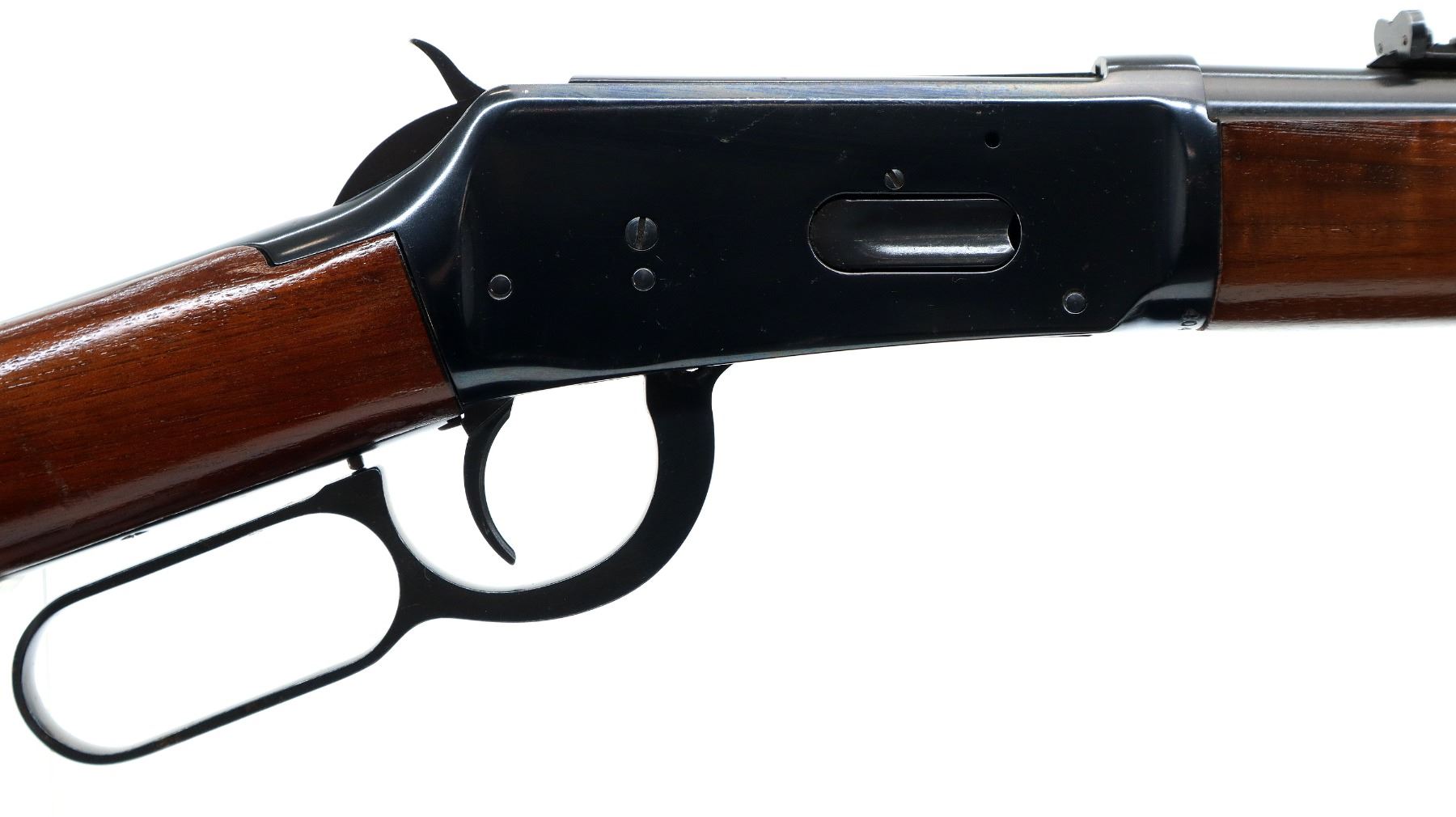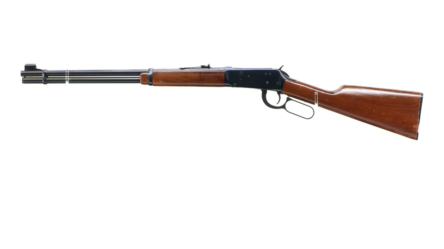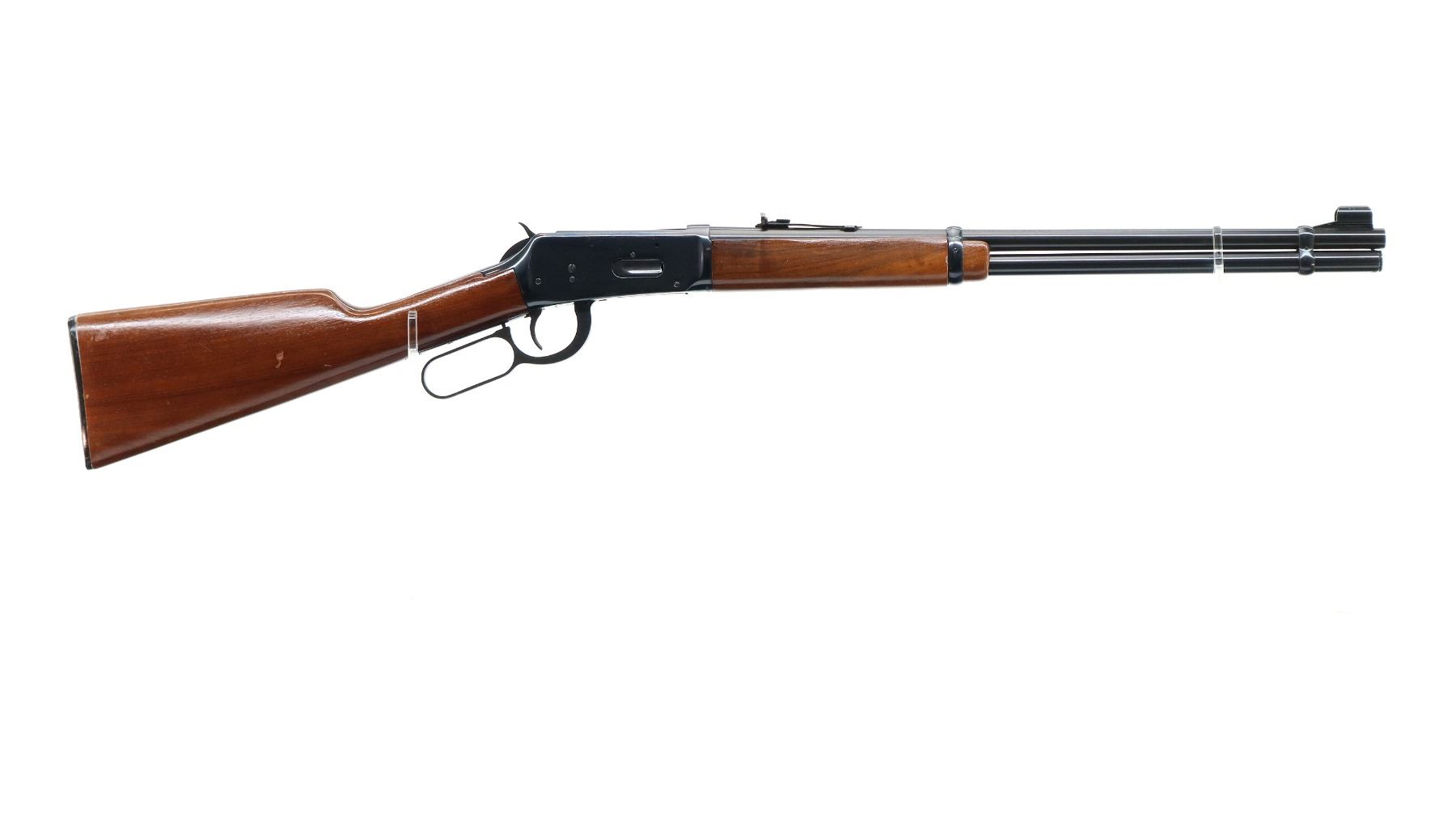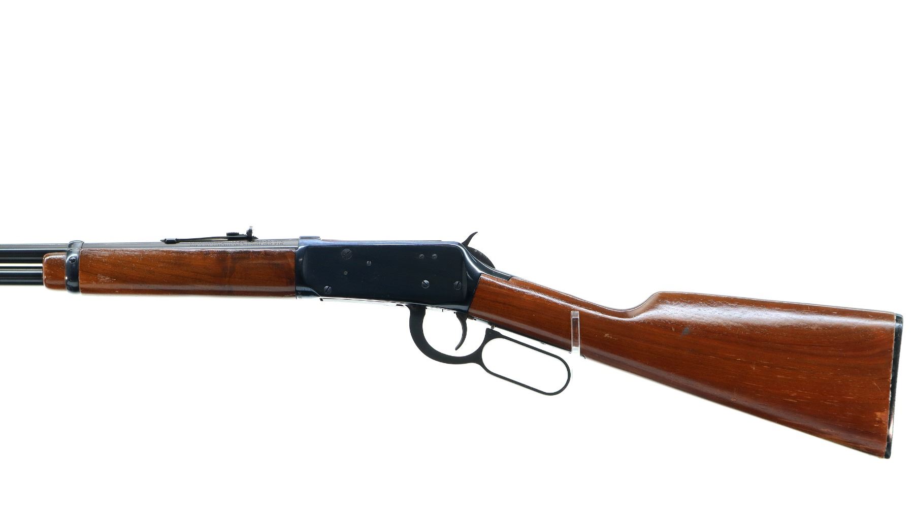 Main Description: Manufactured 1974. Blade front sight with hood and ramp, adjustable u notched rear sight, blued finish, grooved spur hammer. Two piece wood stocks, straight grip, checkered black polymer butt plate.