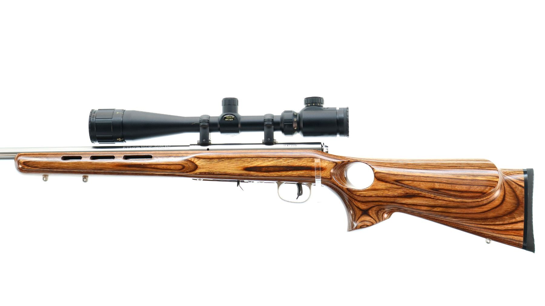 Main Description: No sights, stainless finish, heavy barrel, receiver drilled and tapped with BSA Mil Dot 4-16x40 IR scope installed, clear optics, Mil Dot reticle, illumination functions. One piece brown laminate wood stock, ventilated forearm, thumb hole pistol grip, cheek rest, black rubber recoil pad, accu trigger, 3 swivel studs.