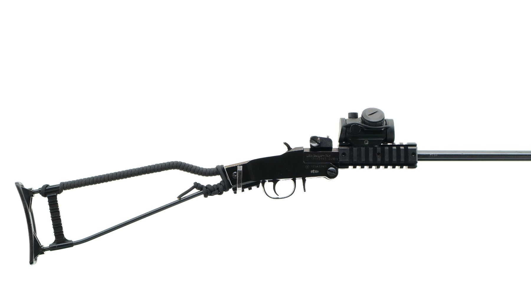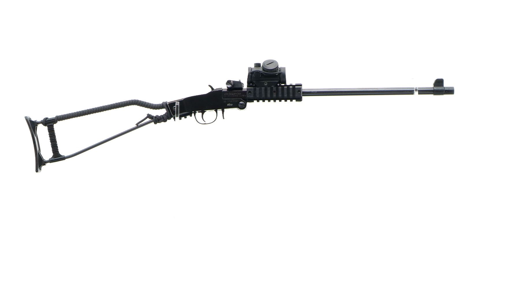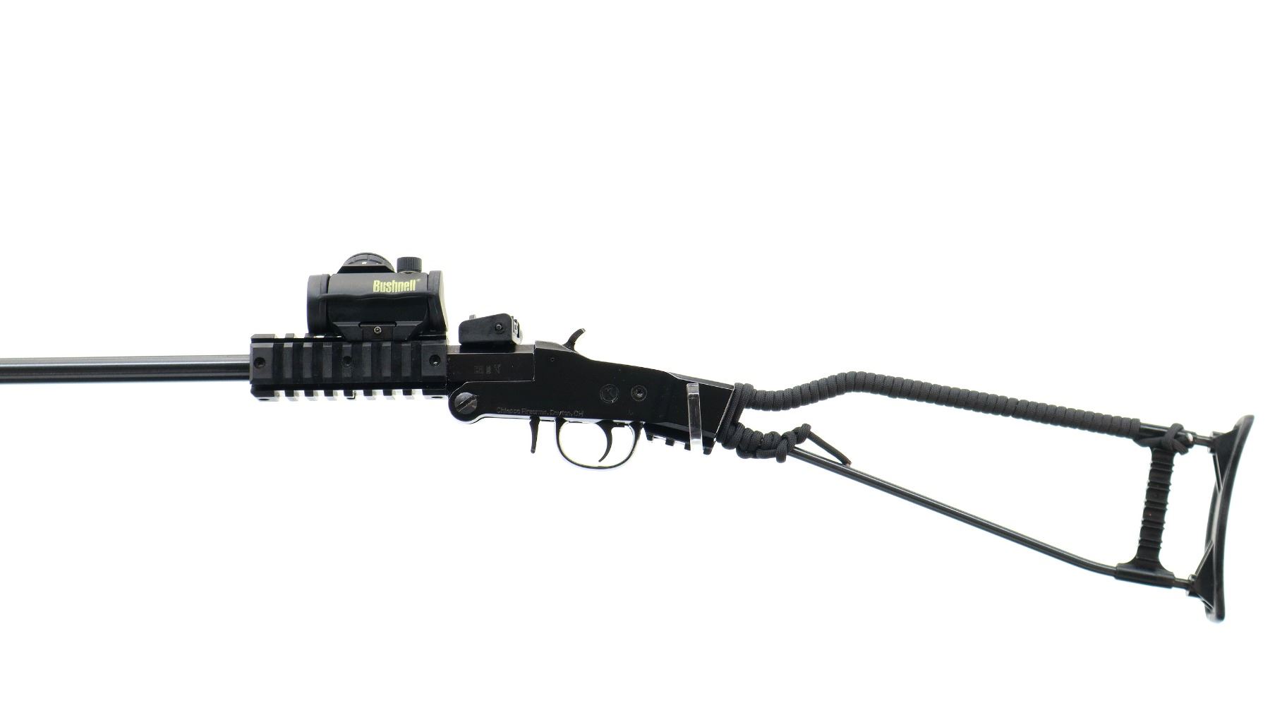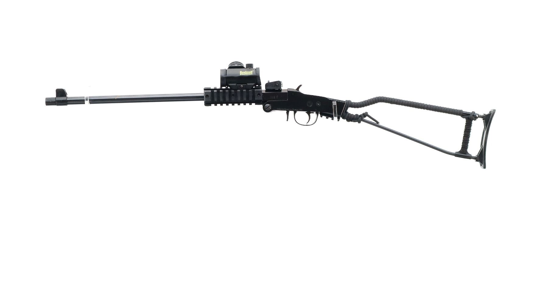 Main Description: Blade front sight with ears, adjustable rear peep sight which is loose, blued barrel with four rails and Bushnell Red dot installed, clear optics (functions). Black alloy receiver, grooved spur hammer and opening lever, short rail behind trigger guard. One piece wire stock, top wrapped with black nylon cord, grooved black polymer butt plate and double shell holders.