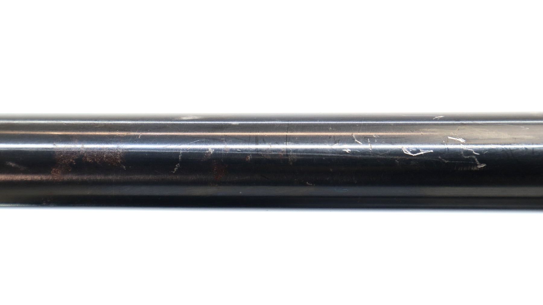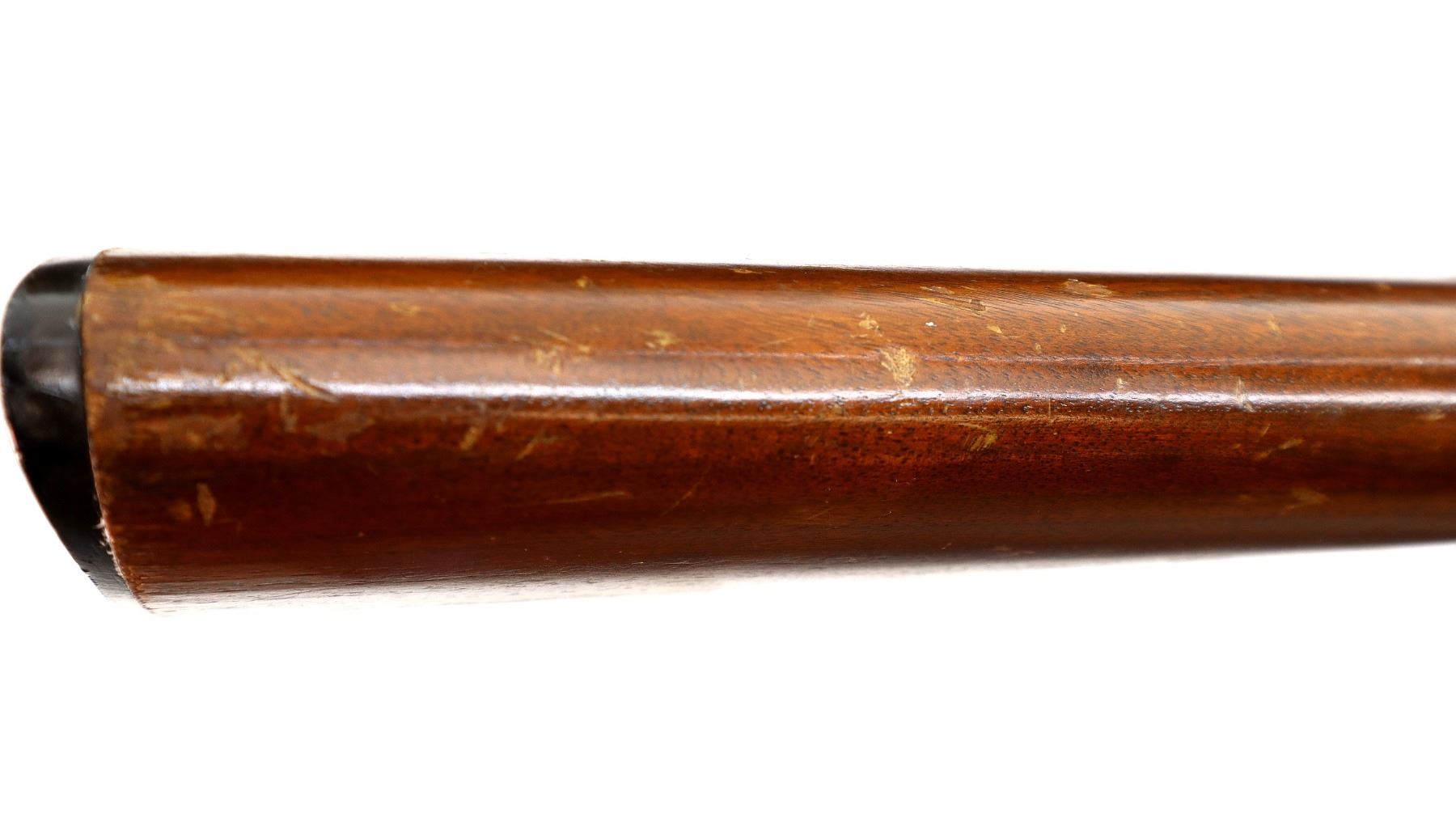 Main Description: Brass bead, blued finish, round barrel, engraved receiver. Two piece wood stocks, grooved forearm, checkered pistol grip cracked behind receiver, grooved black polymer butt plate, grip cap.