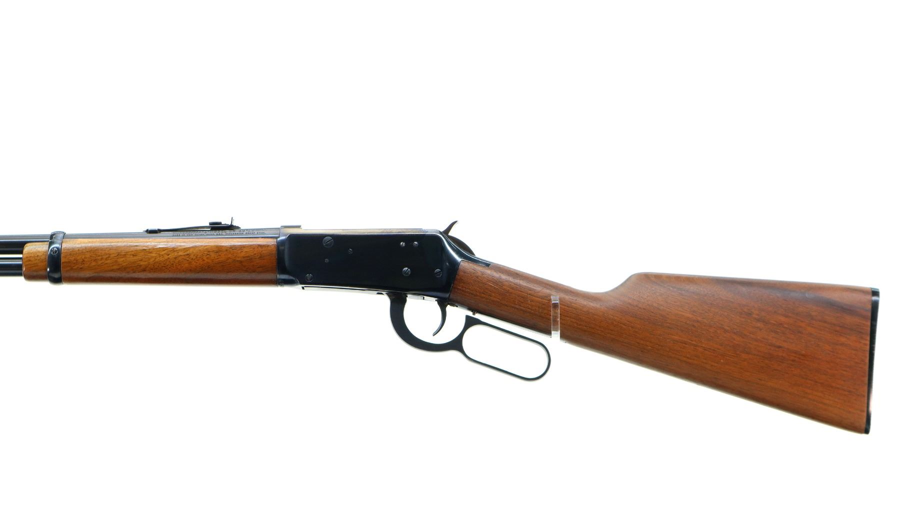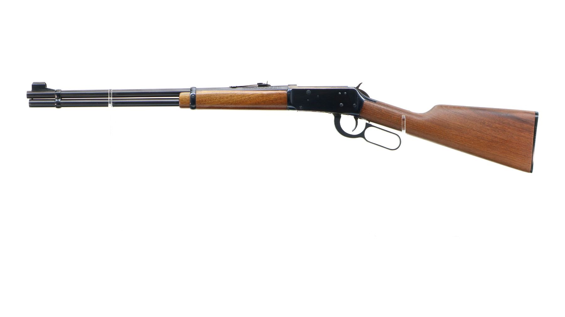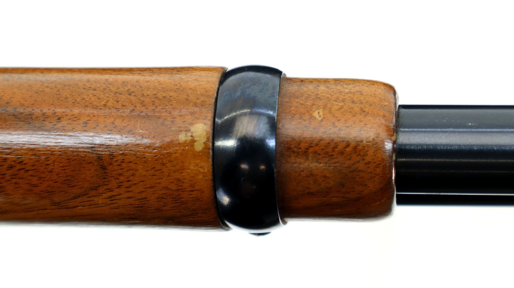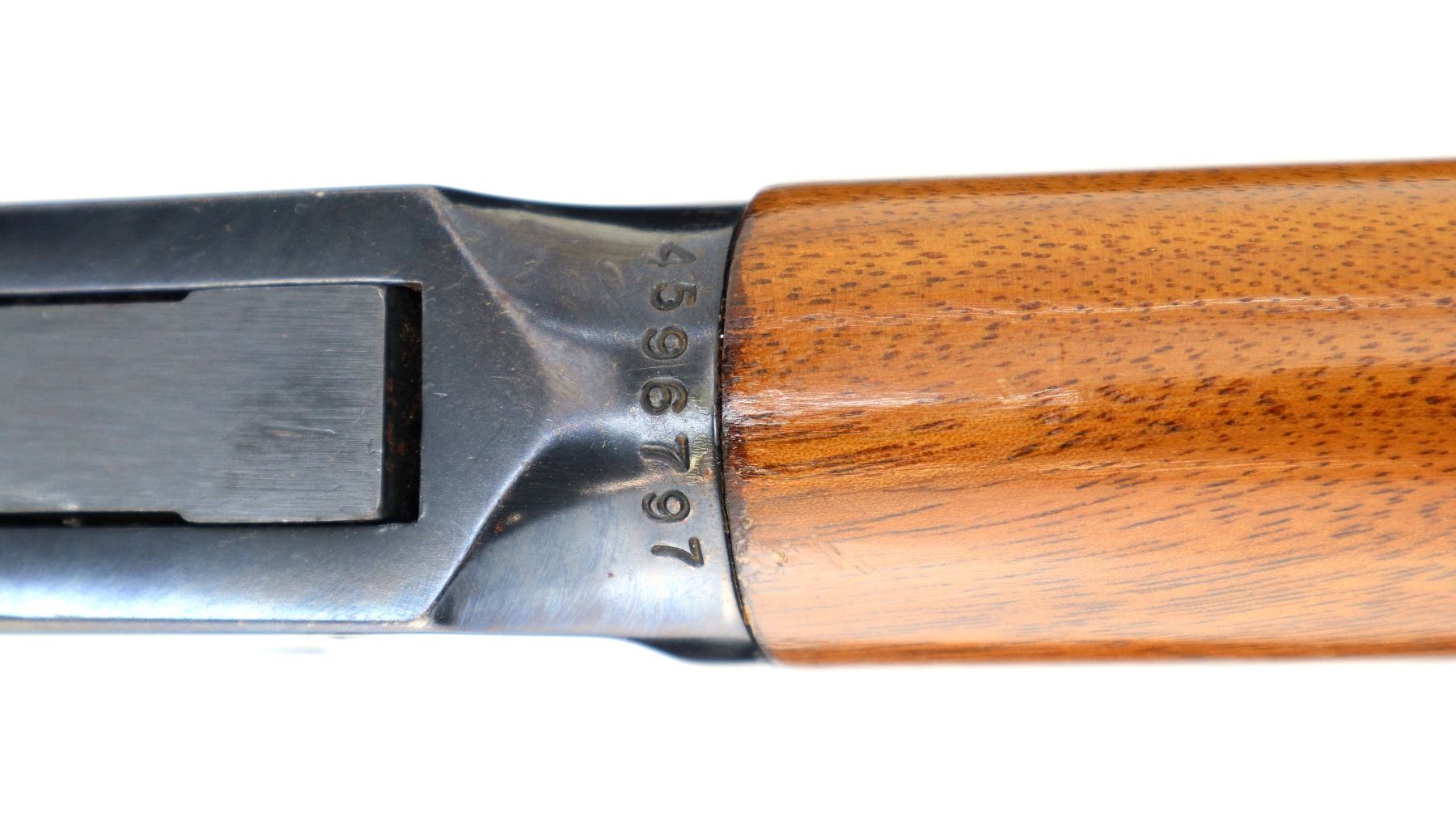 Main Description: Manufactured 1978. Blade front sight with hood and ramp, rear sight missing the u notched leaf has the elevator. Blued finish, grooved spur hammer. Two piece wood stocks, straight grip, checkered black polymer butt plate, full length magtube.