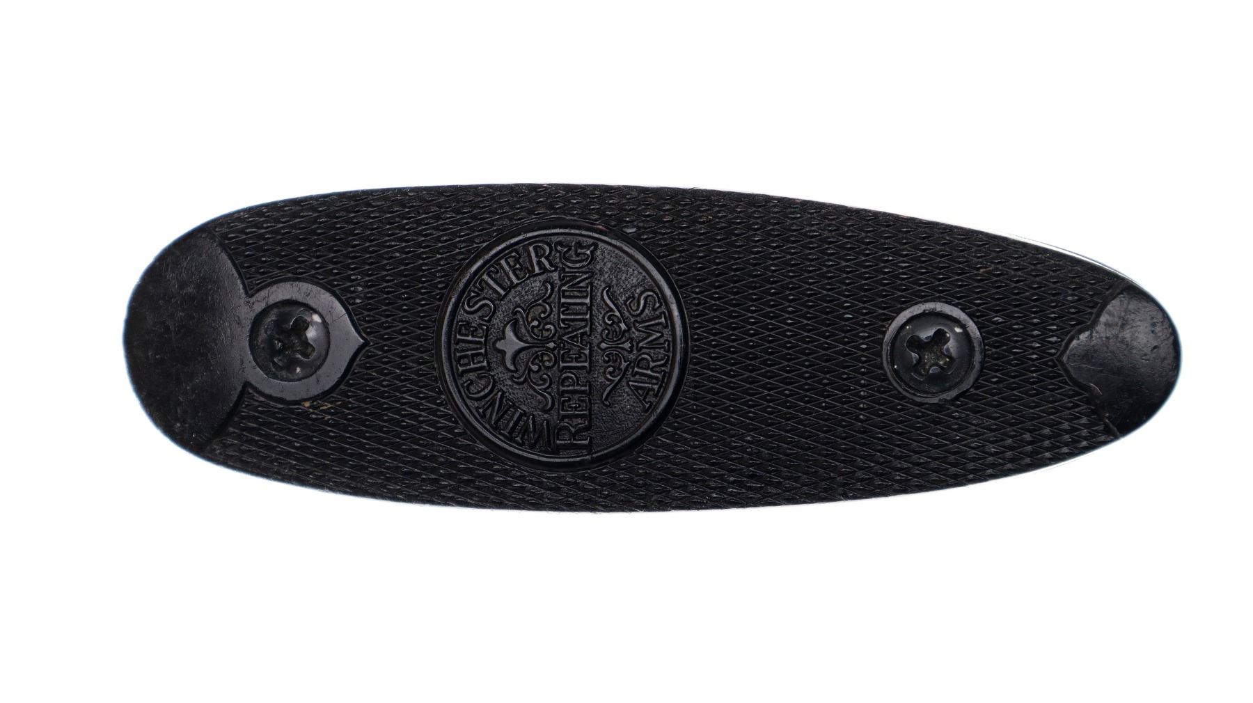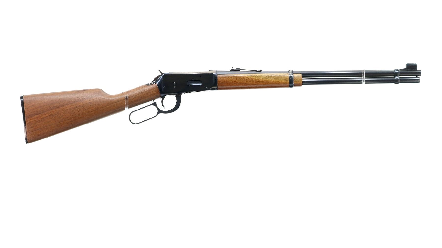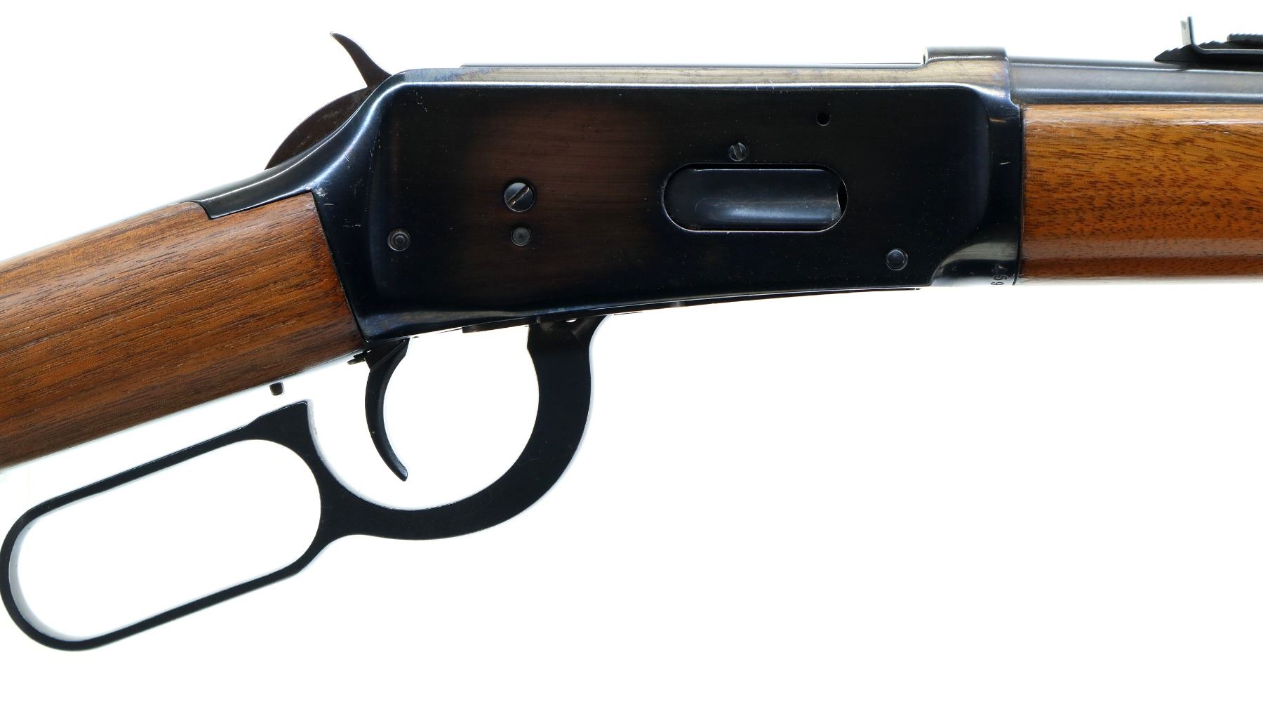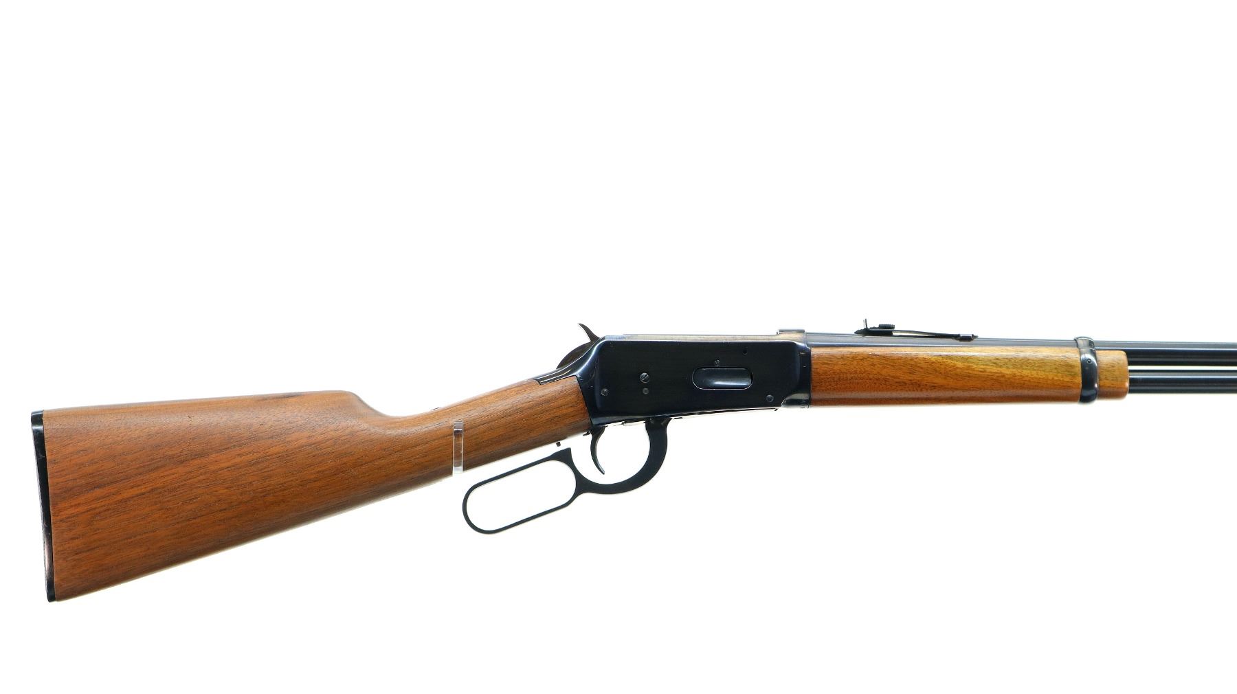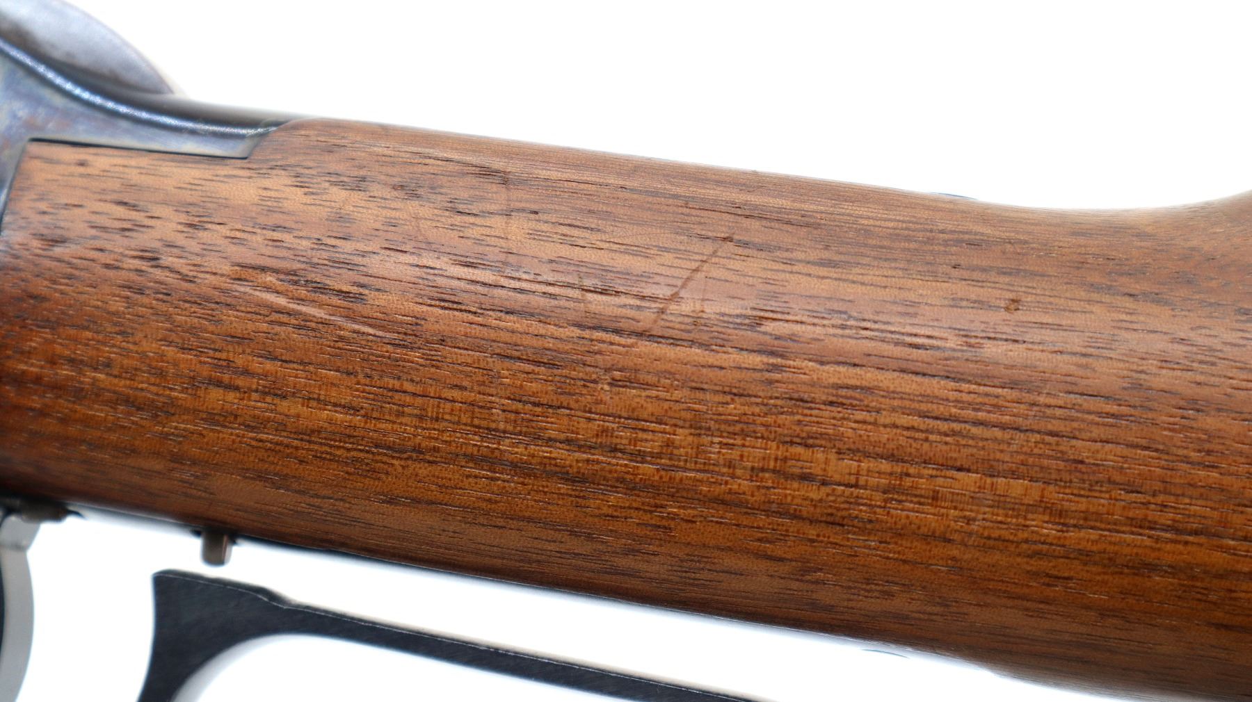 Main Description: Manufactured 1978. Blade front sight with hood and ramp, rear sight missing the u notched leaf has the elevator. Blued finish, grooved spur hammer. Two piece wood stocks, straight grip, checkered black polymer butt plate, full length magtube.