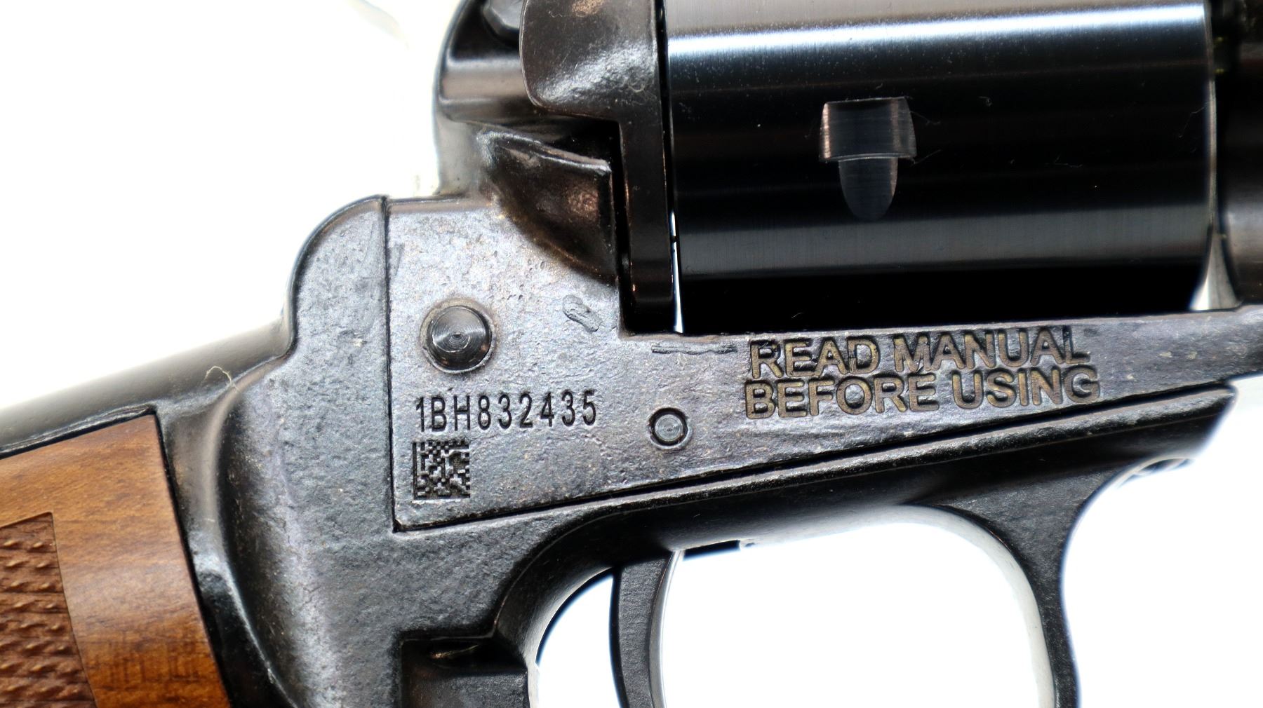 Main Description: Blade front sight, adjustable u notched rear sight, blued barrel and cylinder, black alloy receiver, checkered spur hammer that functions. One piece wood stock, checkered straight grip and black polymer butt plate, finger rest trigger guard, sling swivels with brown leather sling.