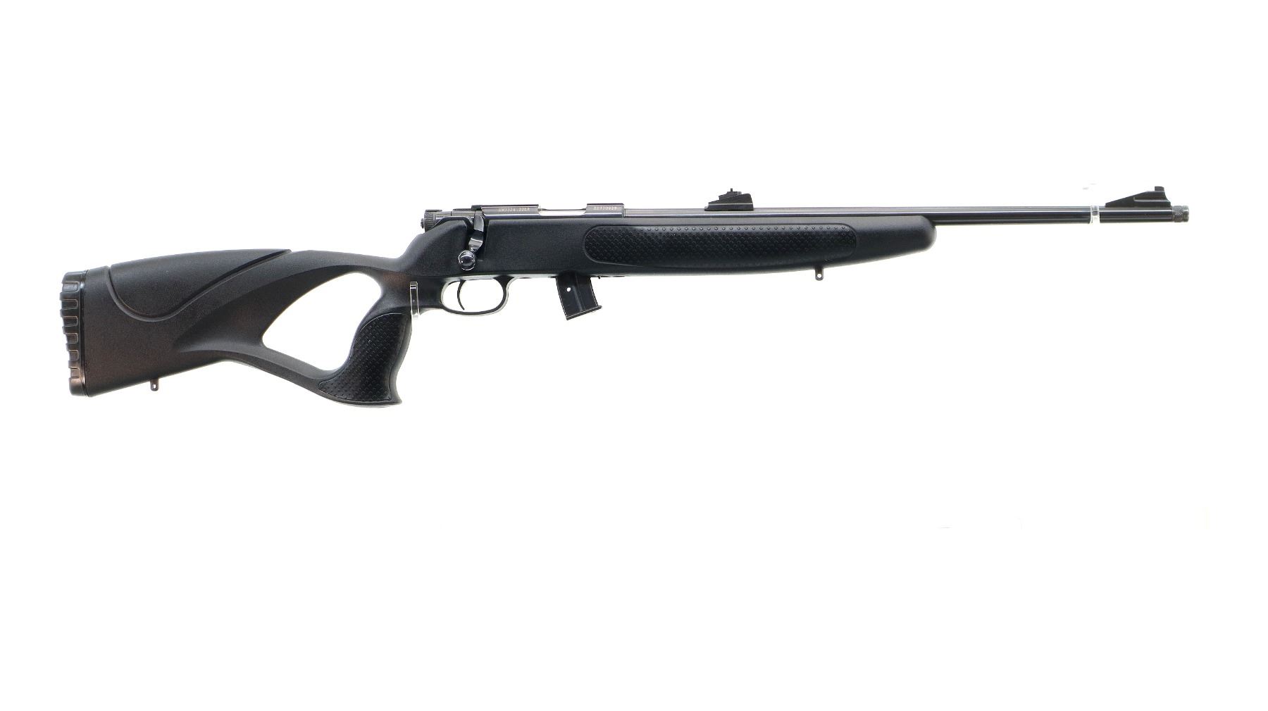 Main Description: Blade front sight with ramp, adjustable u notched rear sight, blued finish, grooved receiver. One piece black synthetic stock, textured forearm and ambi thumb hole pistol grip panels, black rubber recoil pad, swivel studs.